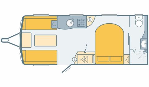 The 580 is a very popular 4 berth single axle caravan with island bed and end washroom. There is parallel seating at the front that will pull out to make a double bed. The kitchen is well equiped with a microwave, fridge with freezer compartment, oven, grill and 4 burner hob one of which is electric. Step through to the bedroom area with island bed which will lift for storage and there is a wardrobe either side of the bed and two overhead lockers. At the rear is the washroom with toilet, washbasin and seperate shower.