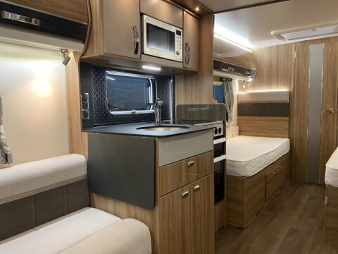 The 565 has parallel seating at the front that will pull out to make a double bed. The kitchen is well equiped with microwave,tall fridge with freezer compartment, oven, grill and 4 burner hob one of which is electric. Step through to the bedroom area with two good size single beds with plenty of storage under the beds and several overhead lockers. At the rear is the washroom with toilet, washbasin and seperate shower.