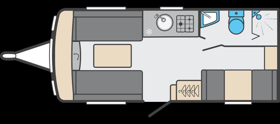 Throughout the interior, the Alpine specification adds premium touches including stylish fabrics, practical storage, and modern lighting. The caravan’s compact size and well designed layout make it easy to tow and manoeuvre while still offering the space and comfort of a full-sized tourer.