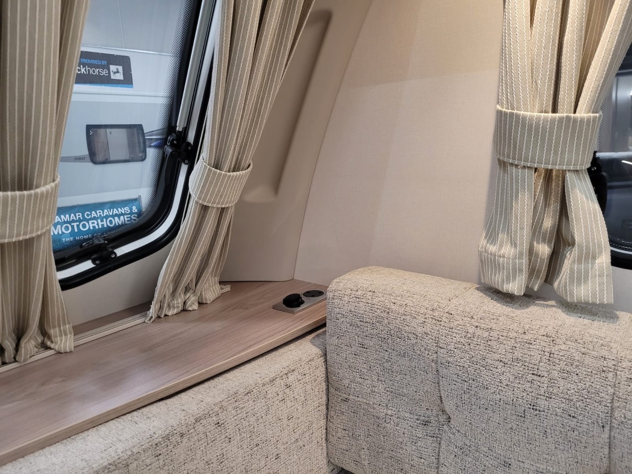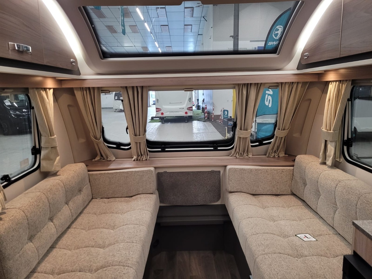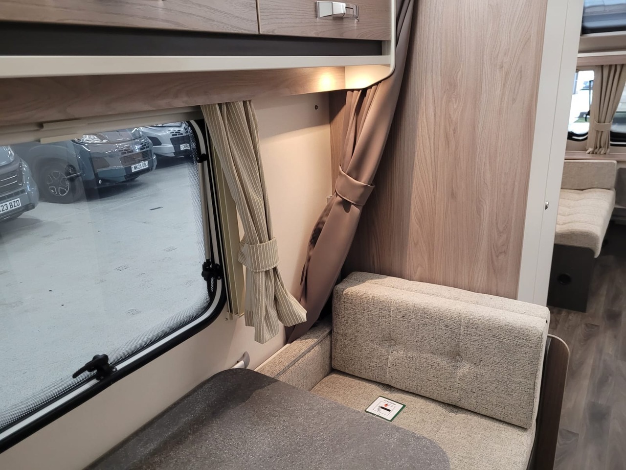 At the front, the lounge features parallel seating with large panoramic windows, providing a bright and welcoming space to relax, dine or simply enjoy the view. By night, the seating converts easily into a comfortable double bed, giving you extra sleeping capacity when needed.