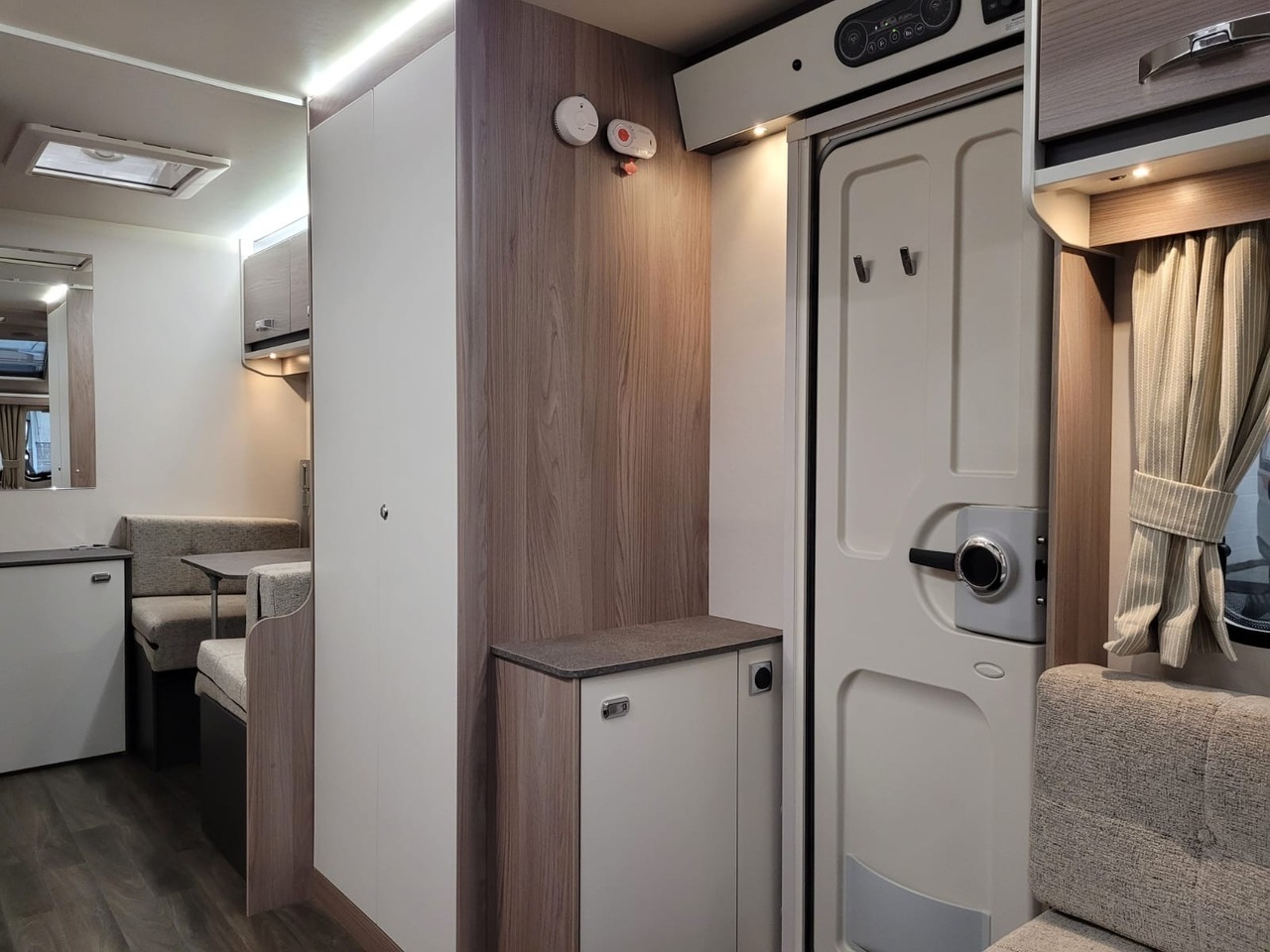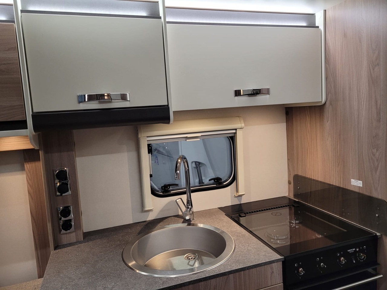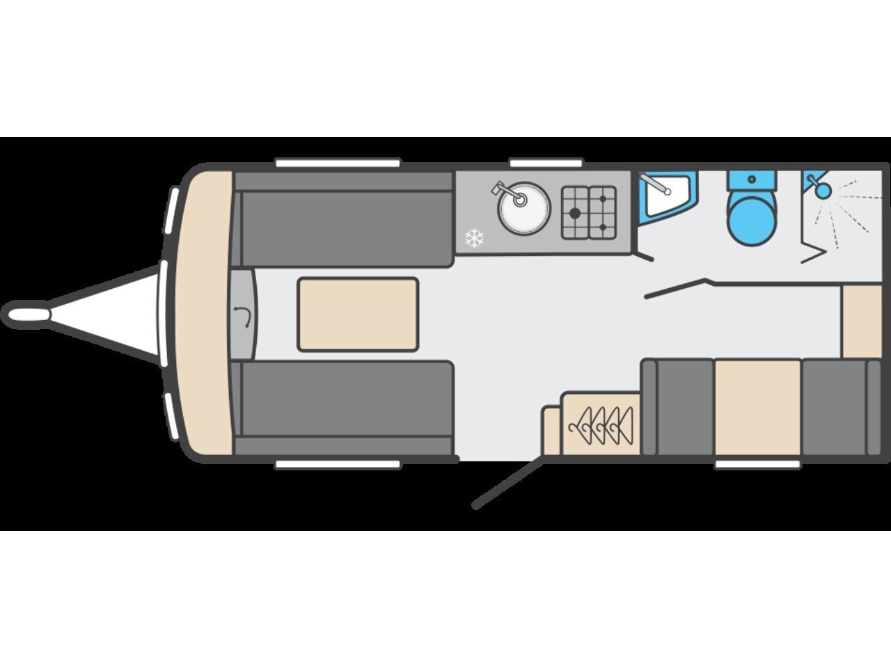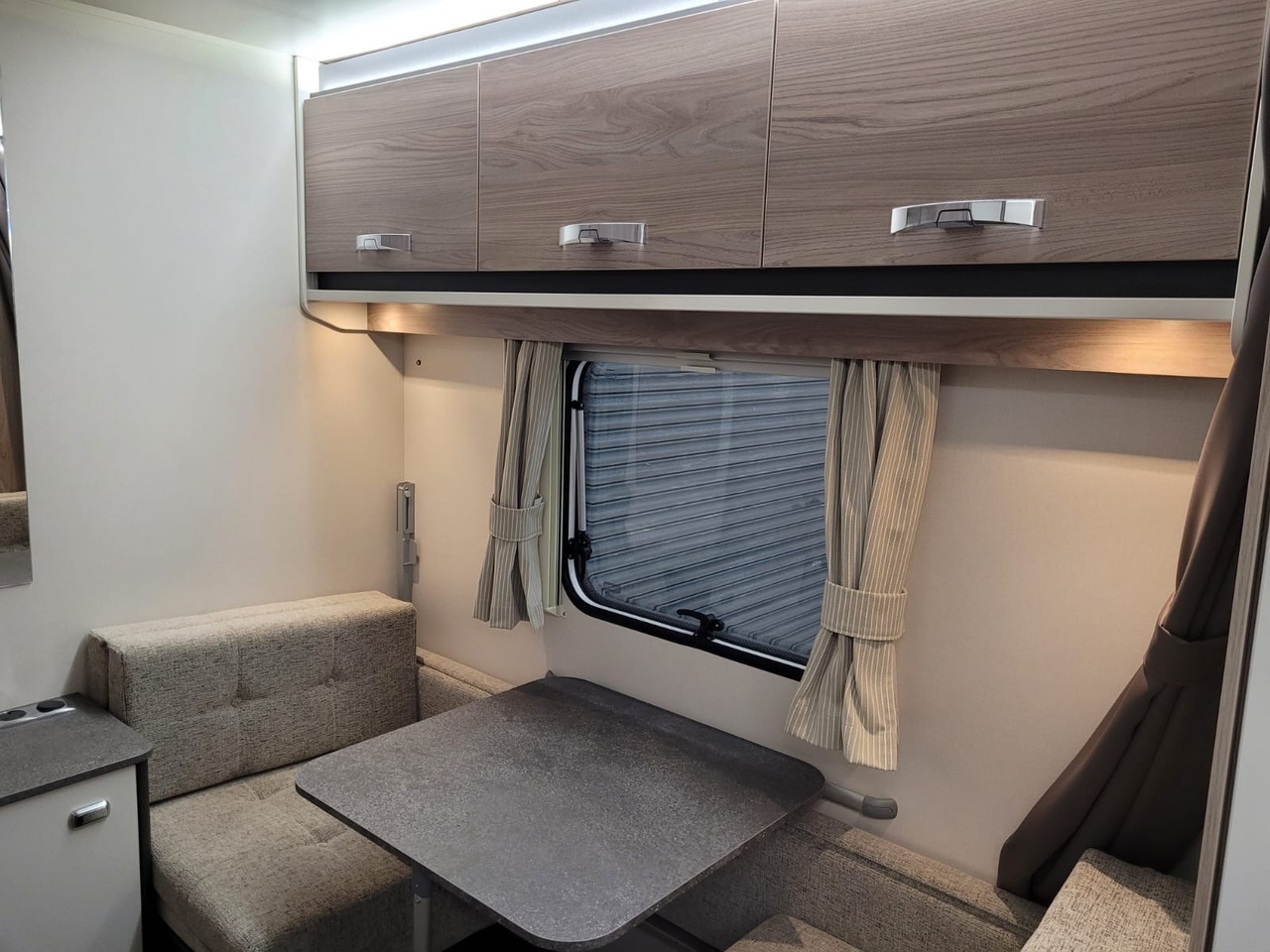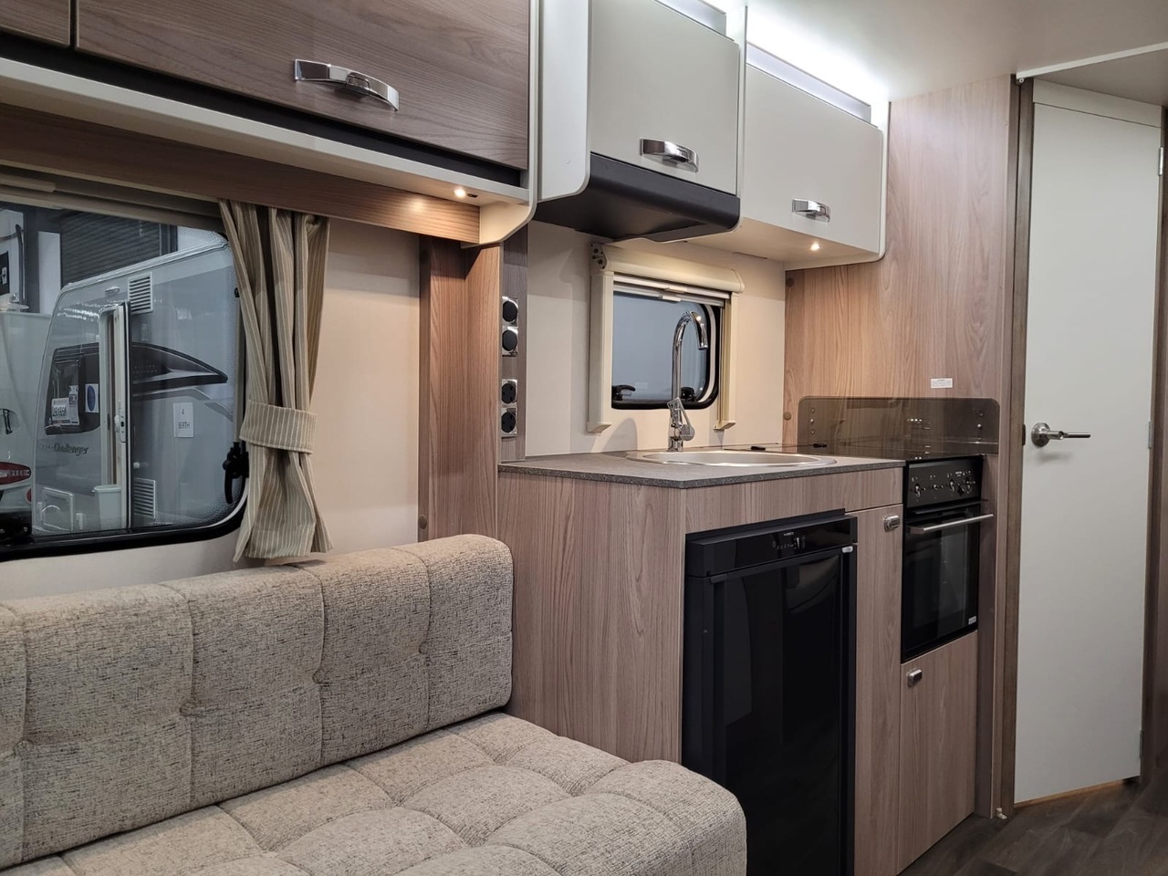 Towards the centre of the caravan, the kitchen is positioned along one side and comes fully equipped for hassle-free cooking. It includes a hob, oven, grill, microwave, fridge with freezer compartment and ample storage for utensils and provisions. Thoughtful work surfaces and lighting make it both practical and enjoyable to use.