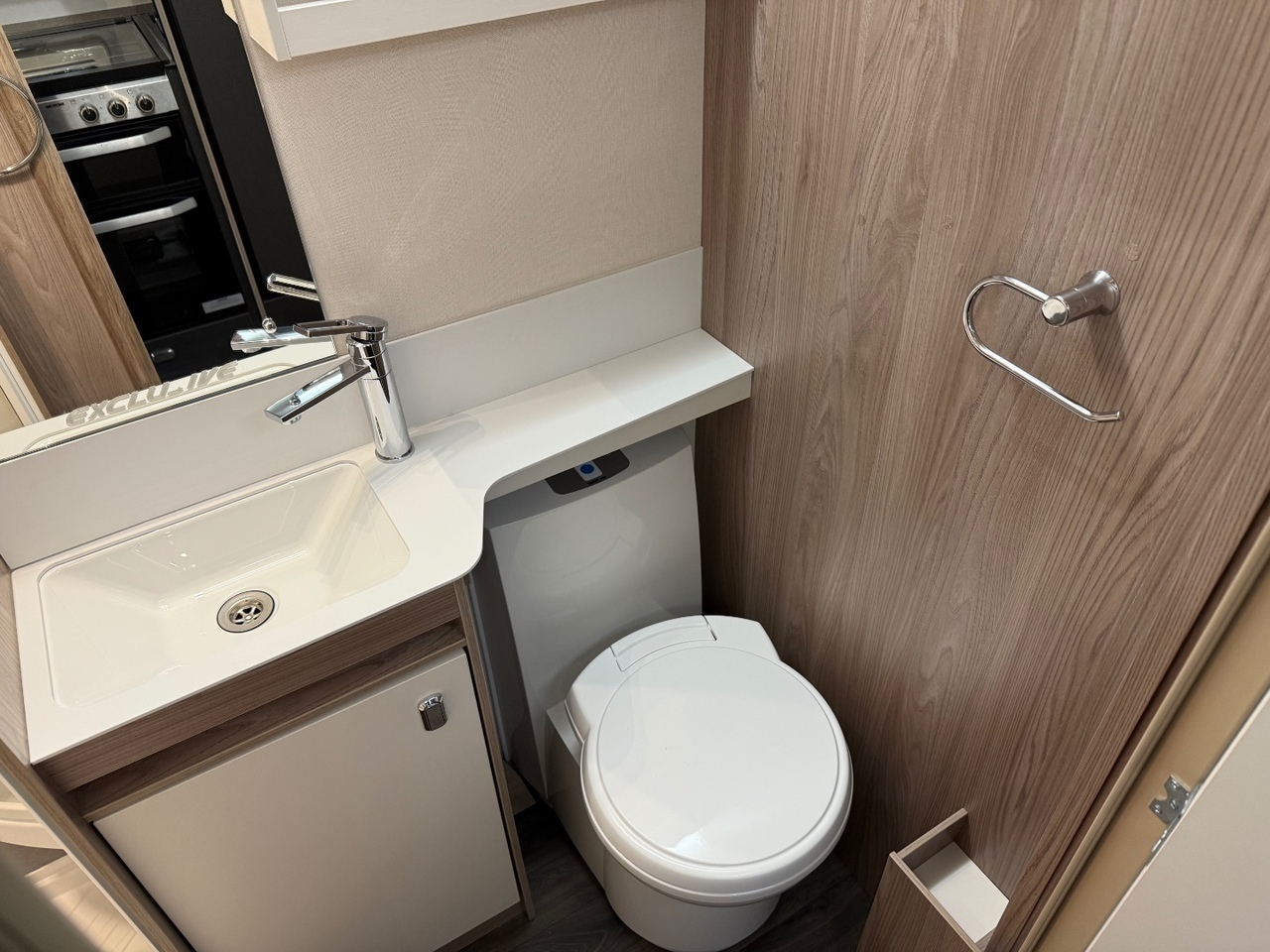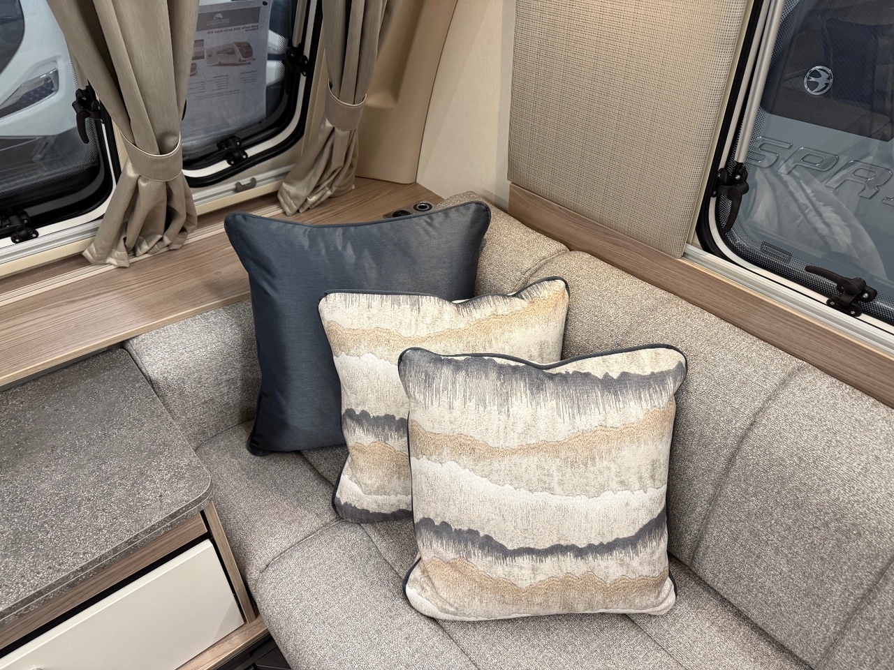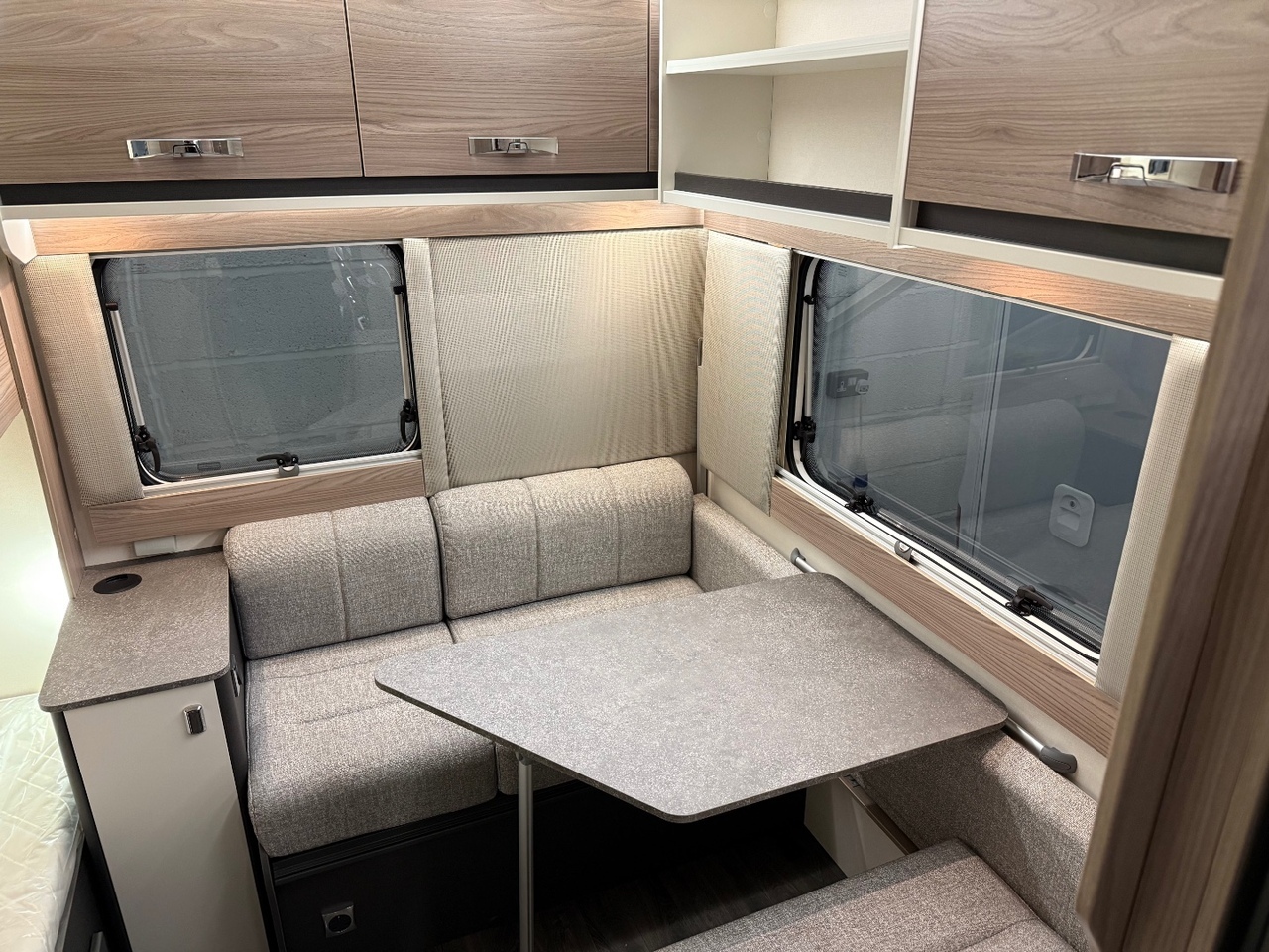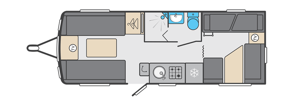 At the front you’ll find a bright and airy lounge with parallel seating, large windows and the Exclusive soft furnishing scheme. This area is perfect for dining or relaxing and converts easily into a generous double bed for added sleeping capacity.
