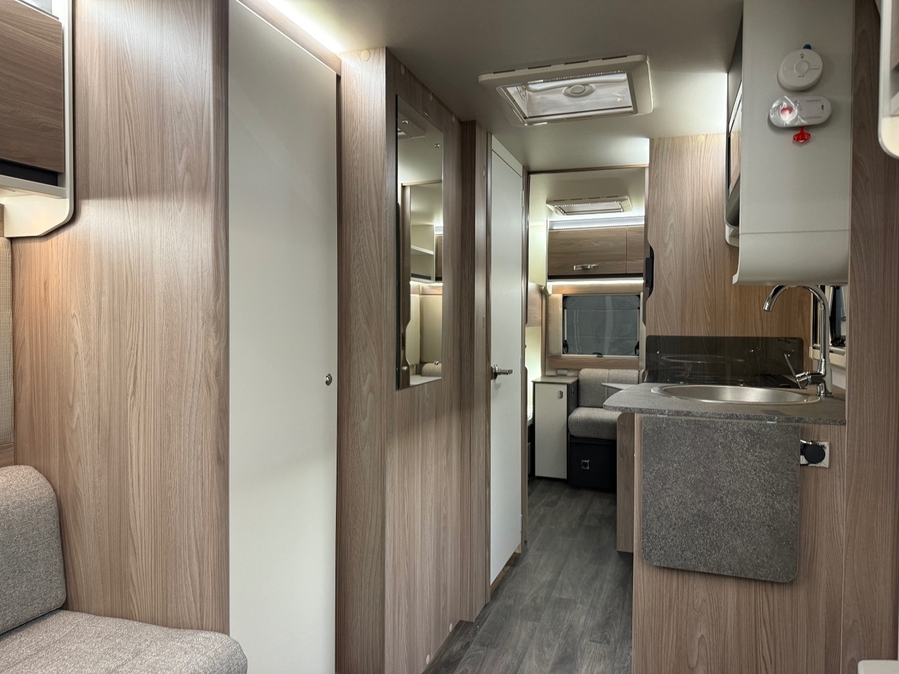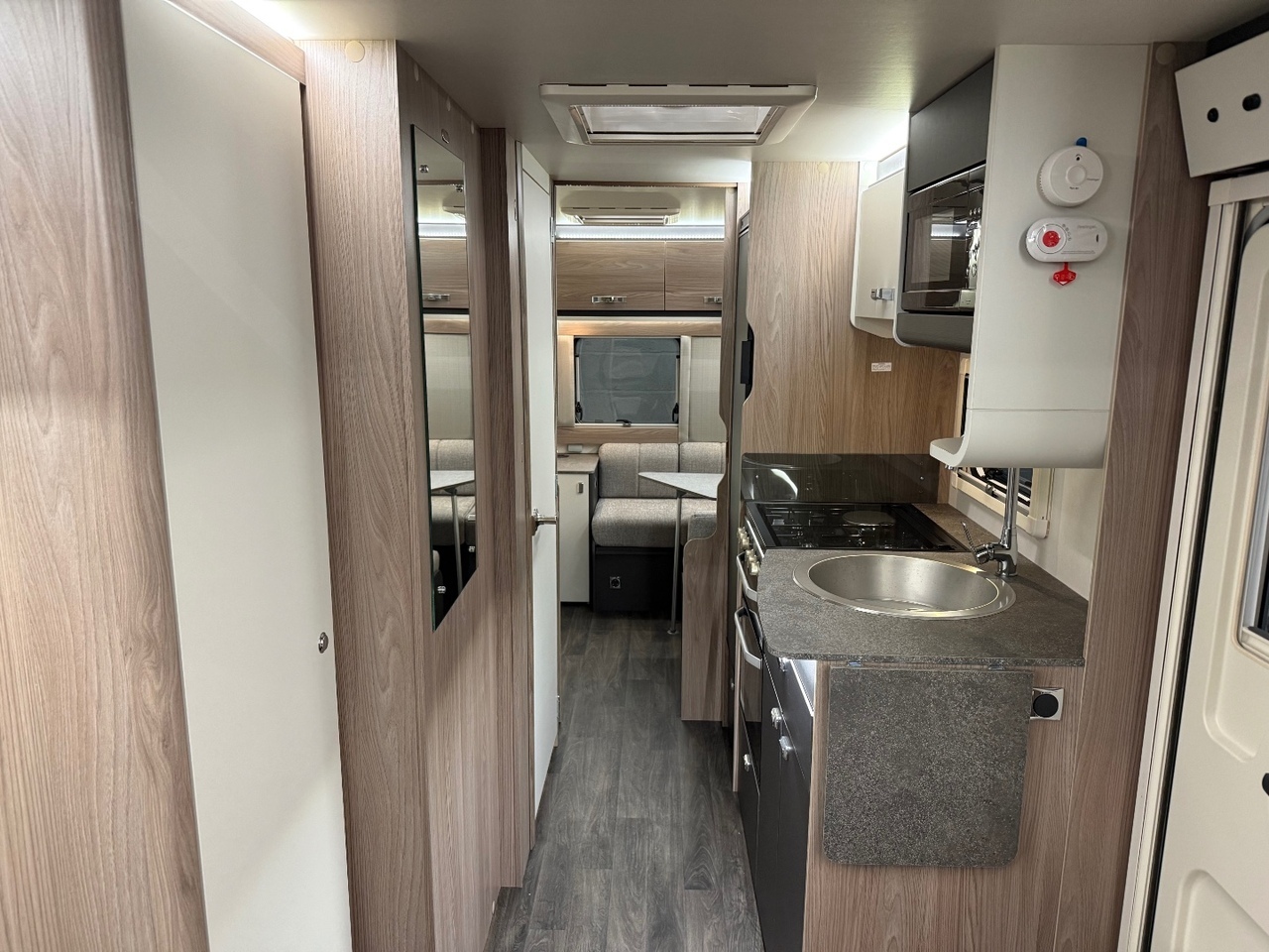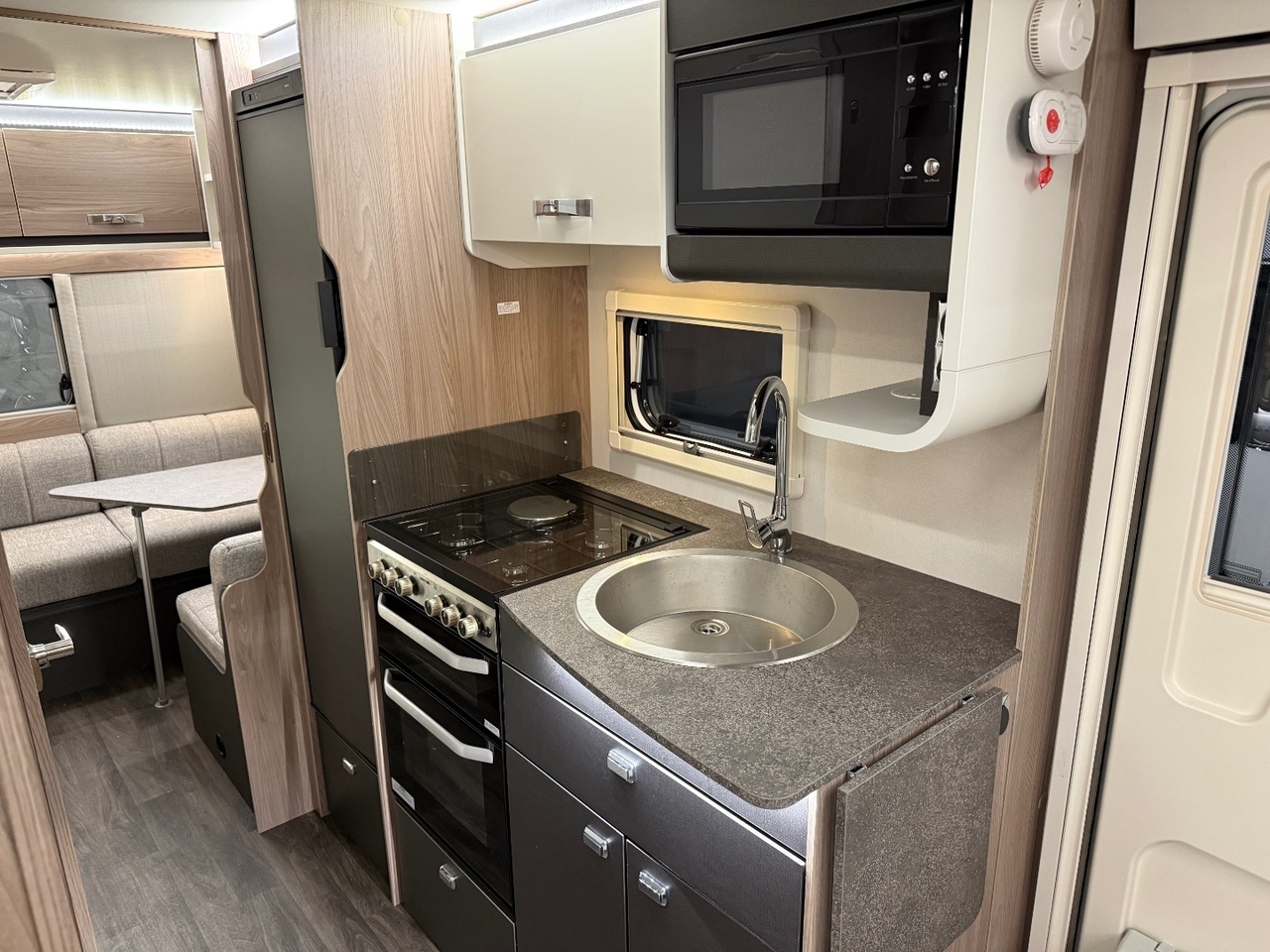 Moving into the centre of the caravan, the well-designed kitchen sits opposite the wardrobe and washroom access. The kitchen is equipped with everything needed for family mealtimes, including a hob, grill, oven, microwave, fridge with freezer compartment and plenty of storage. Atmospheric lighting and upgraded finishes lift the whole space, making it feel warm and contemporary.