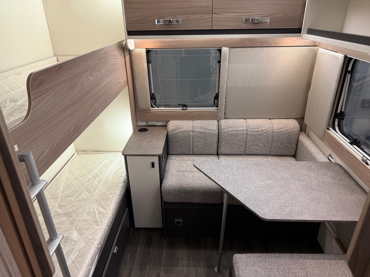 Towards the rear of the 6TD layout is the highly practical family sleeping area. On one side you have fixed bunks, ideal for children, offering comfort and privacy. Opposite the bunks is the convertible rear dinette, providing additional seating during the day and transforming into another double bed at night. This creates a truly flexible space that works perfectly for larger families.