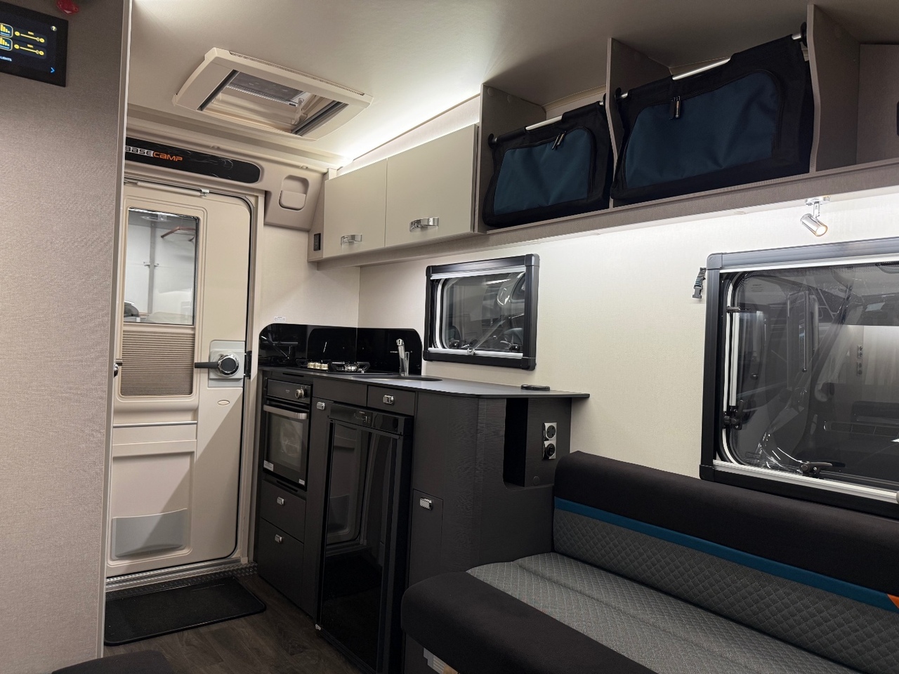At the front, the living area features two comfortable bench seats with a large panoramic opening window that floods the space with natural light. This welcoming lounge is the perfect spot to relax after a day exploring, plan your next adventure, or enjoy a shared meal. In the evening, the seating transforms quickly into a spacious double bed, ensuring a restful night’s sleep so you wake refreshed and ready for anything.