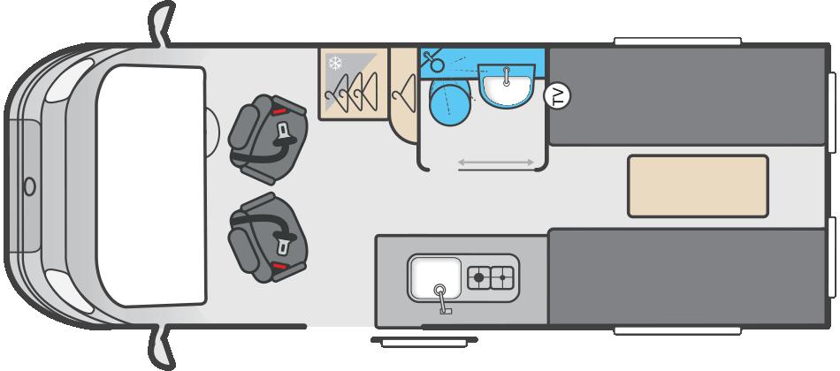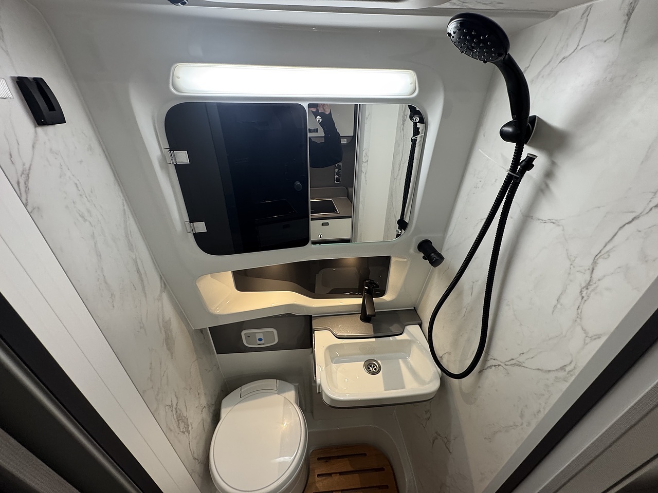 Opposite the kitchen is the neatly designed washroom. This fully equipped wet room includes a shower, toilet and wash basin, giving you complete independence whether you’re touring campsites or venturing off-grid.