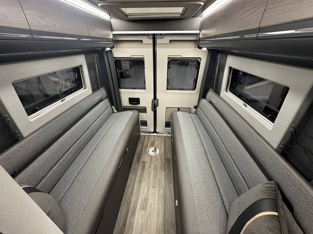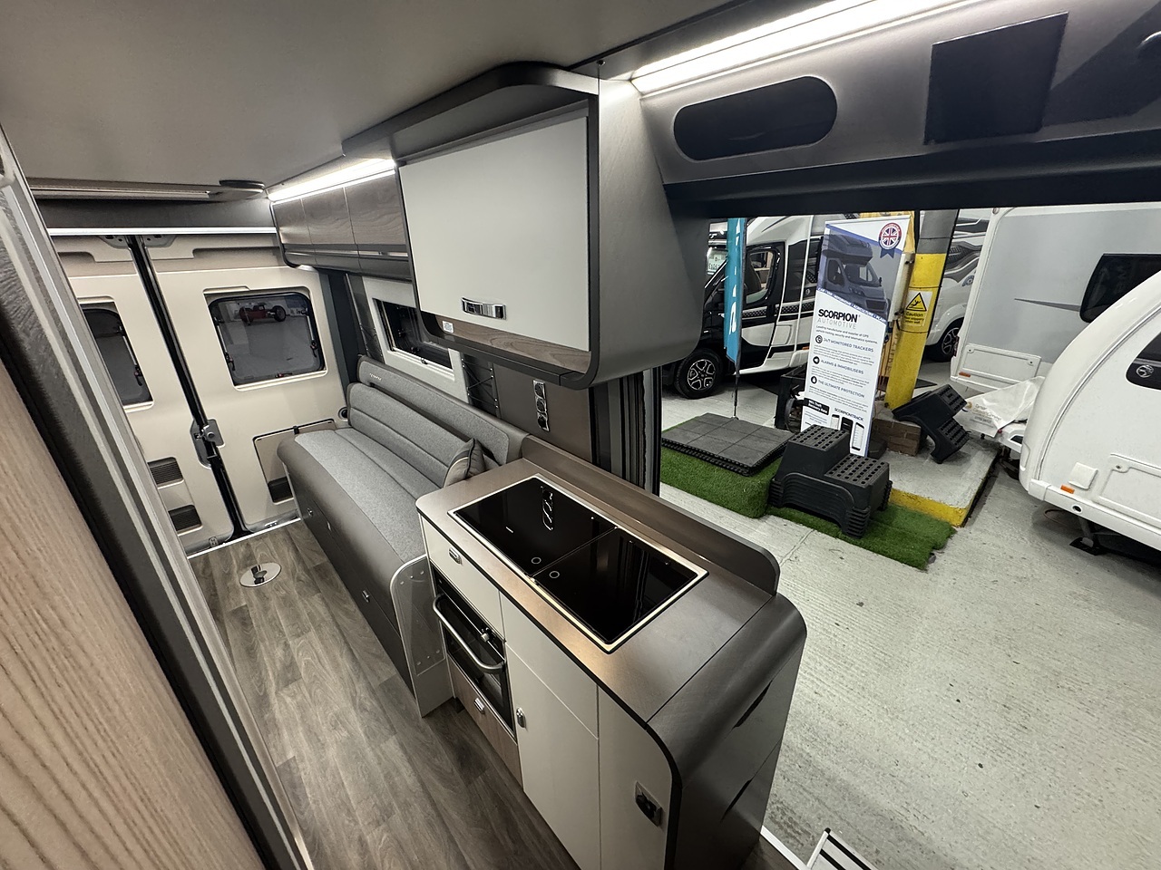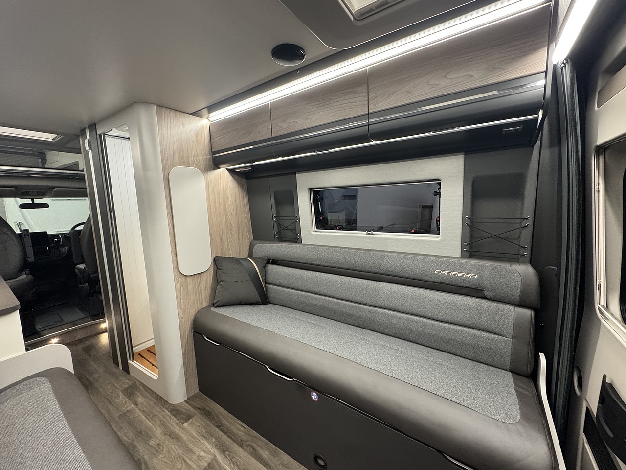 At the rear of the van is the Carrera’s standout feature: a spacious twin-bench lounge. With large windows and modern soft furnishings, it creates a warm and comfortable space for dining, relaxing or entertaining. By night, the benches transform effortlessly into either two single beds or one large double, offering complete flexibility depending on your preference.