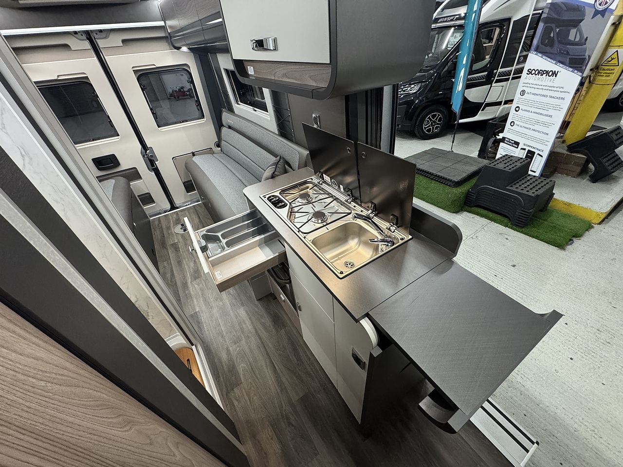 Moving into the habitation area, the Carrera 122 immediately feels bright and open thanks to its thoughtfully designed layout. The mid-positioned kitchen sits just behind the cab and is perfectly arranged for easy cooking on the go. It features a two-burner hob, combination oven/grill, fridge with freezer compartment and stainless-steel sink, along with generous storage for all your essentials.