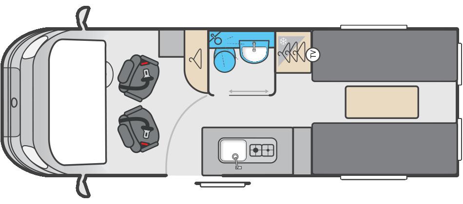 Opposite the kitchen is the neatly designed washroom. This fully equipped wet room includes a shower, toilet and wash basin, giving you complete independence whether you’re touring campsites or venturing off-grid.