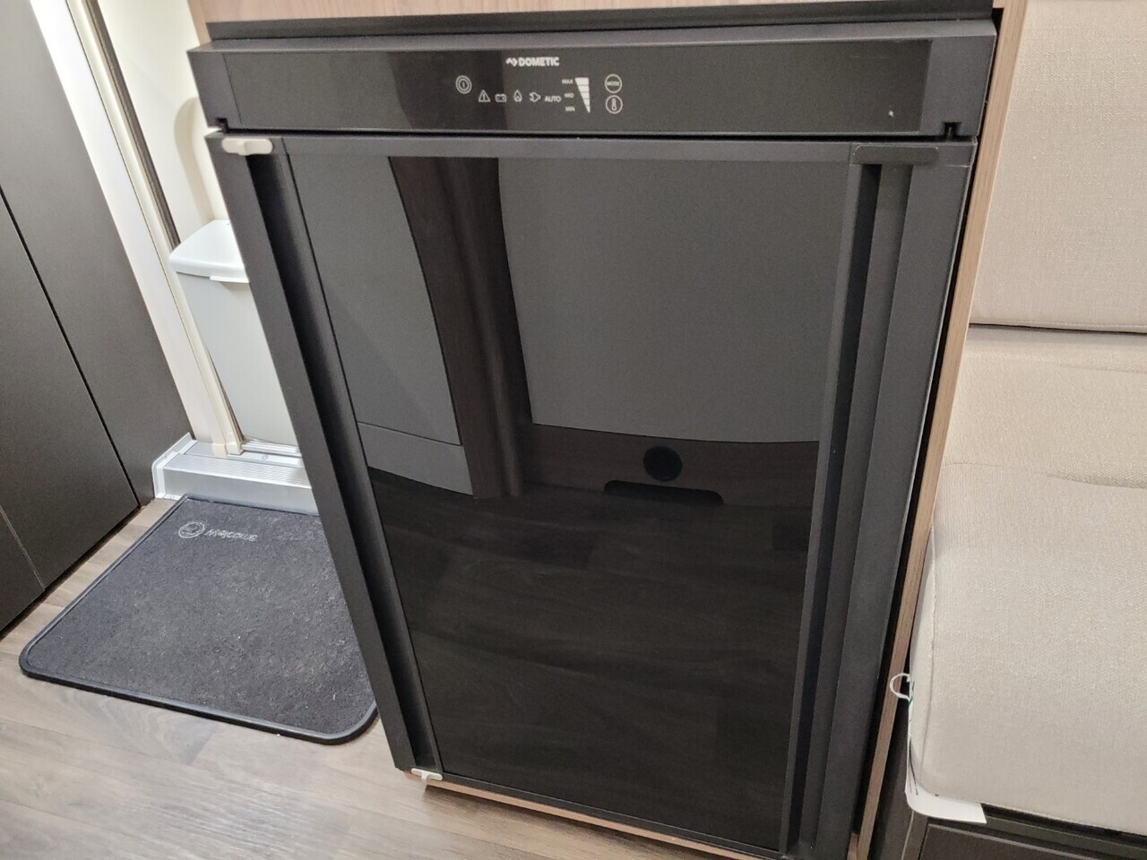 In the centre is the well-designed kitchen, fully equipped with everything you need for home-style cooking. You’ll find the upgraded oven with cast-iron frets and light, a sleek hob, integrated microwave, fridge with freezer compartment, and ample storage for utensils and ingredients. Thoughtful lighting and modern finishes give the kitchen a premium feel.