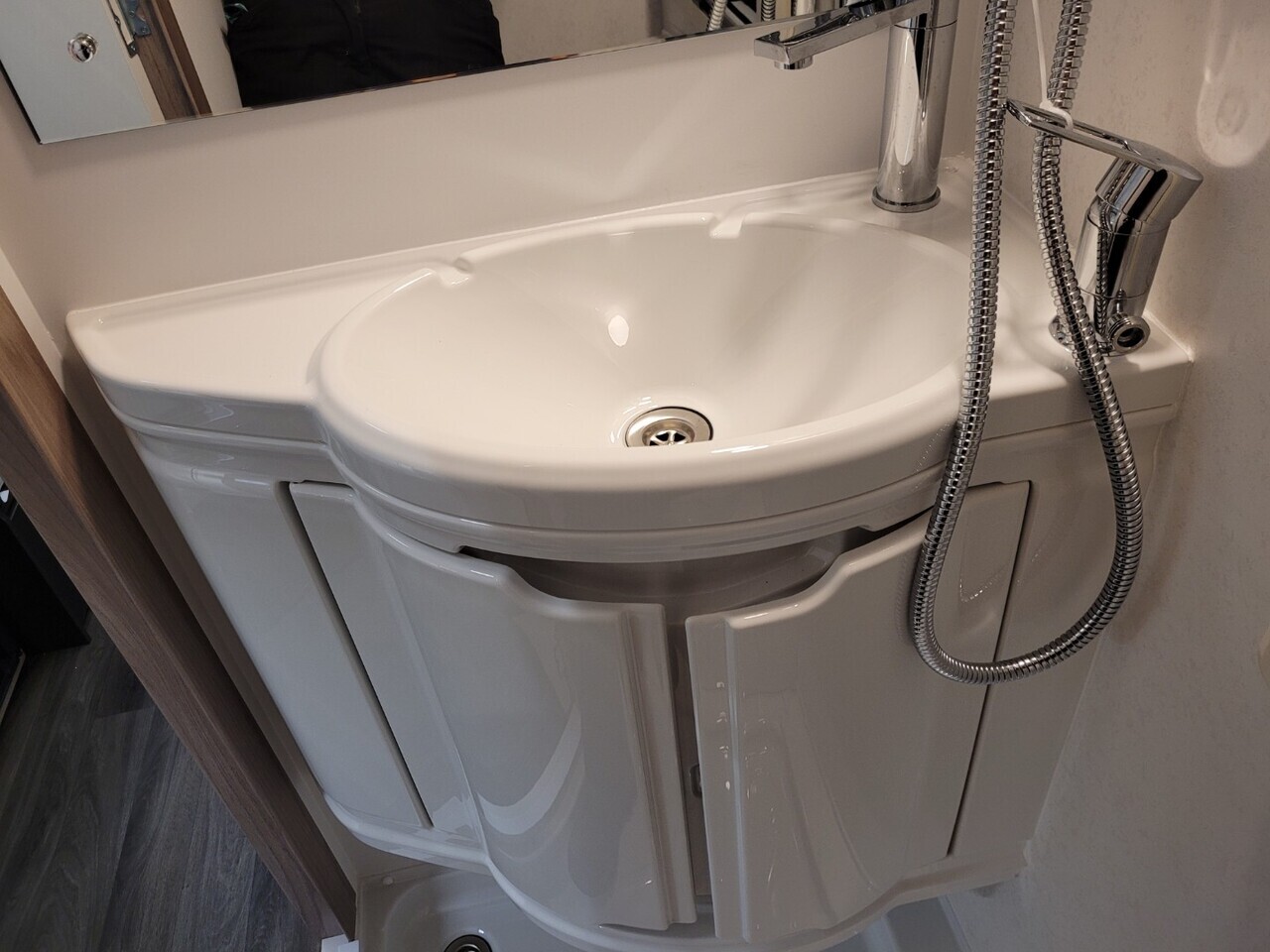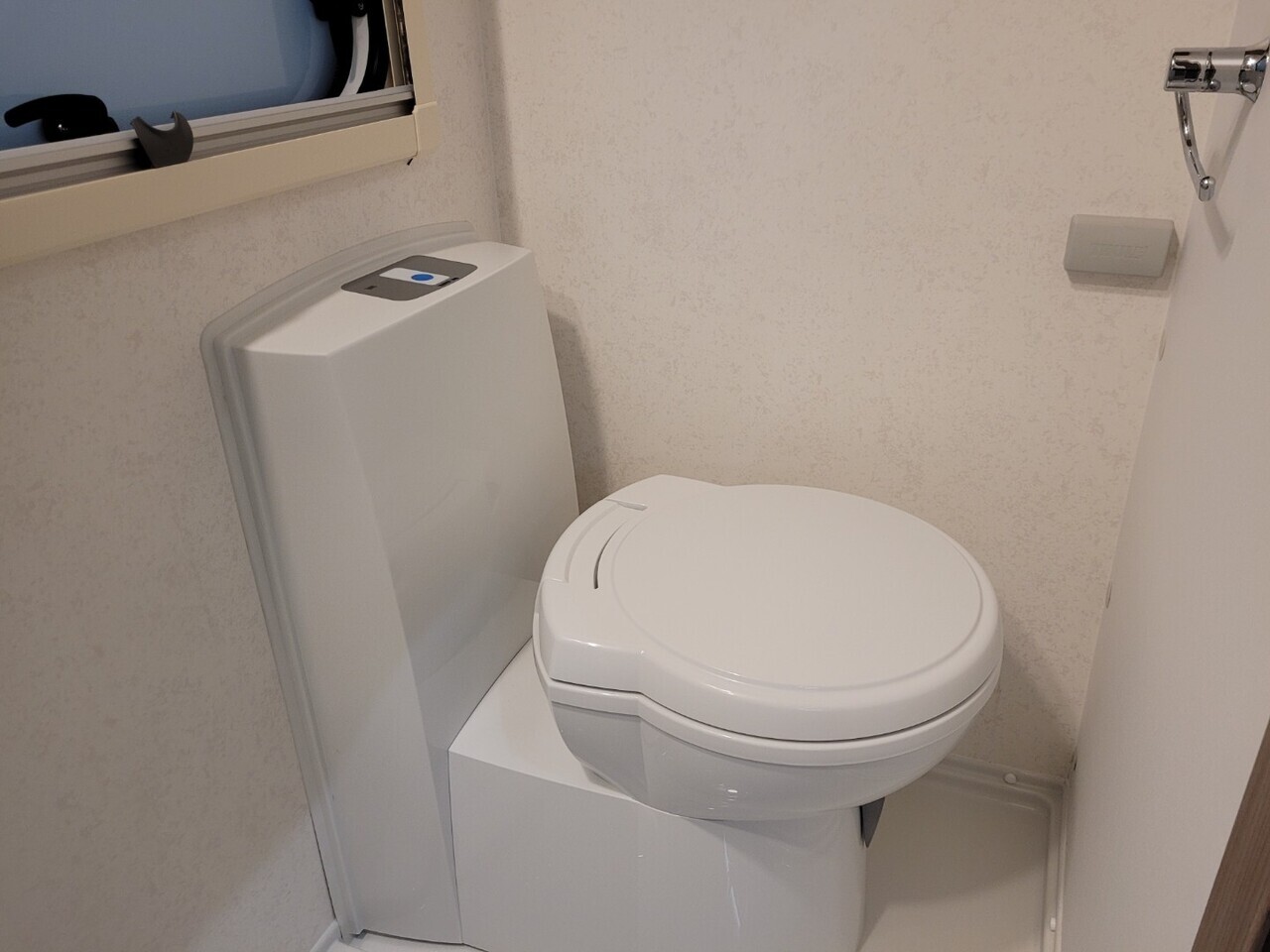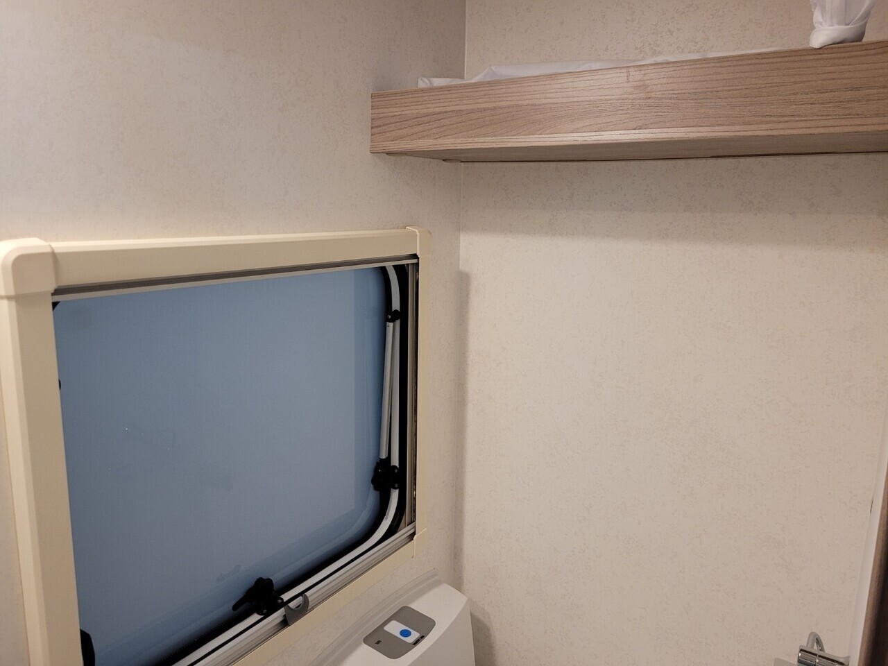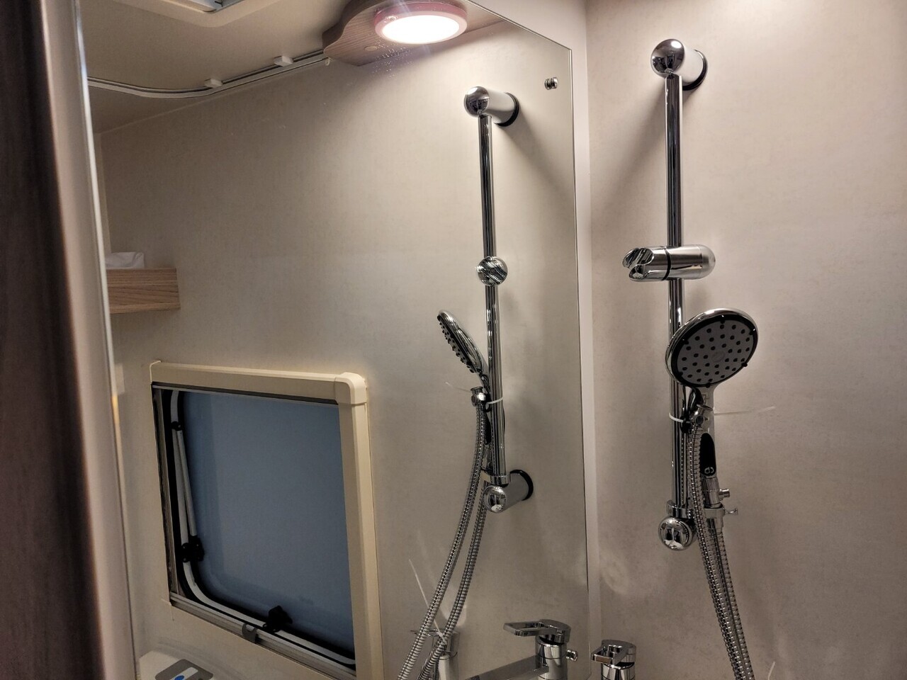 To the rear is the washroom, impressively spacious for a caravan of this size. It features a dedicated shower cubicle, toilet, wash basin, vanity storage and modern fittings throughout—providing convenience and comfort whether touring long weekends or extended holidays.