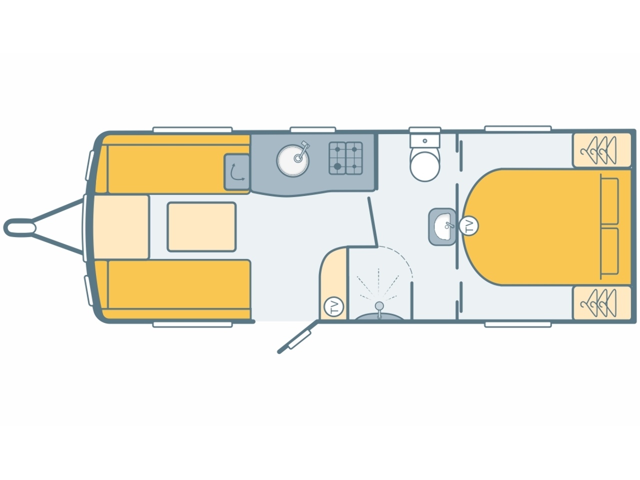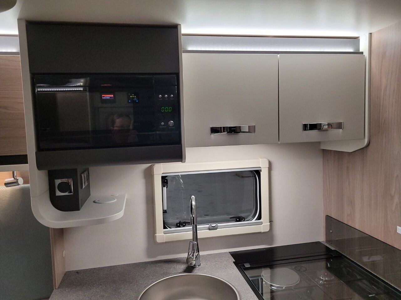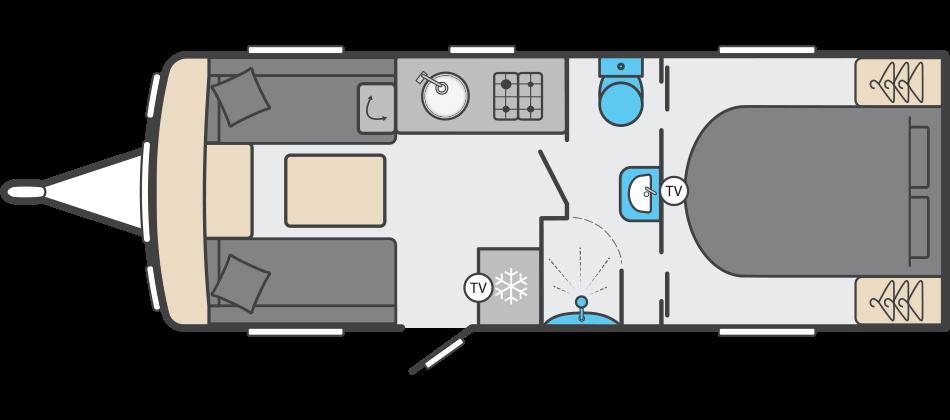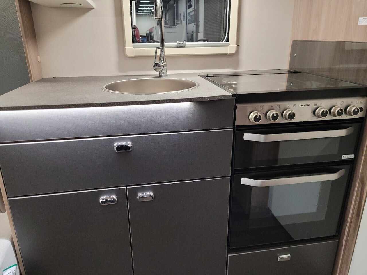 In the centre of the caravan, you’ll find a modern, fully equipped kitchen complete with a microwave, oven and grill, three burner gas hob, sink, and a fridge with freezer compartment. There’s generous worktop space and clever storage throughout, ensuring everything you need is within easy reach for cooking on the go.