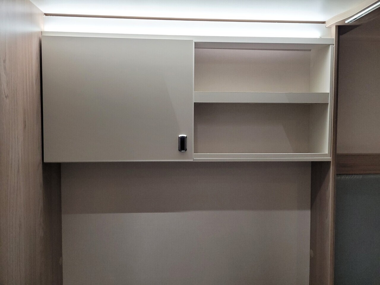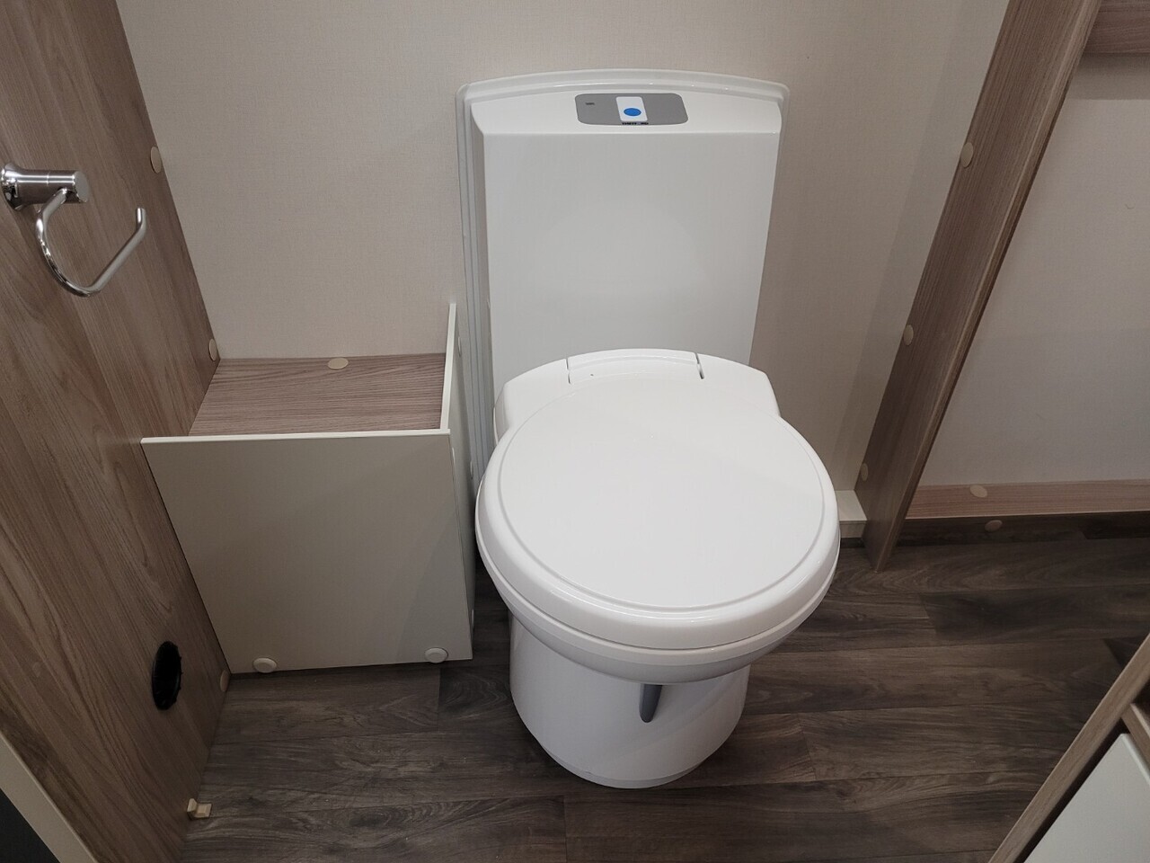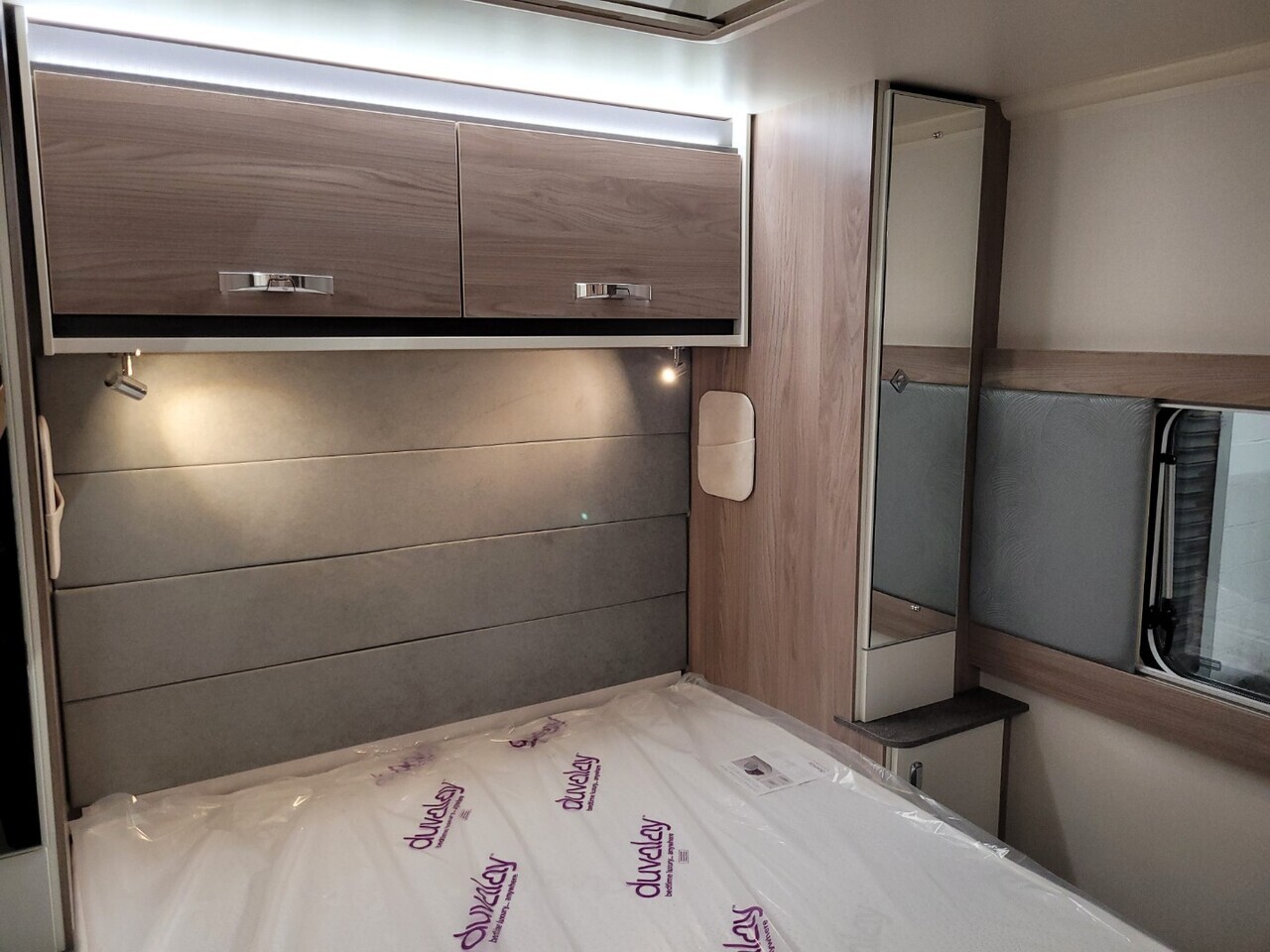 Towards the rear, the 560 layout offers a comfortable fixed island bed with a luxurious Duvalay mattress, providing a restful night’s sleep. The bed lifts to reveal additional storage space, while overhead lockers and wardrobes on either side ensure ample room for your belongings.