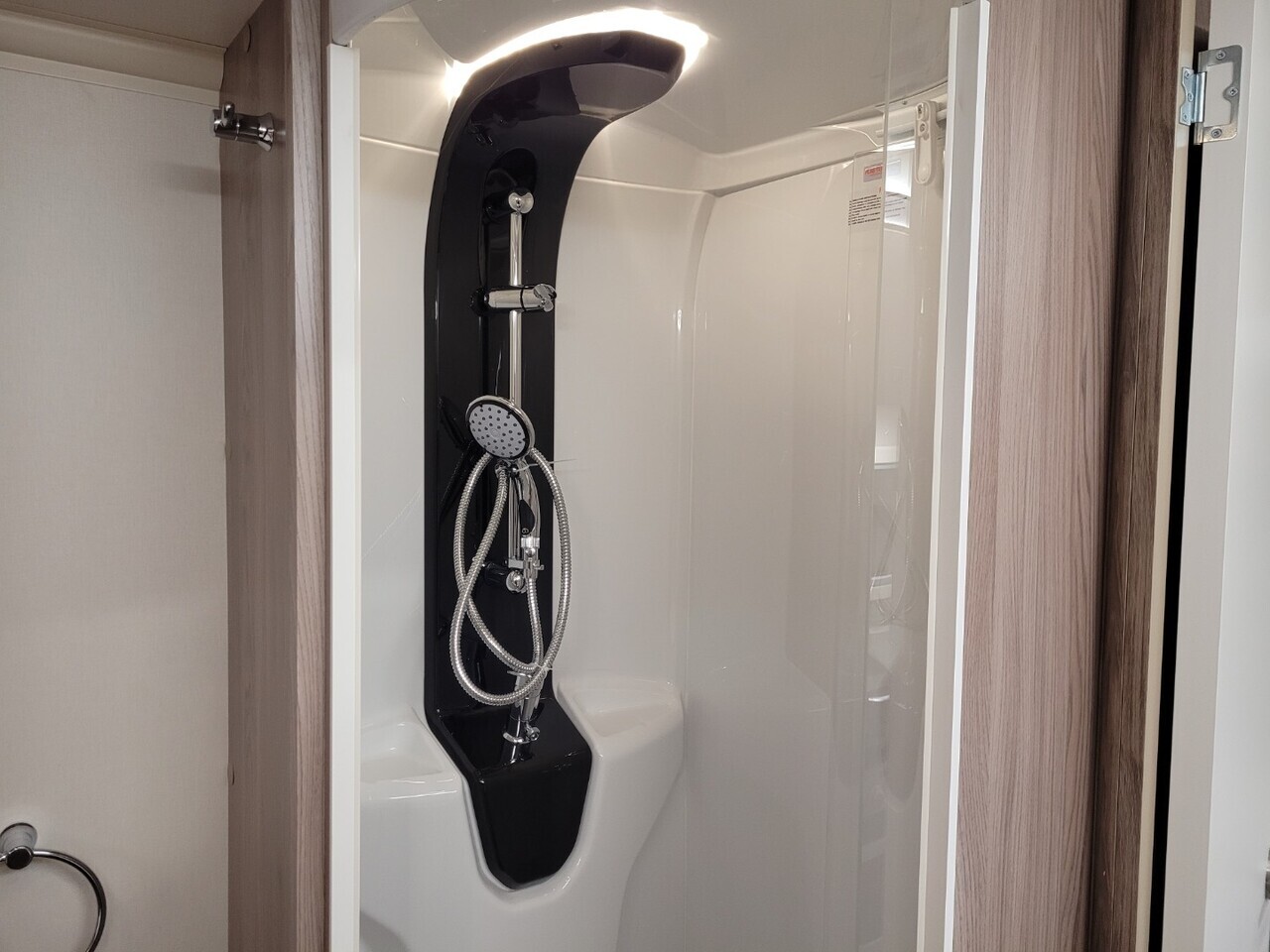 At the very back, you’ll find the well-appointed washroom with a toilet, wash basin and separate walk-in shower, creating a private and practical space that feels just like home.