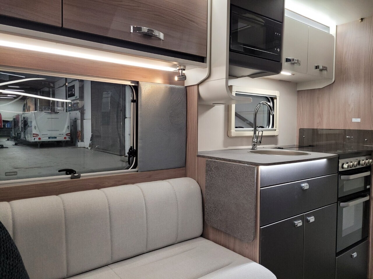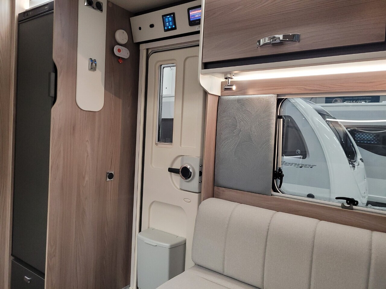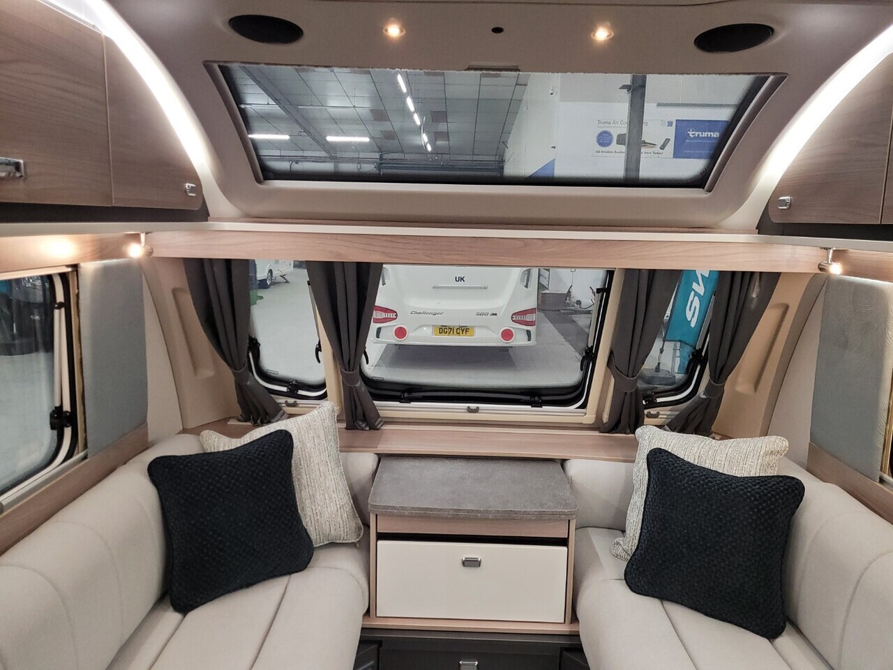 At the front, the Challenger 560 welcomes you with a bright and spacious lounge area featuring parallel seating and a large panoramic front window that allows natural light to flood the space. The lounge offers a relaxing place to unwind during the day and easily converts into a large double bed for night-time use.