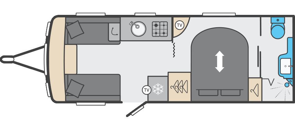 In the centre of the caravan, you’ll find a well-equipped kitchen featuring everything you need to cook your favourite meals on the road. This includes a microwave, oven and grill, three burner gas hob, sink, and a fridge with freezer compartment. There’s also plenty of storage space for utensils and ingredients, all finished to Swift’s exceptional standard.