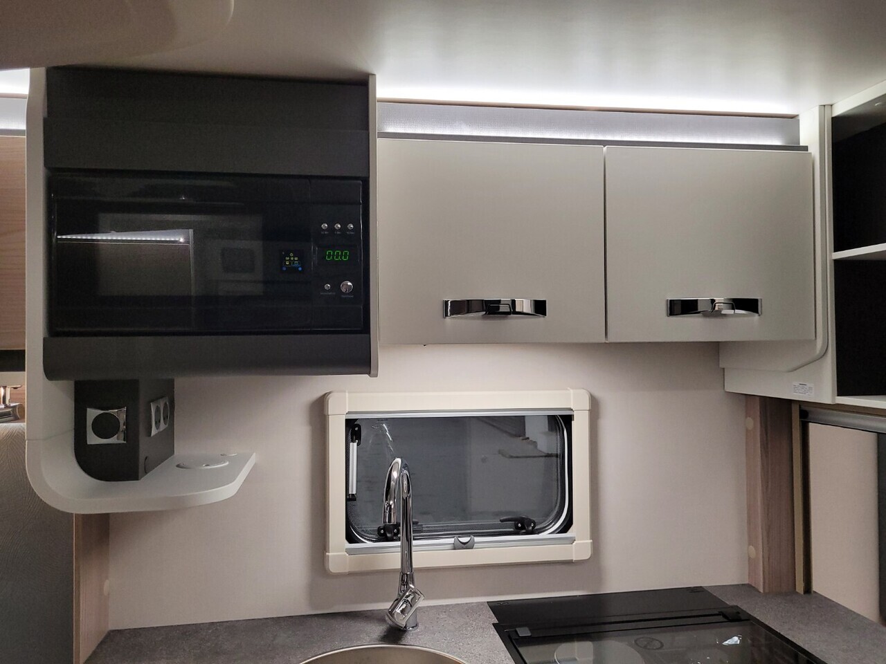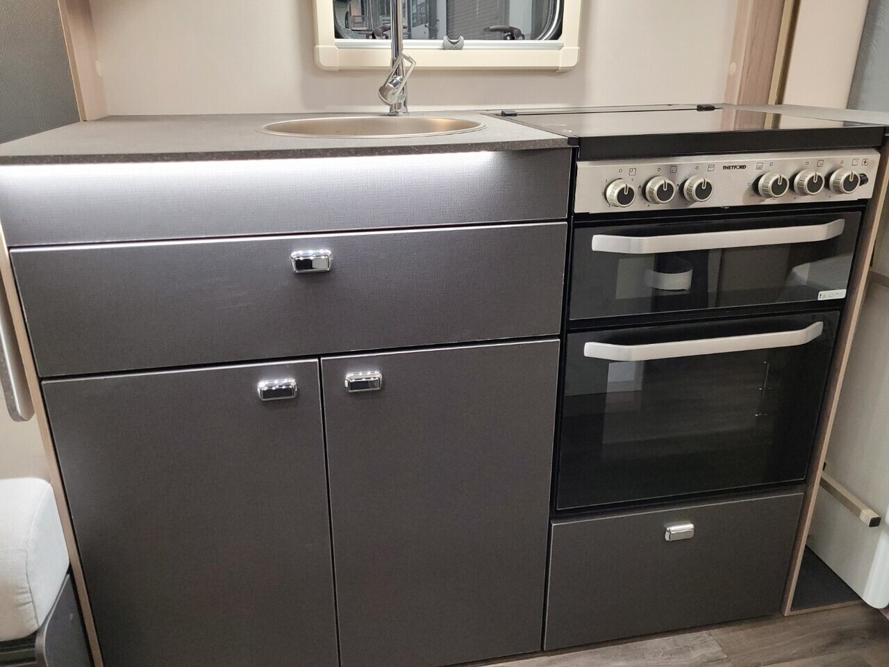At the front, you’re welcomed by a bright and spacious lounge area with parallel seating and a large panoramic front window that fills the space with natural light. The lounge creates a perfect area to relax during the day and easily converts into a large double bed at night, offering flexibility and comfort.