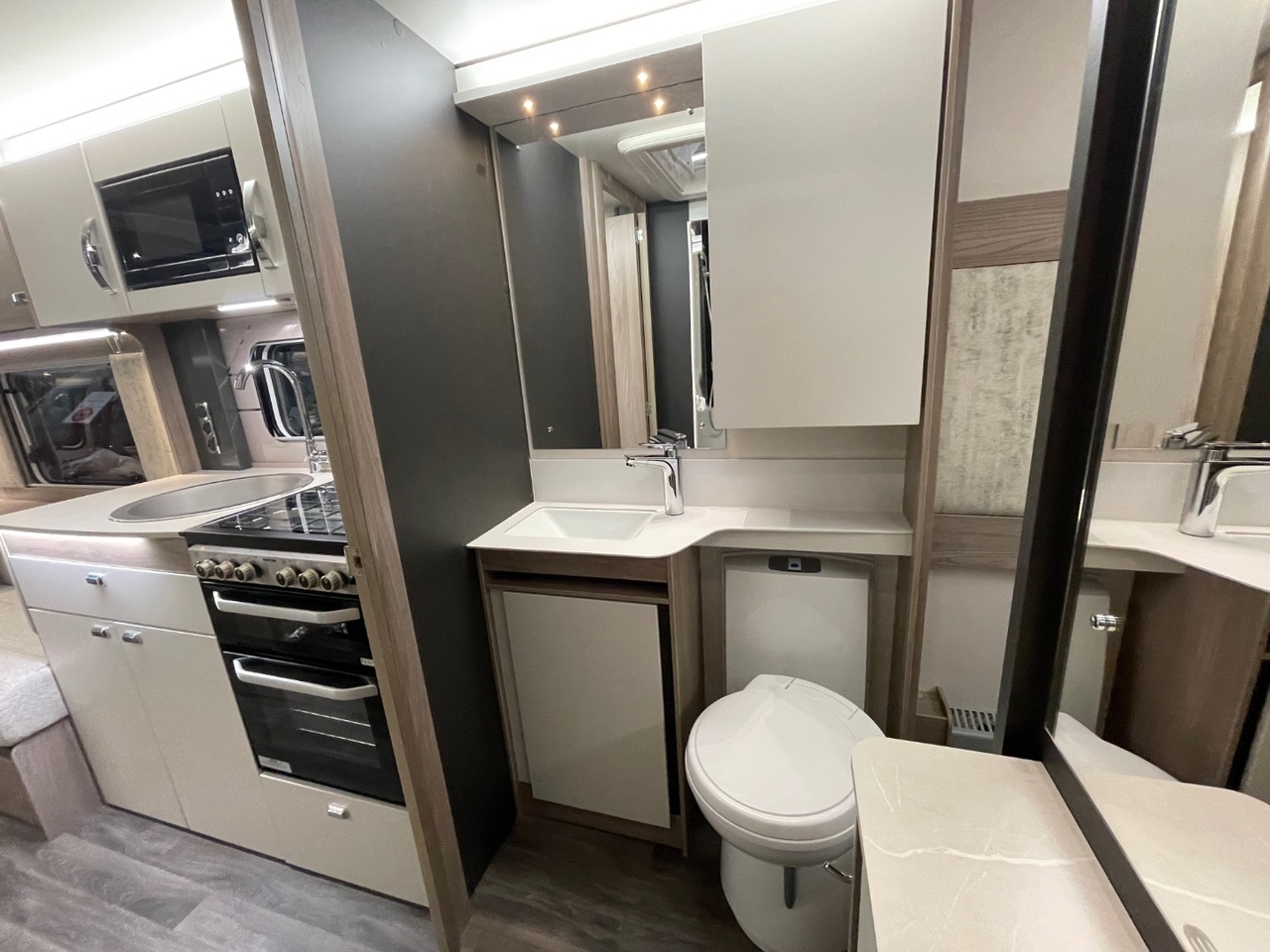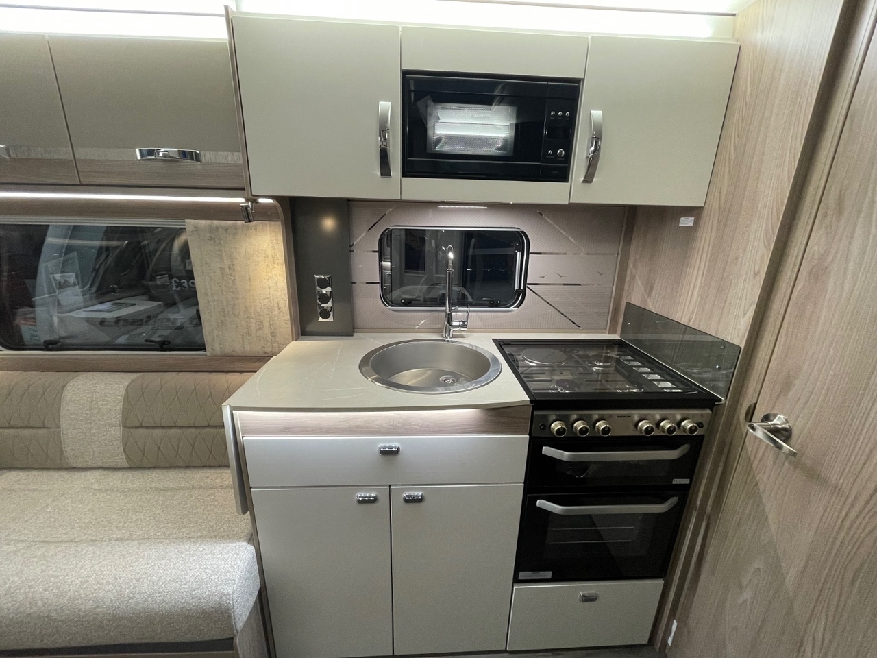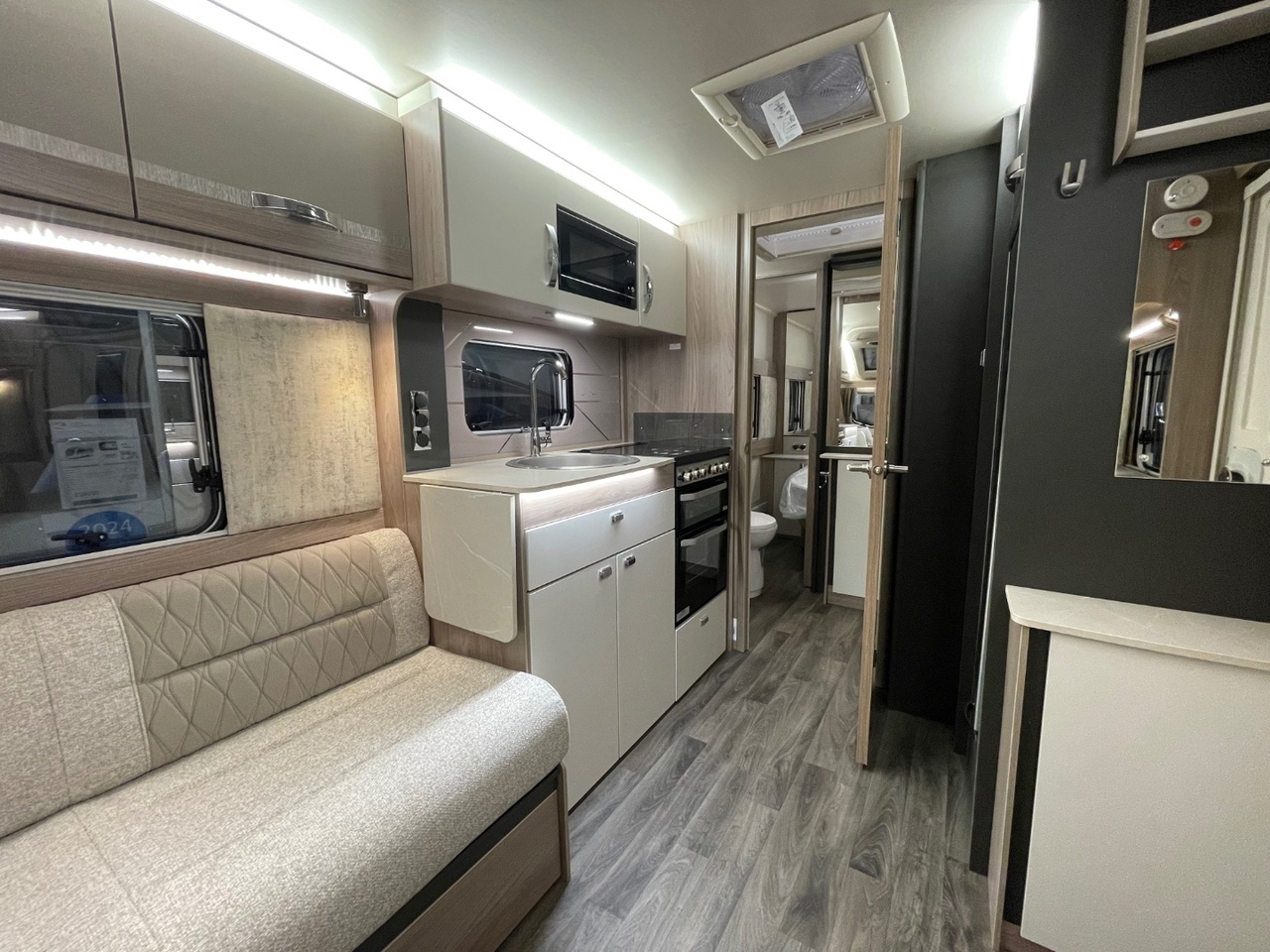 In the centre of the caravan, you’ll find a well equipped kitchen designed with practicality and elegance in mind. It features an upgraded oven with cast iron frets and light, a three burner gas hob, microwave, fridge with freezer compartment, and ample worktop space for meal preparation. Thoughtful storage solutions ensure everything you need is right at hand.