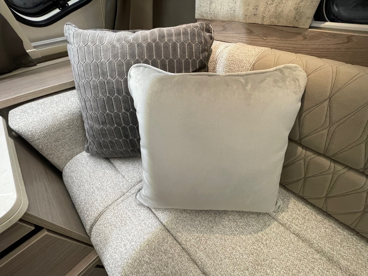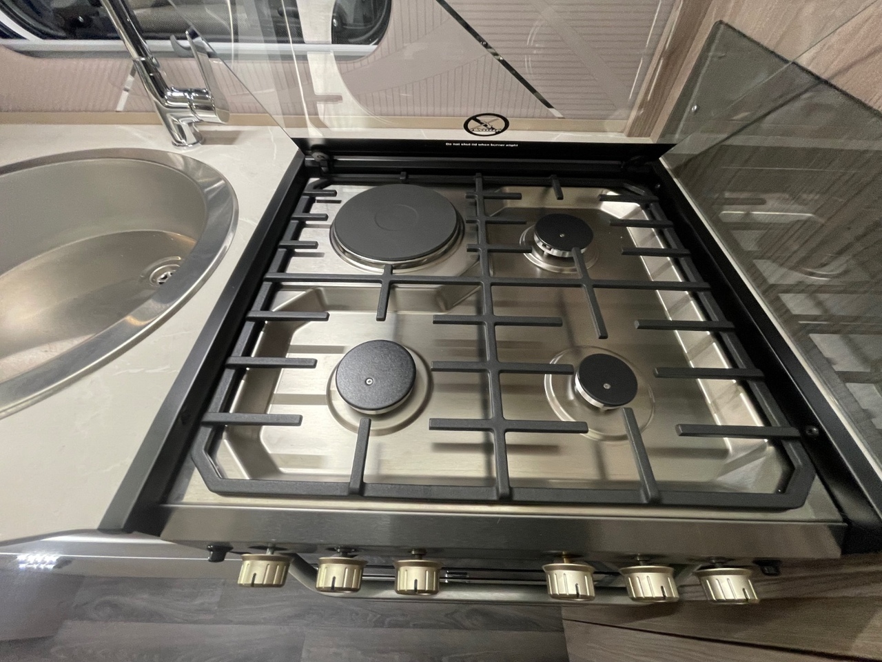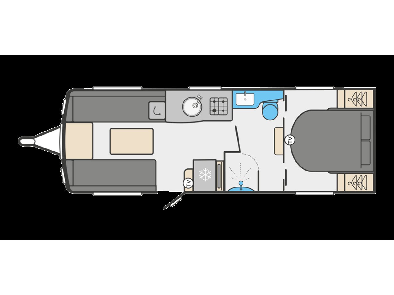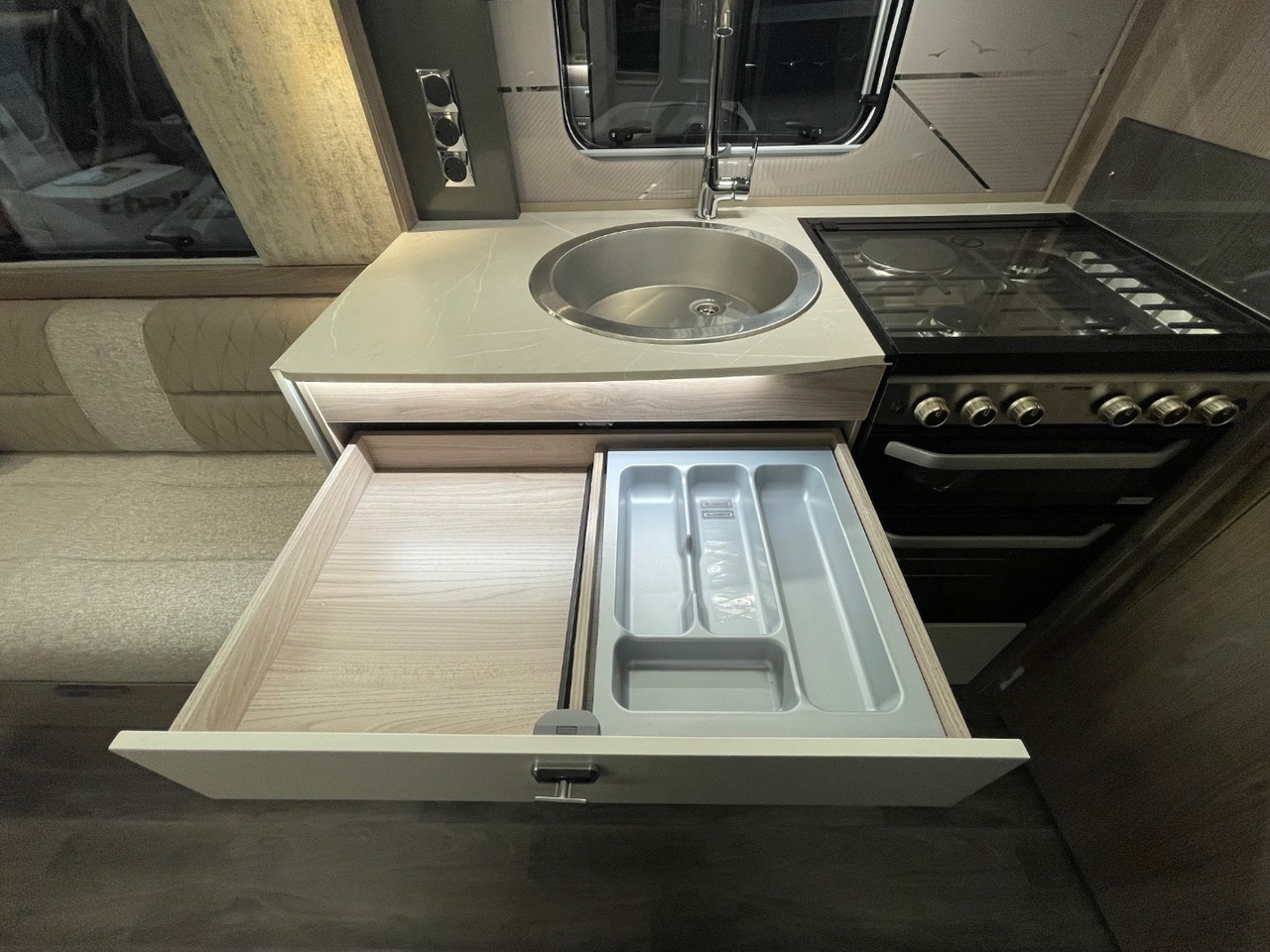 In the centre of the caravan, you’ll find a well equipped kitchen designed with practicality and elegance in mind. It features an upgraded oven with cast iron frets and light, a three burner gas hob, microwave, fridge with freezer compartment, and ample worktop space for meal preparation. Thoughtful storage solutions ensure everything you need is right at hand.