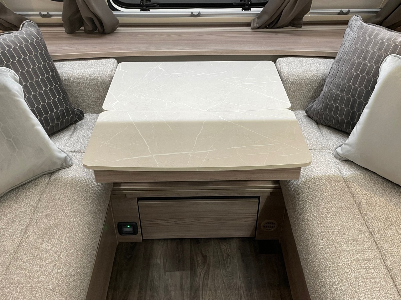 At the front of the Challenger Exclusive 650 is a spacious and beautifully appointed lounge area with parallel seating. The large panoramic front window floods the space with natural light, creating a bright and welcoming atmosphere. The front seats can be used as two singles or easily convert into a large double bed, ideal for guests or relaxing evenings.