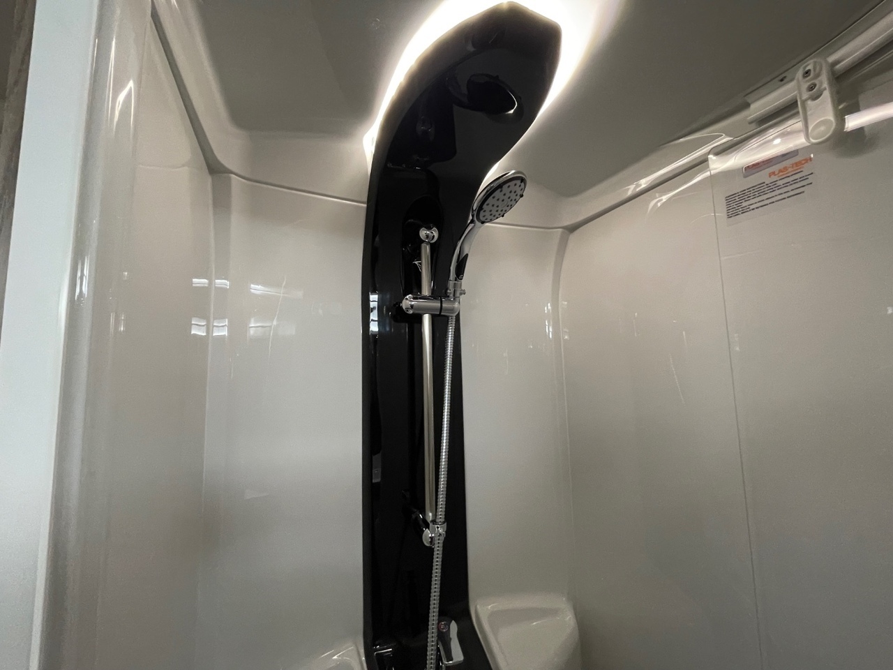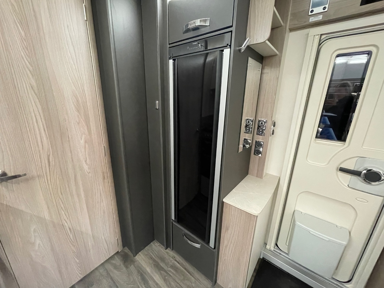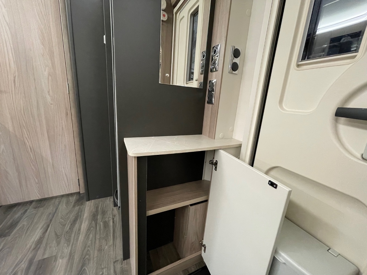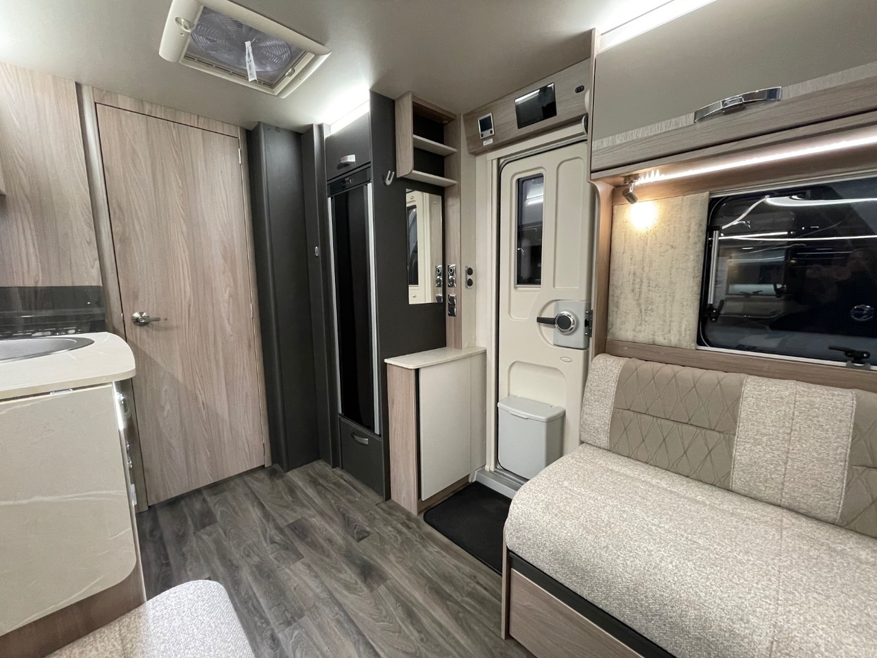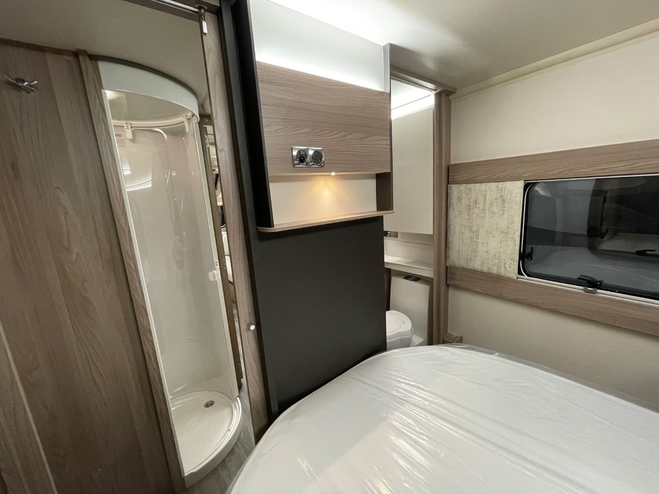 At the back of the caravan is the spacious washroom, featuring a separate shower cubicle, toilet, and washbasin. The modern finishes and stylish lighting add a boutique feel, ensuring every day on tour starts and ends in comfort.