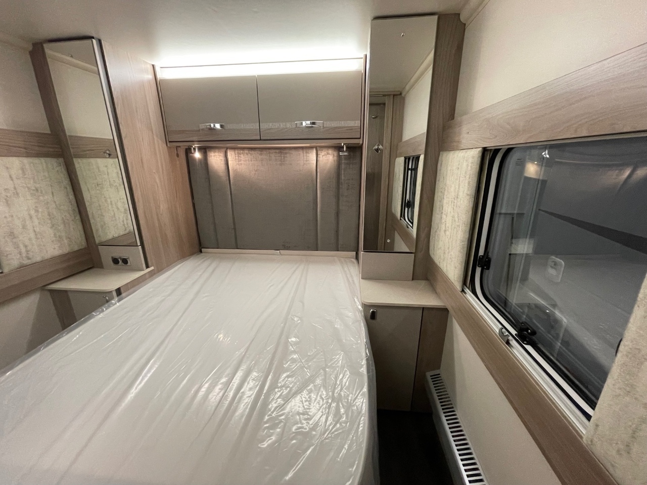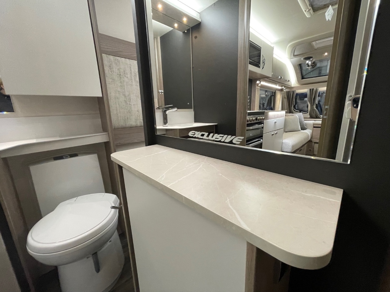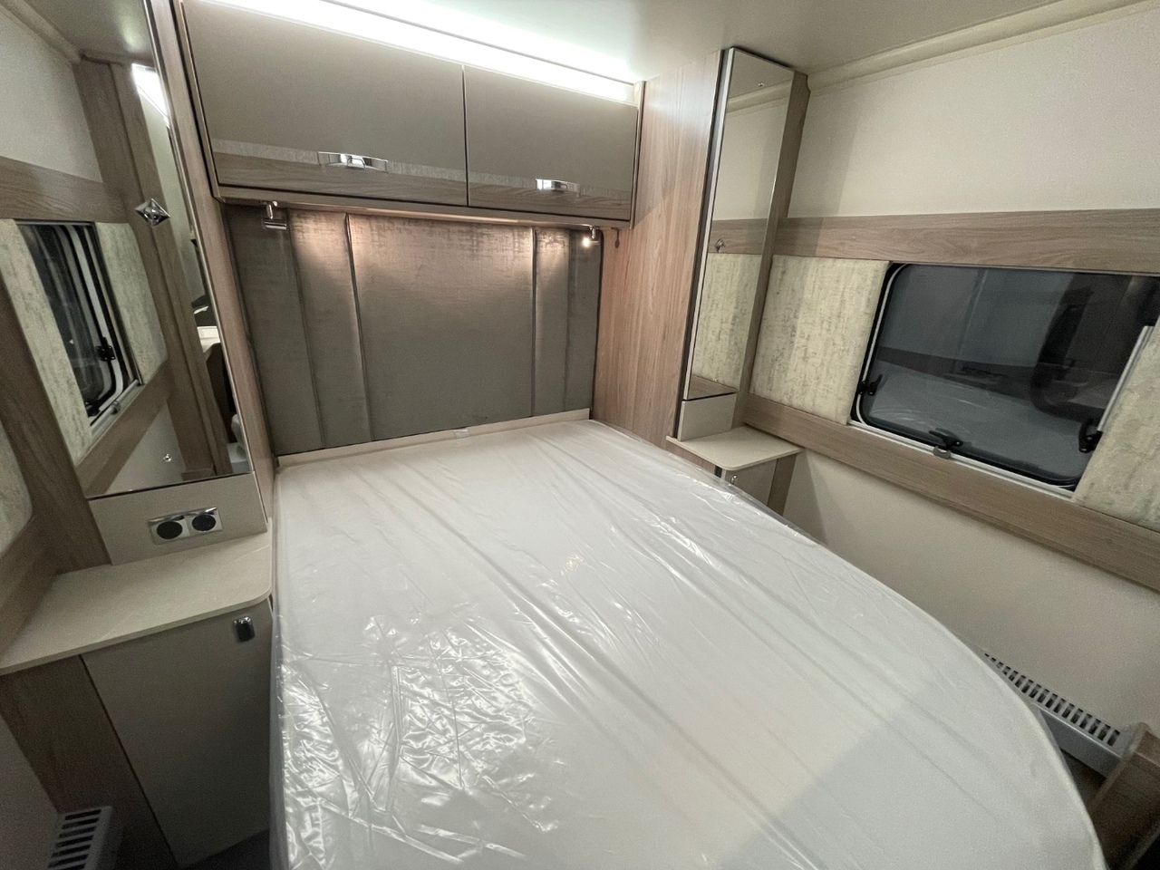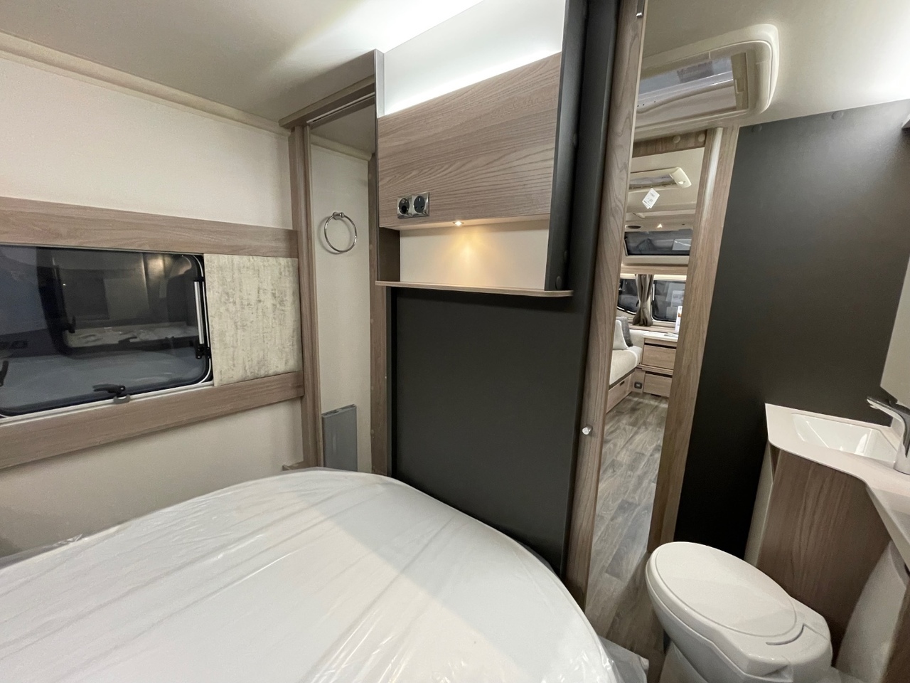 Towards the rear is the luxurious bedroom area with a fixed island bed, complete with a Duvalay mattress for a perfect night’s sleep. Overhead lockers and wardrobes on either side of the bed provide generous storage, while the private sliding door gives added comfort and seclusion.