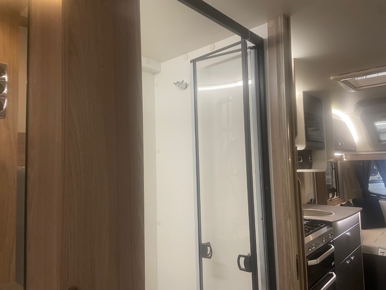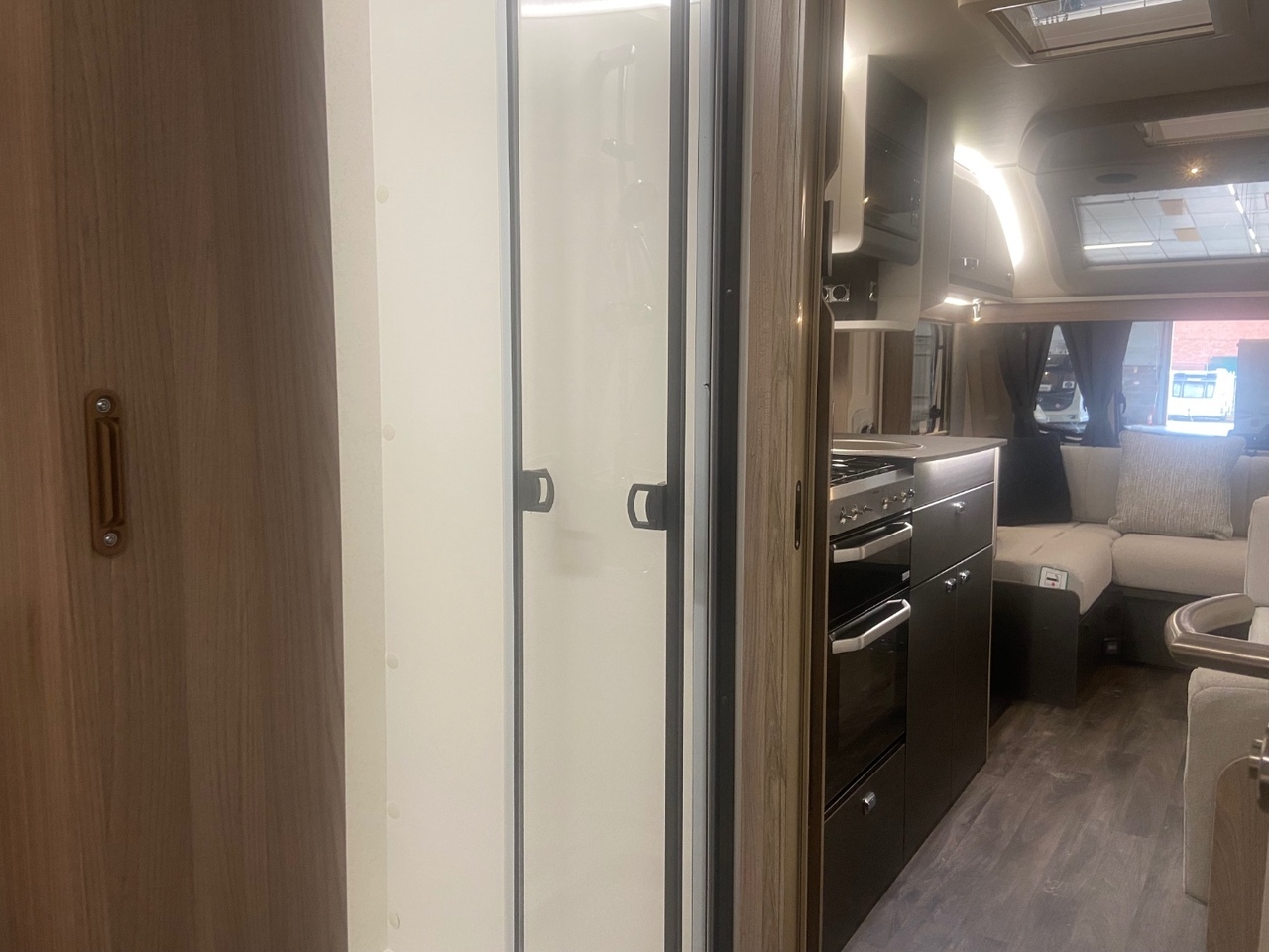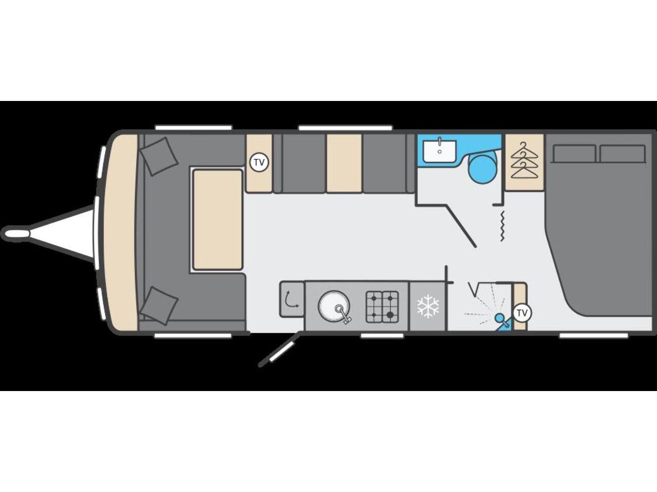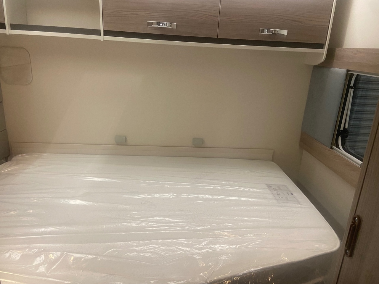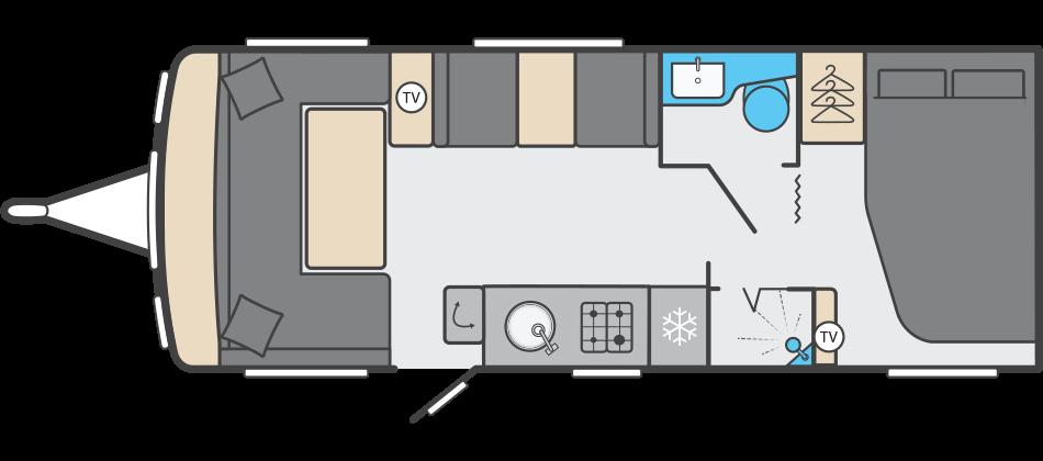 The central washroom is cleverly split across the middle of the caravan, with the toilet and washbasin on one side and a separate shower cubicle on the other, allowing for excellent practicality and privacy At the rear is the dedicated bedroom area, featuring a fixed double bed with a luxurious Duvalay mattress for ultimate comfort. Overhead lockers and side wardrobes provide ample storage for all your essentials, making it ideal for longer stays away.