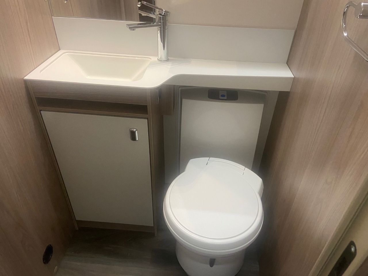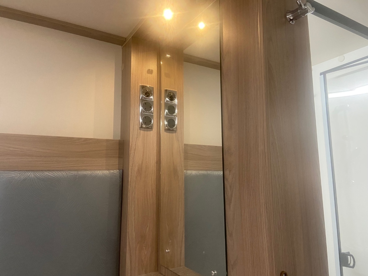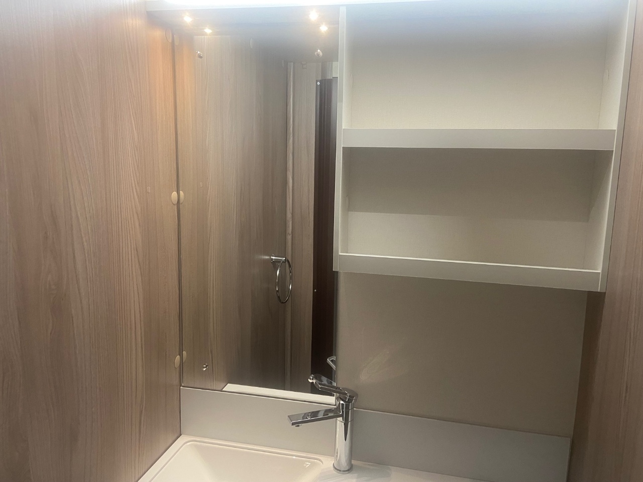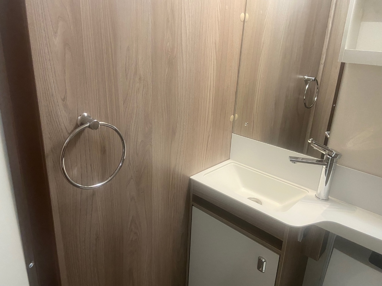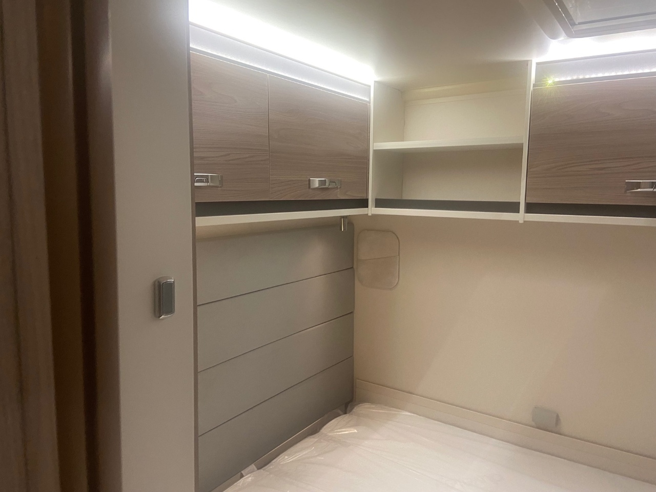 The central washroom is cleverly split across the middle of the caravan, with the toilet and washbasin on one side and a separate shower cubicle on the other, allowing for excellent practicality and privacy At the rear is the dedicated bedroom area, featuring a fixed double bed with a luxurious Duvalay mattress for ultimate comfort. Overhead lockers and side wardrobes provide ample storage for all your essentials, making it ideal for longer stays away.