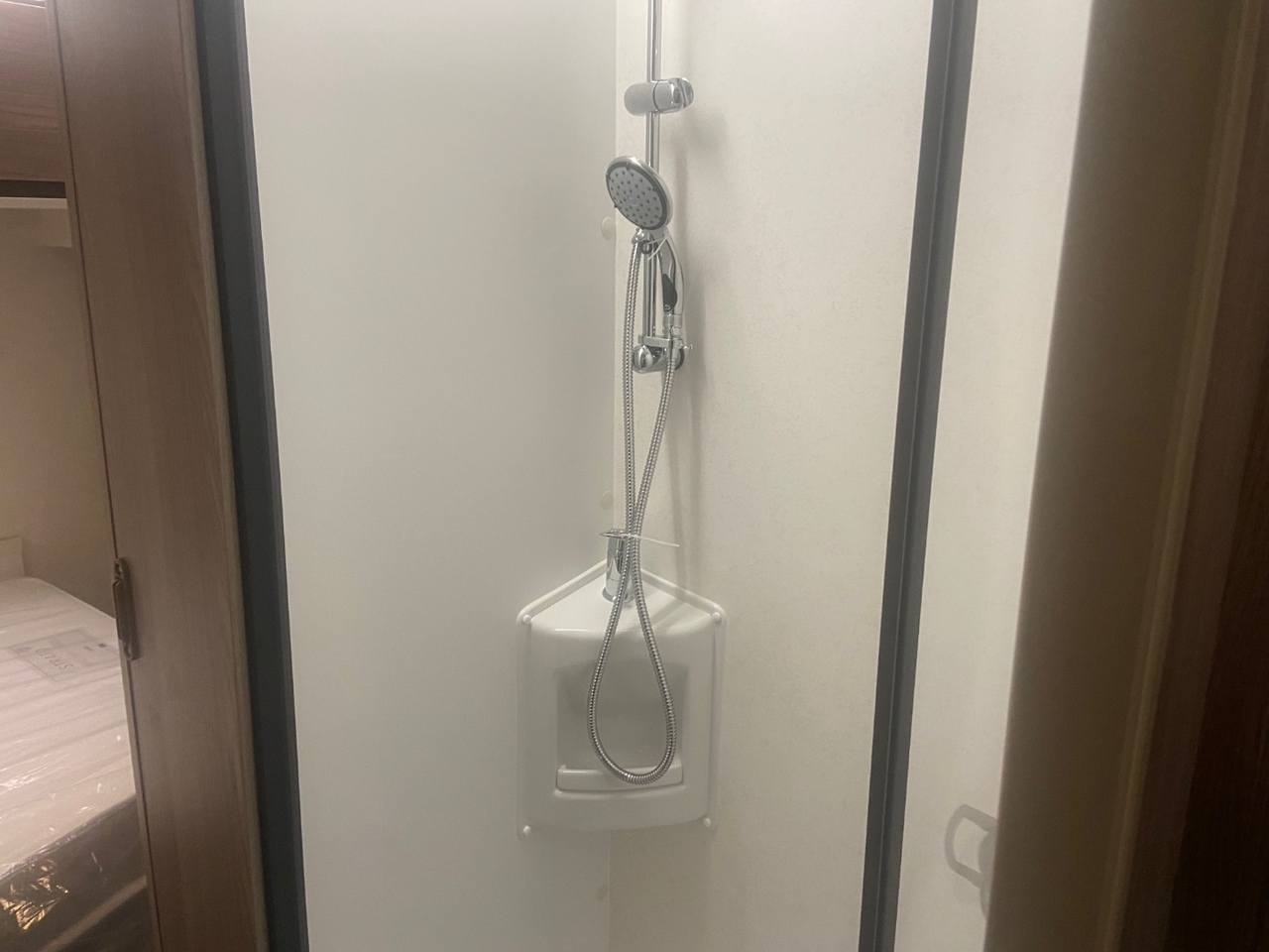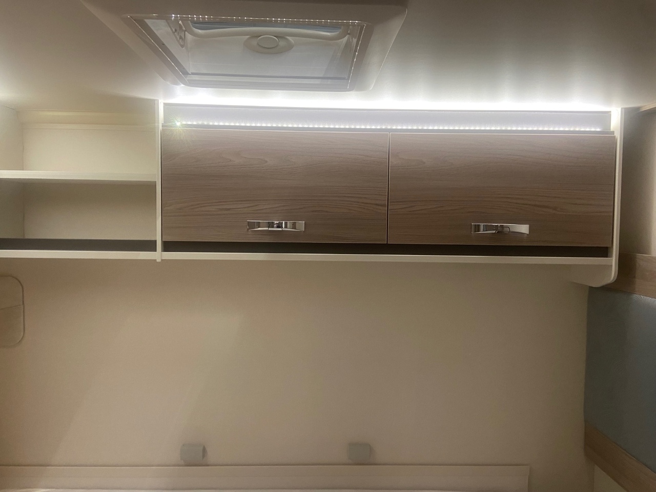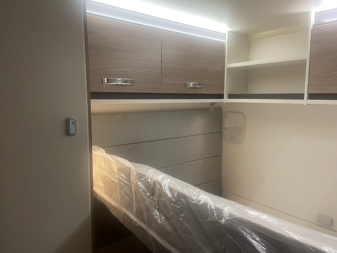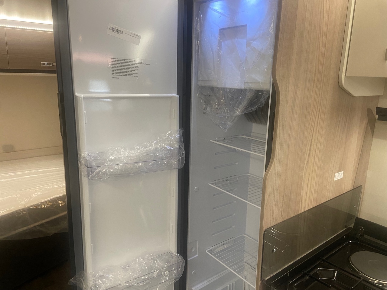 The central washroom is cleverly split across the middle of the caravan, with the toilet and washbasin on one side and a separate shower cubicle on the other, allowing for excellent practicality and privacy At the rear is the dedicated bedroom area, featuring a fixed double bed with a luxurious Duvalay mattress for ultimate comfort. Overhead lockers and side wardrobes provide ample storage for all your essentials, making it ideal for longer stays away.