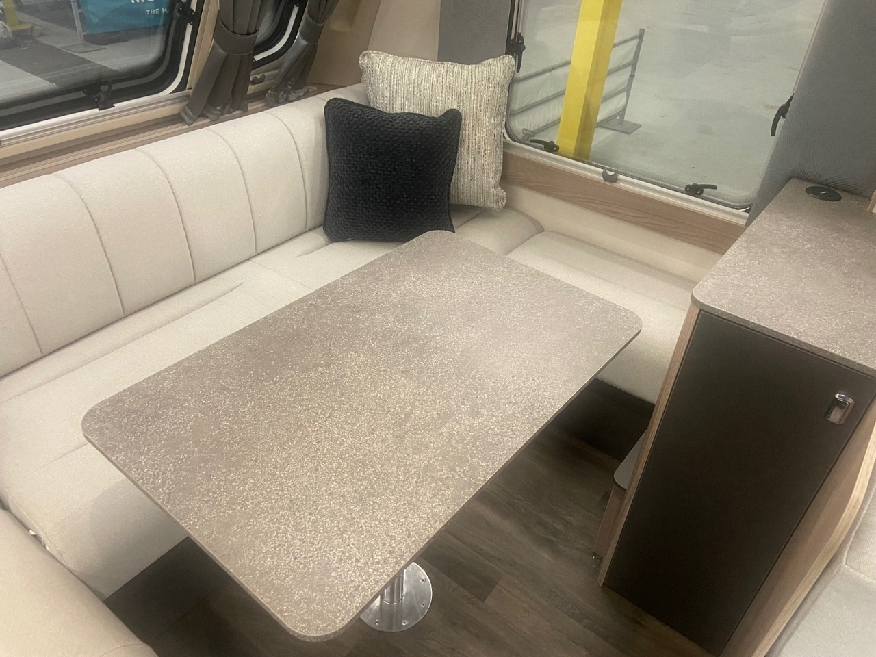 In the middle of the caravan there’s a well equipped central kitchen, offering everything you need for convenient home from home cooking. It includes an oven, grill, three burner gas hob, microwave, and a fridge with freezer compartment, along with generous storage and workspace. Opposite, the U shaped dinette offers a great place for family meals or can be converted into another sleeping area if required.