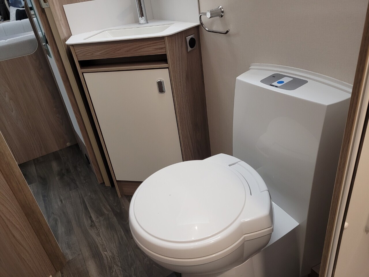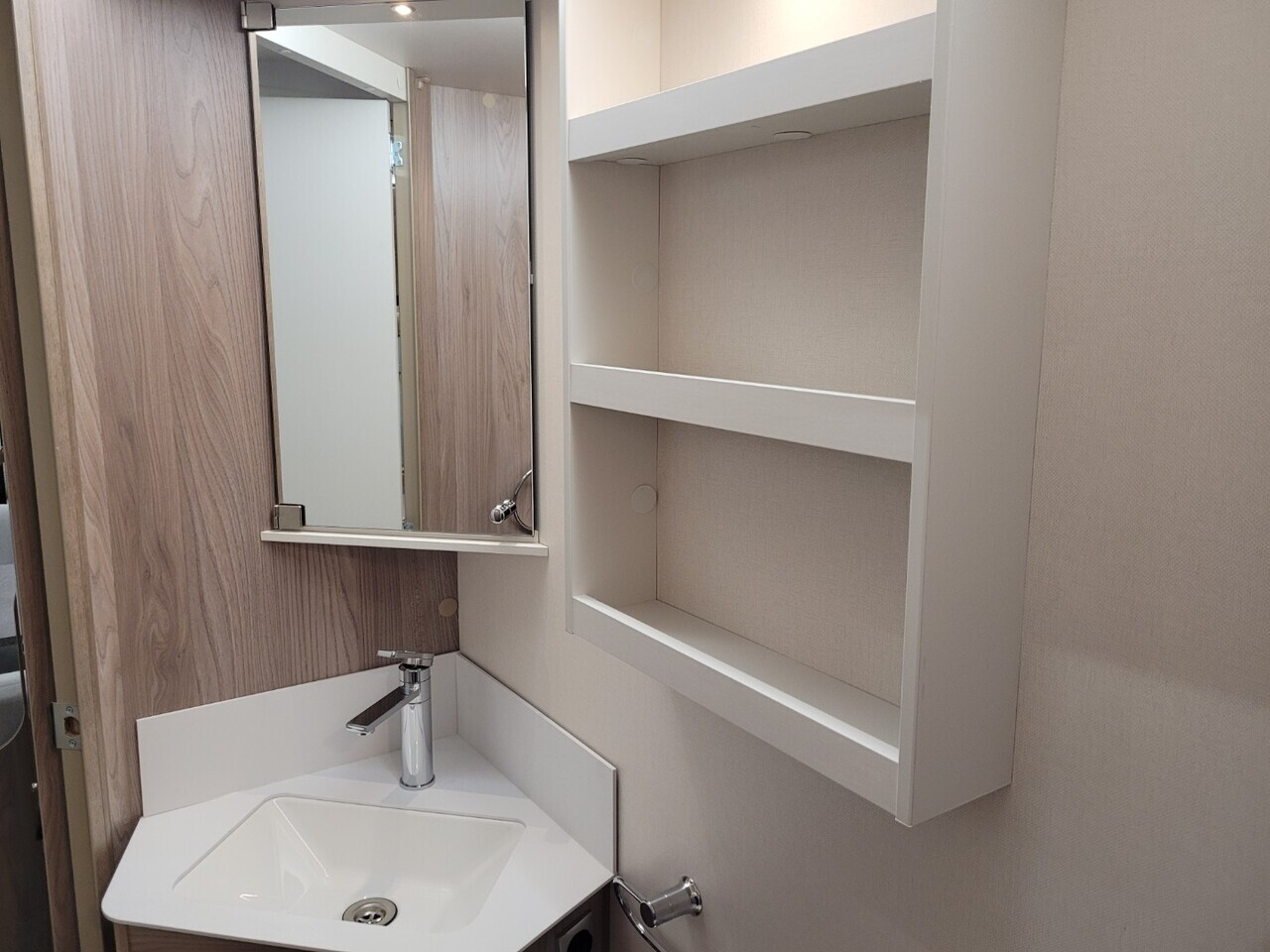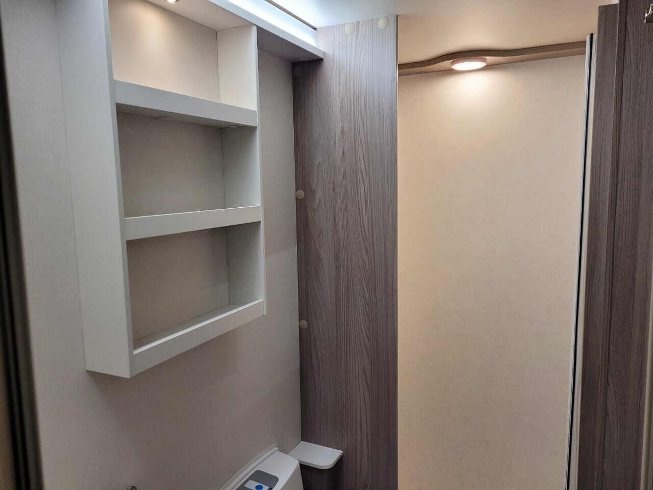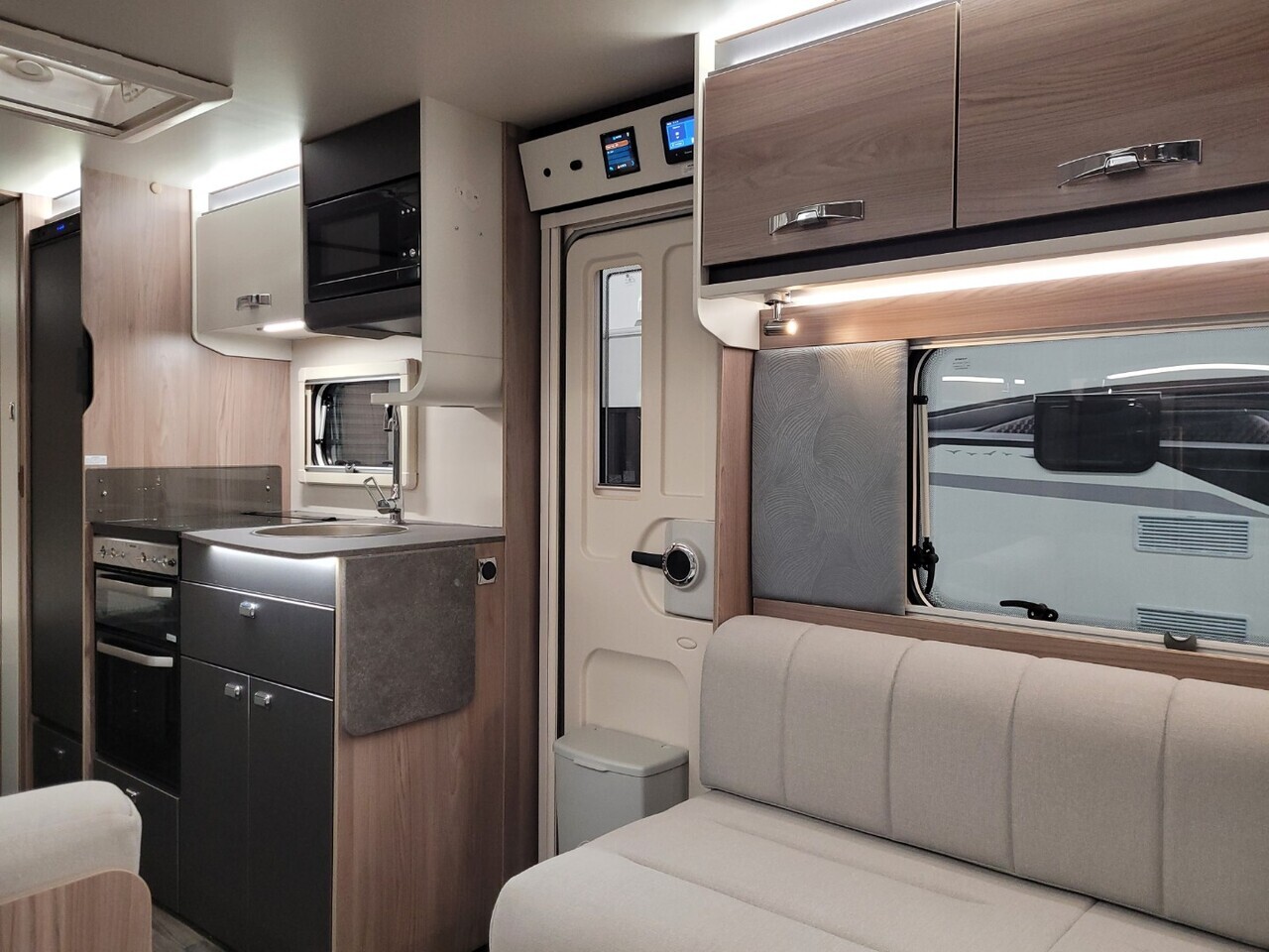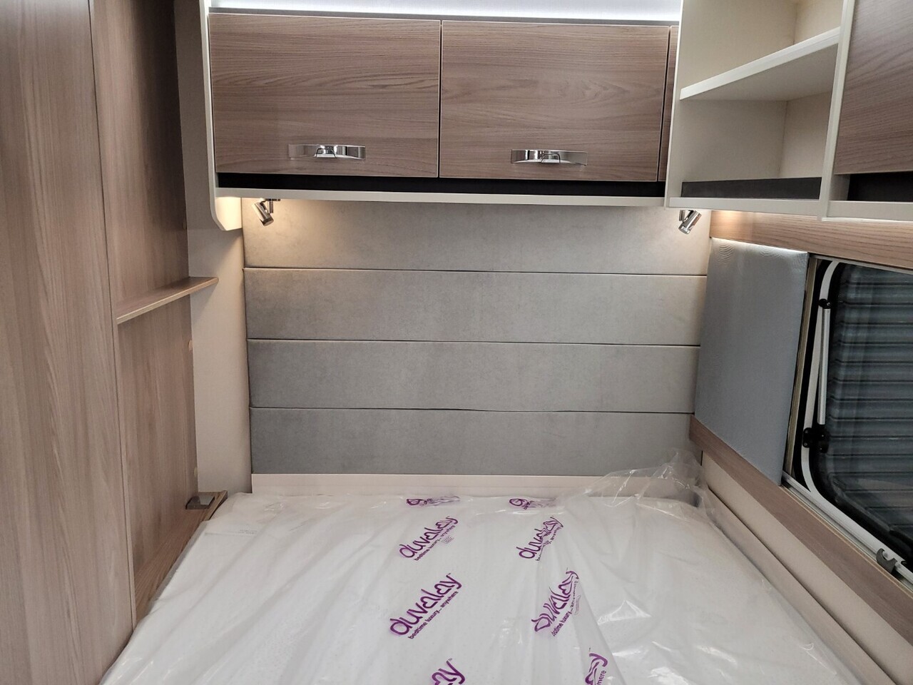 At the rear is a dedicated bedroom with a fixed island bed, offering a luxurious Duvalay mattress for a comfortable night’s sleep. Overhead lockers and wardrobes provide generous storage space, ensuring everything has its place.