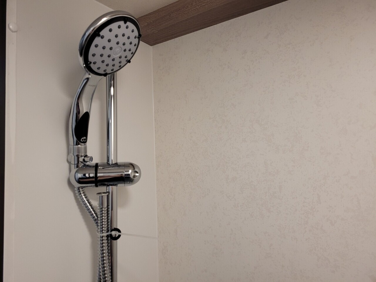 The central washroom features a practical layout with a toilet and washbasin on one side and a separate shower cubicle opposite, giving excellent privacy and convenience.
