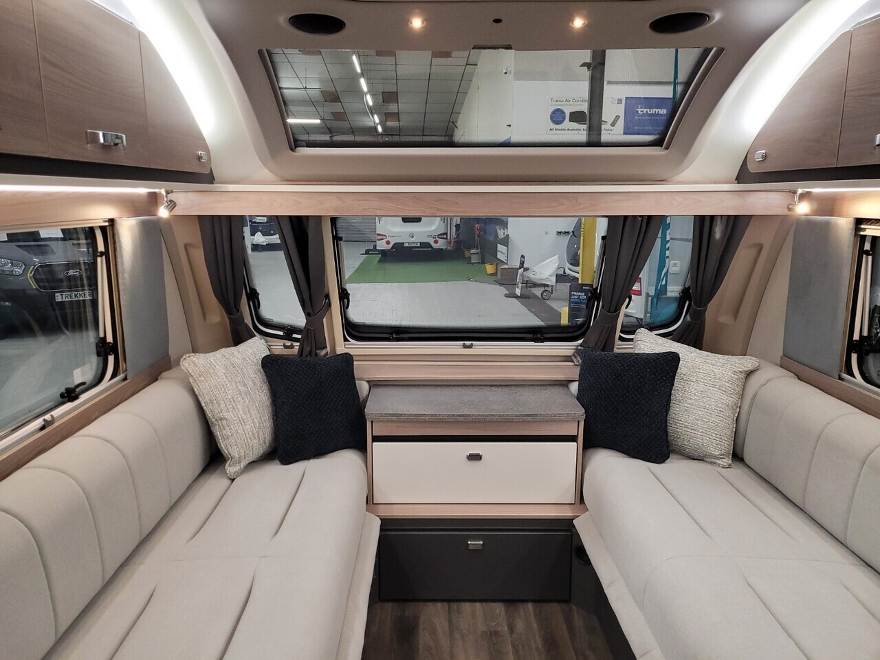 At the front is a large lounge area featuring parallel seating that offers the perfect place to relax during the day. These seats can also be converted into a generous double bed at night, providing flexible sleeping arrangements for families or guests.