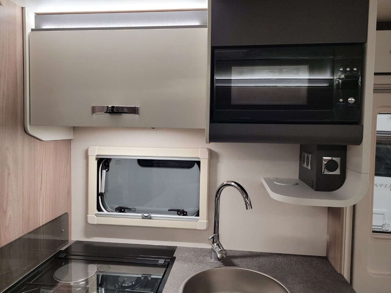 In the centre is a well equipped kitchen with everything you need for home from home cooking, including an oven, grill, three burner gas hob, microwave and a fridge with freezer compartment. There is plenty of workspace and storage, making it ideal for longer adventures.