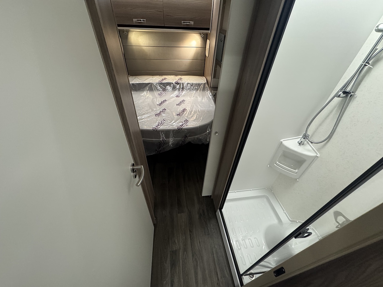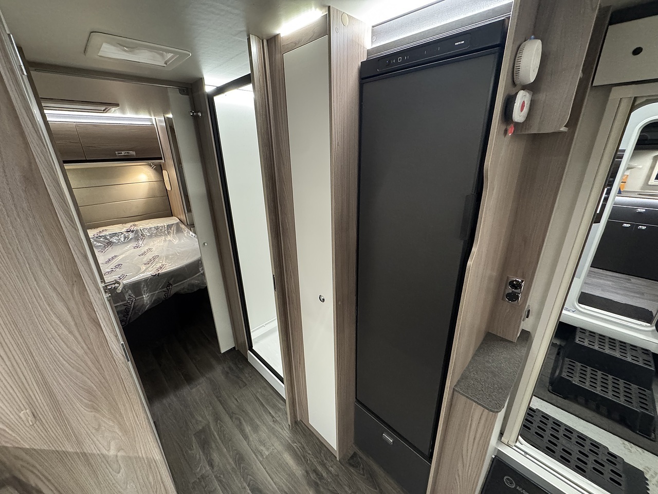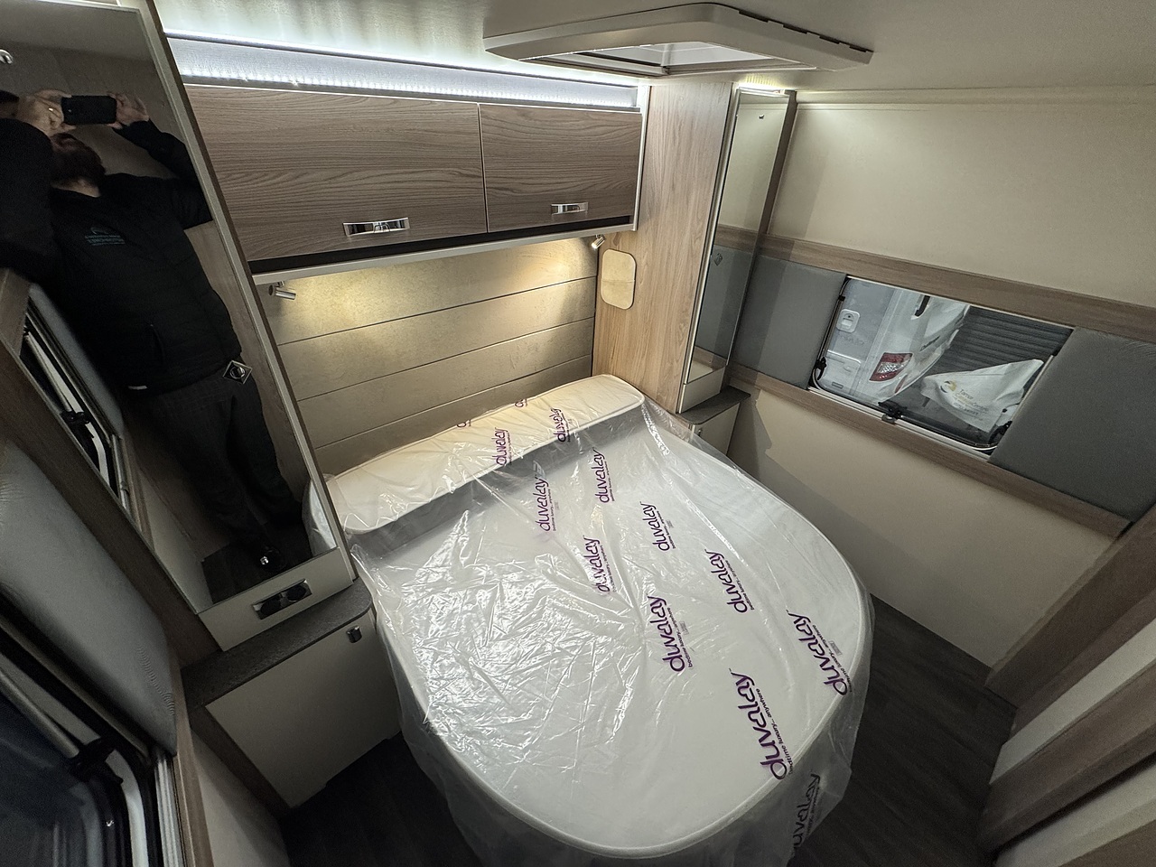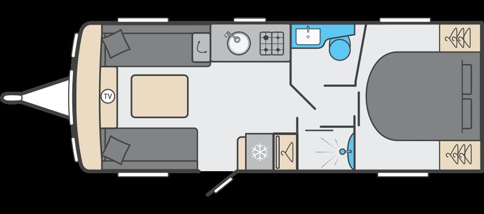 At the rear is a luxurious end bedroom with a fixed island bed, complete with a Duvalay mattress for superior comfort. Overhead lockers and wardrobes provide ample storage, while the bedroom offers a private and peaceful retreat after a day of exploring.