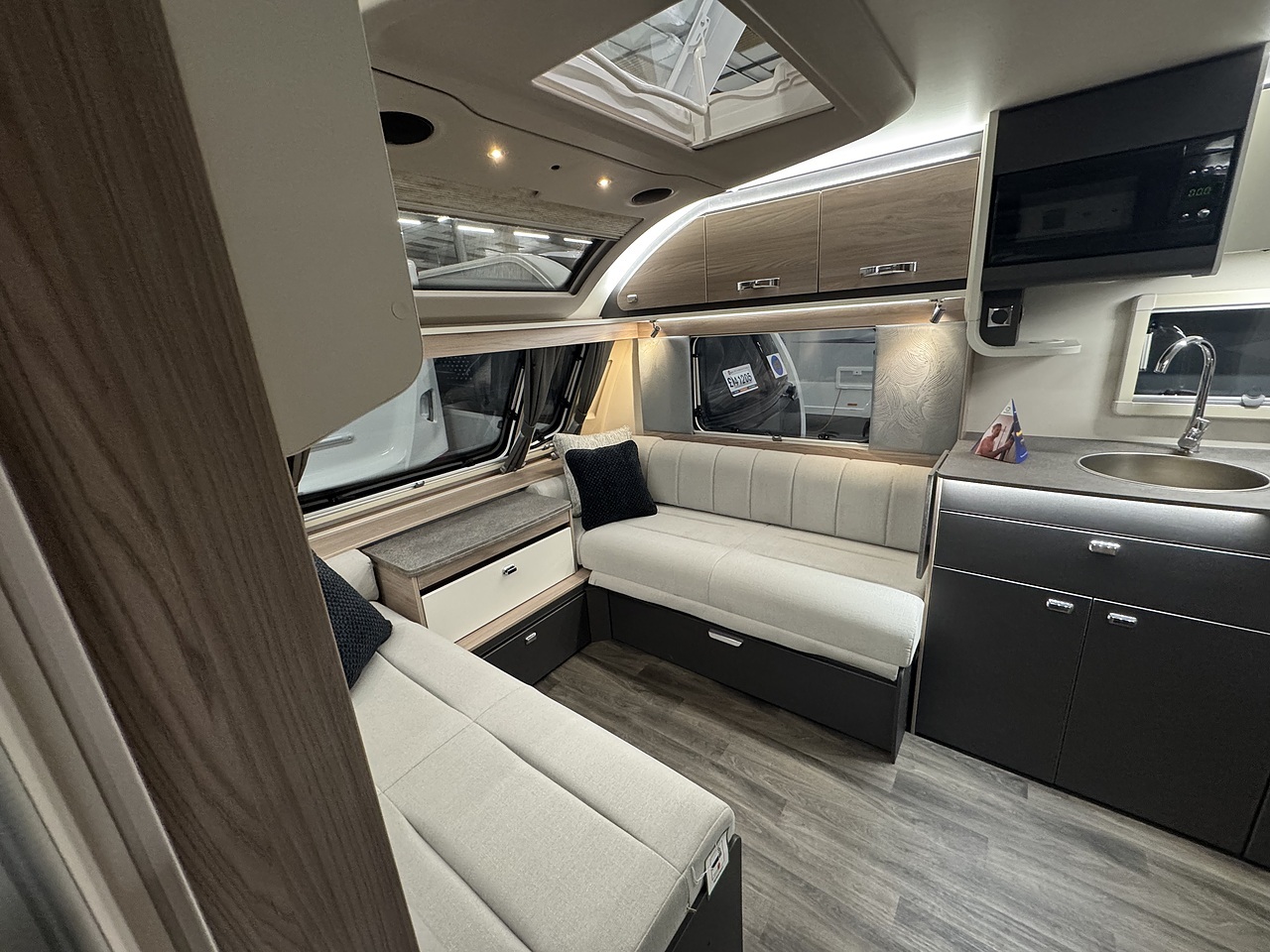 At the front is a spacious lounge area with parallel seating, offering a comfortable and stylish space to unwind. These seats easily convert into a generous double bed when required, making the layout ideal for both couples and guests.