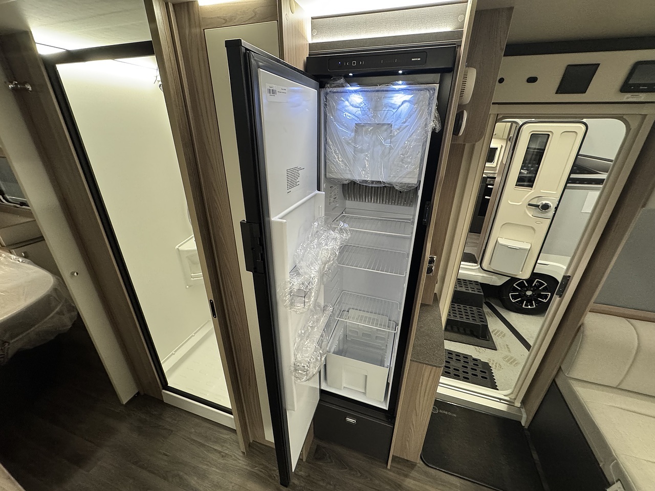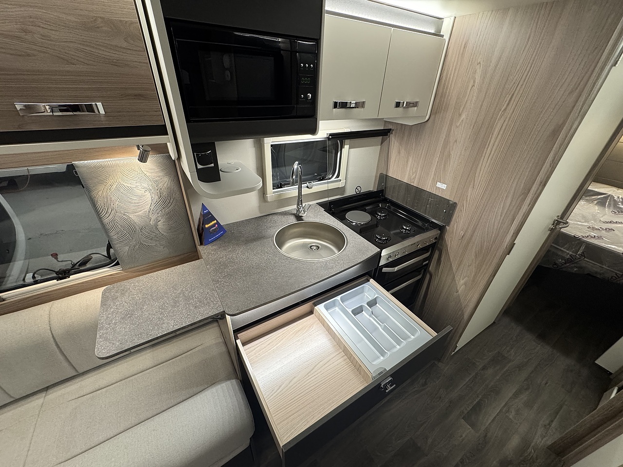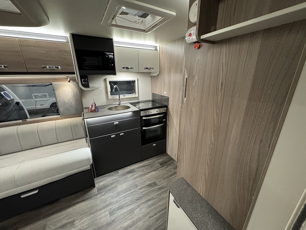 In the centre is a well equipped kitchen, designed with practicality and modern living in mind. It includes an oven, grill, three burner gas hob, microwave, and a fridge with freezer compartment. Ambient lighting and quality finishes complete the premium look and feel.