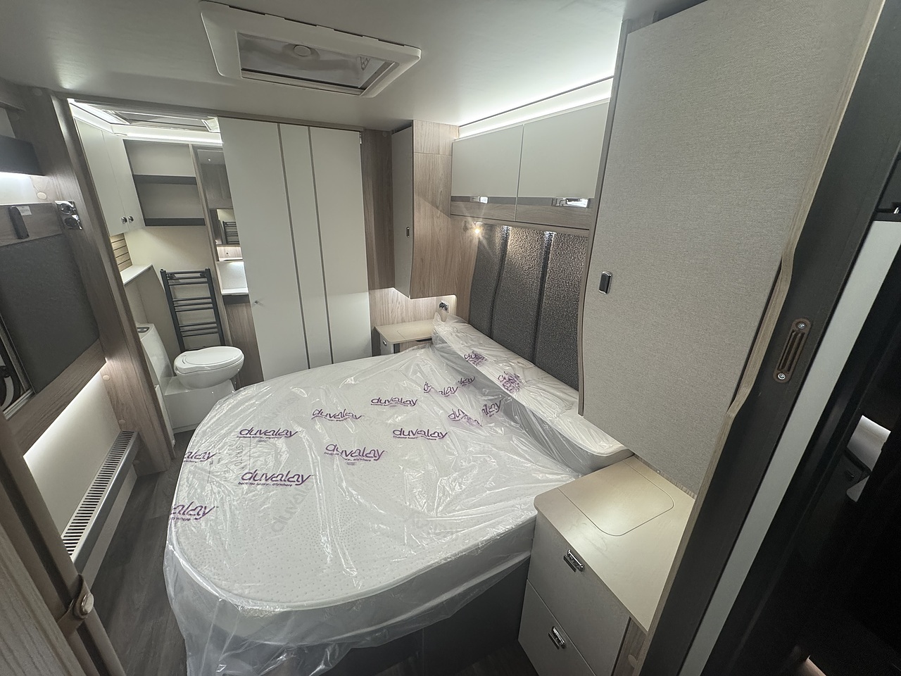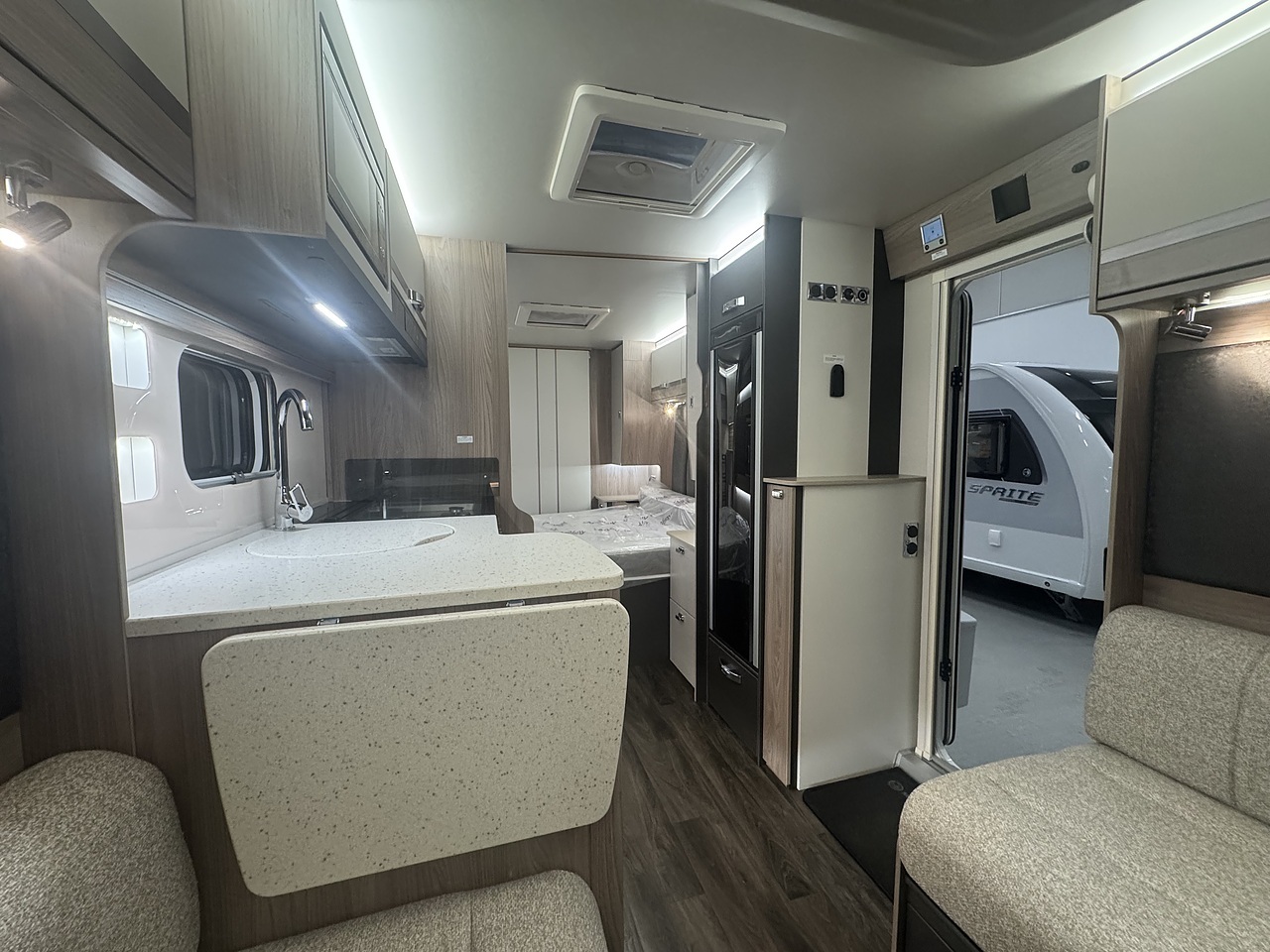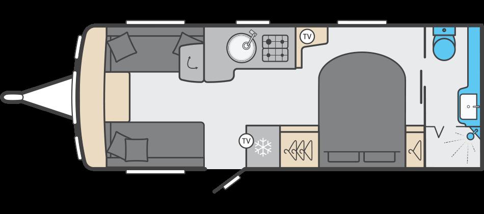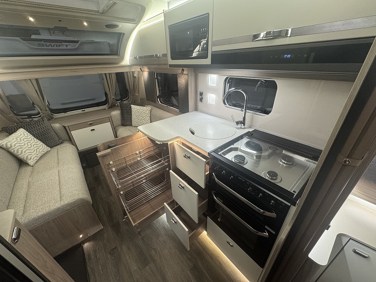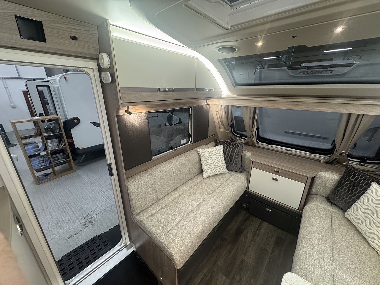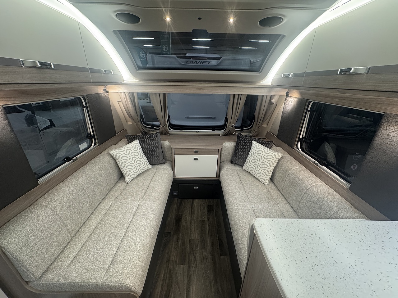 Towards the rear, the luxurious bedroom features a fixed island bed that offers exceptional comfort and plenty of underbed storage. Ambient LED lighting and premium fabrics enhance the sense of space and relaxation, creating a true home-from-home environment. At the very back of the caravan is the spacious end washroom, featuring a toilet, wash basin, and a separate walk-in shower, all finished to Swift’s high-quality standards.