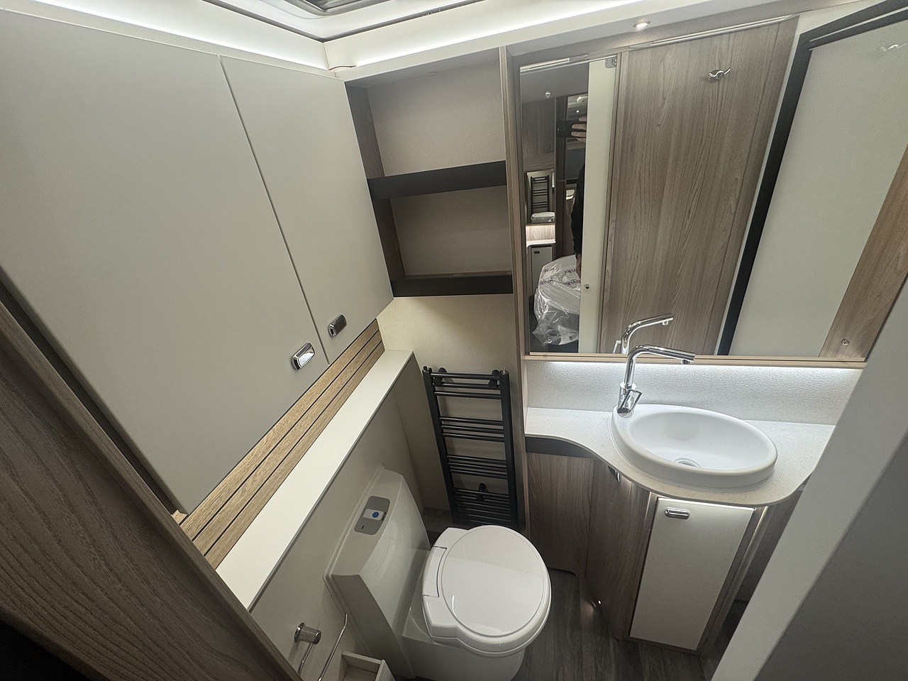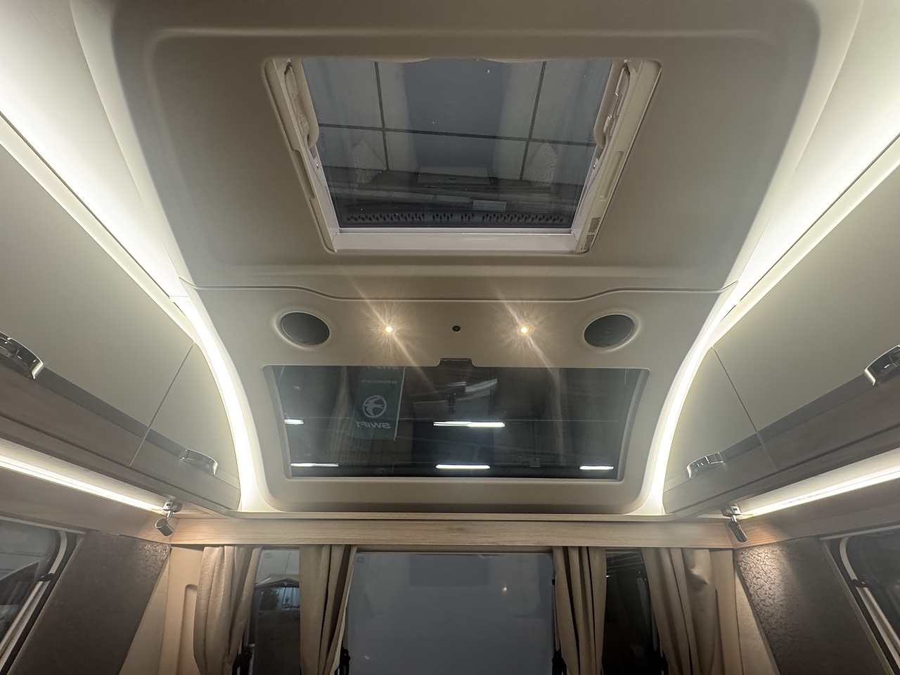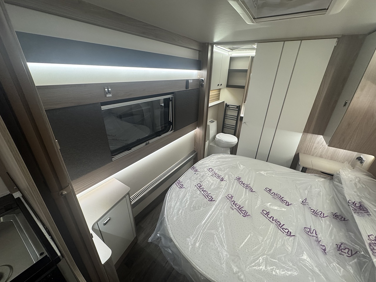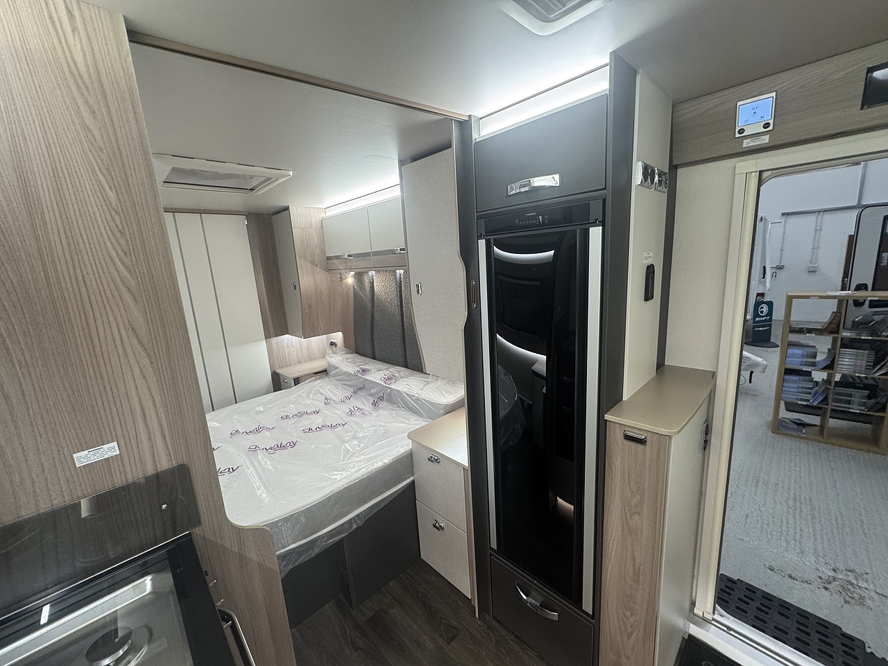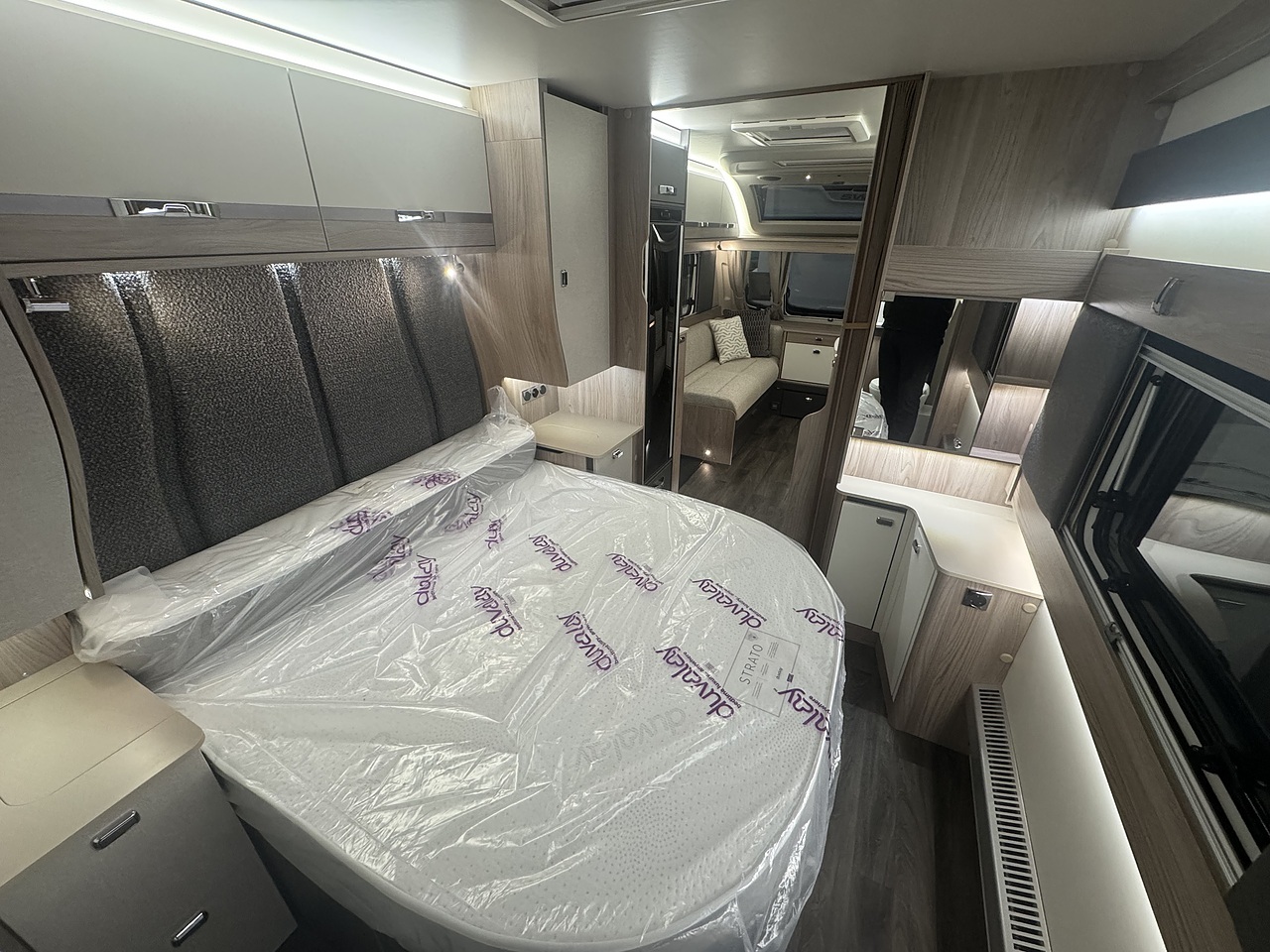 Towards the rear, the luxurious bedroom features a fixed island bed that offers exceptional comfort and plenty of underbed storage. Ambient LED lighting and premium fabrics enhance the sense of space and relaxation, creating a true home-from-home environment. At the very back of the caravan is the spacious end washroom, featuring a toilet, wash basin, and a separate walk-in shower, all finished to Swift’s high-quality standards.