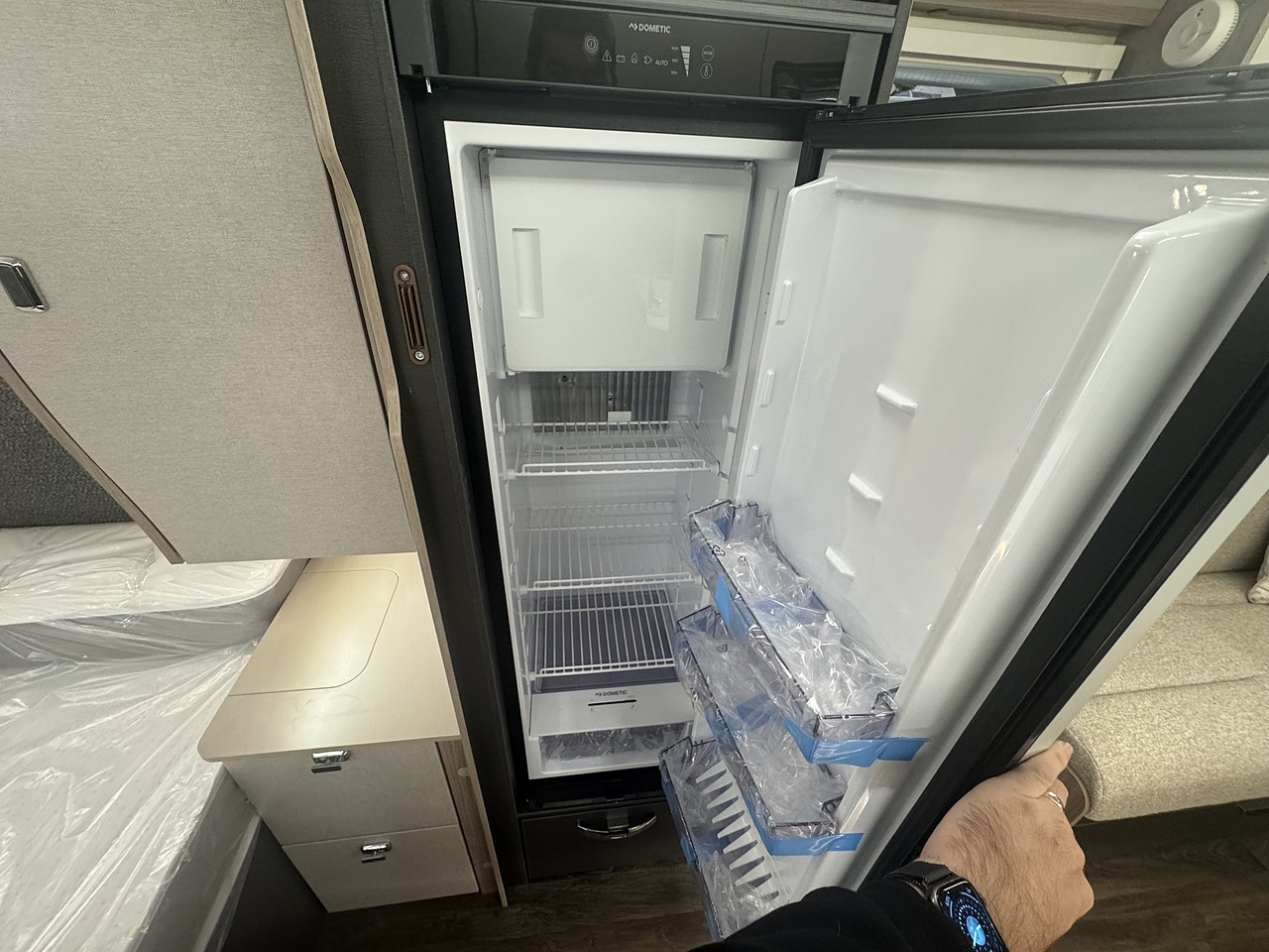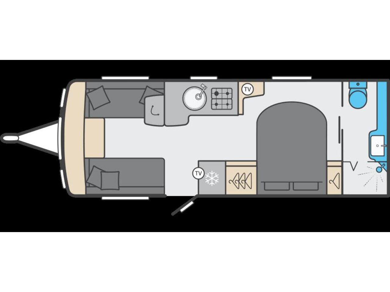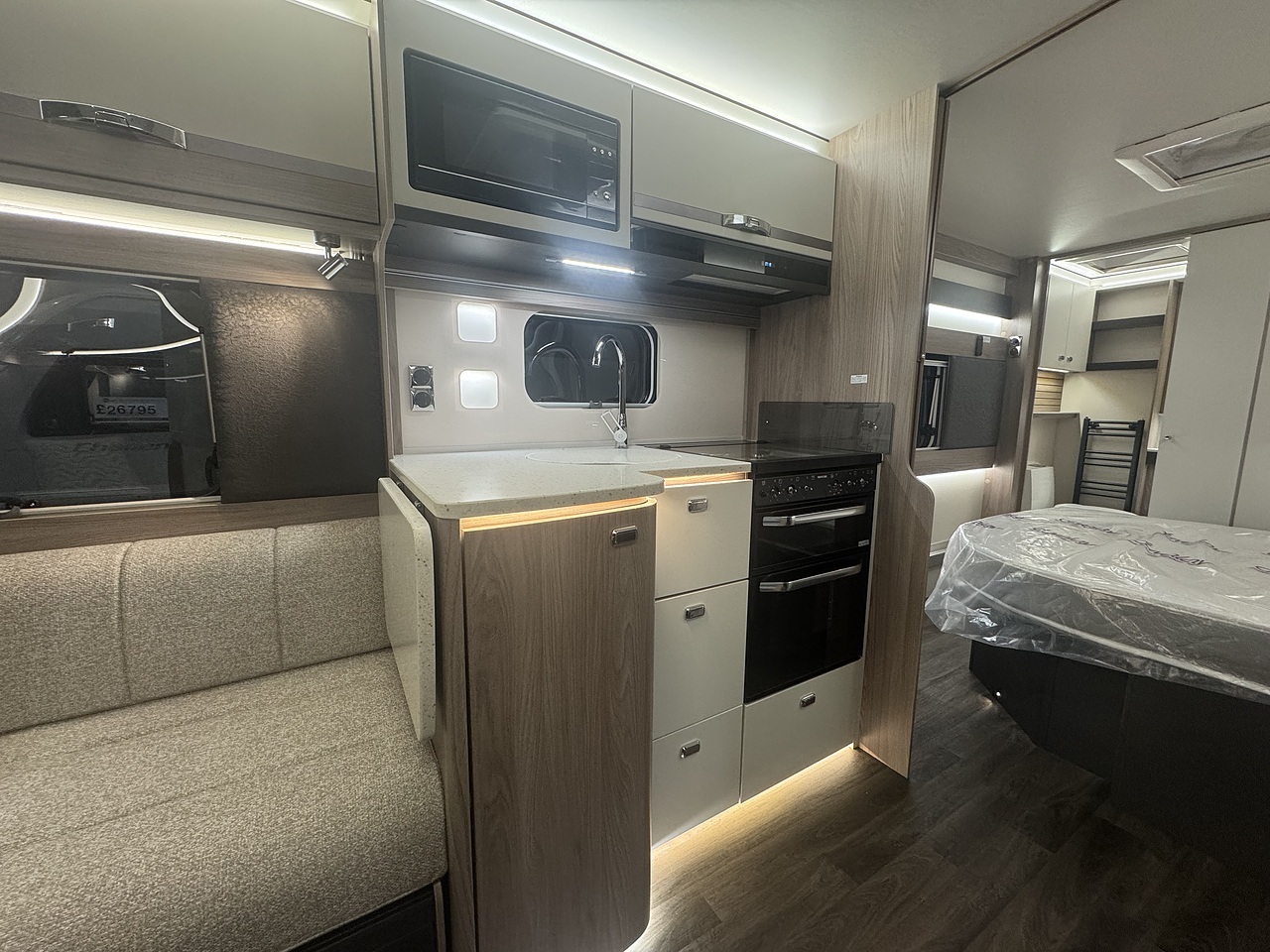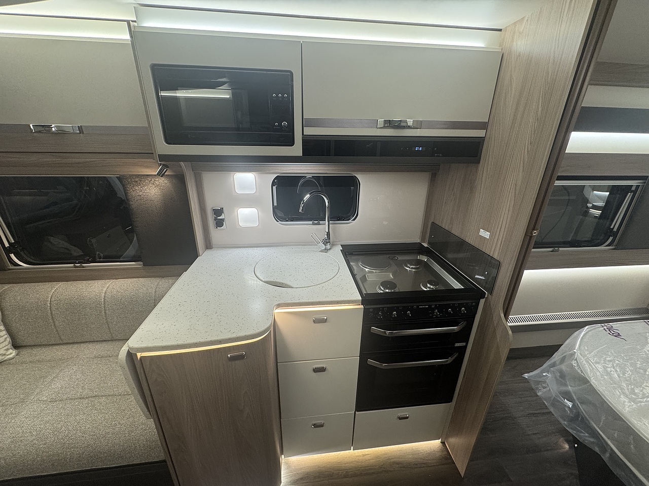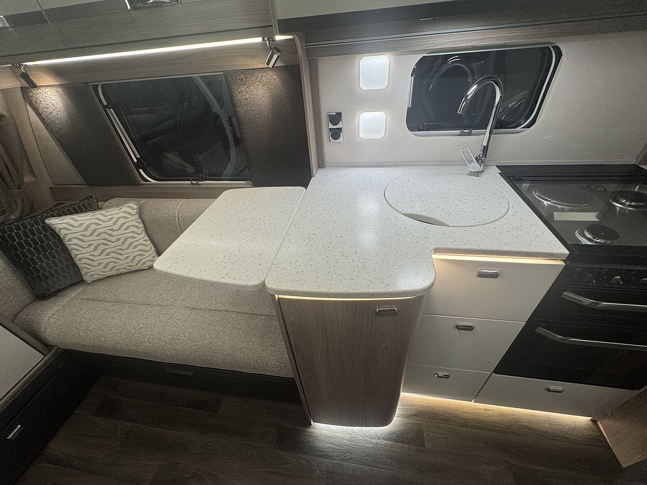 At the front of the caravan, you’ll find a bright and spacious lounge area with parallel seating, perfect for relaxing during the day or entertaining guests in the evening. This area easily converts into a large double bed when required, offering flexible sleeping arrangements for up to four people.
