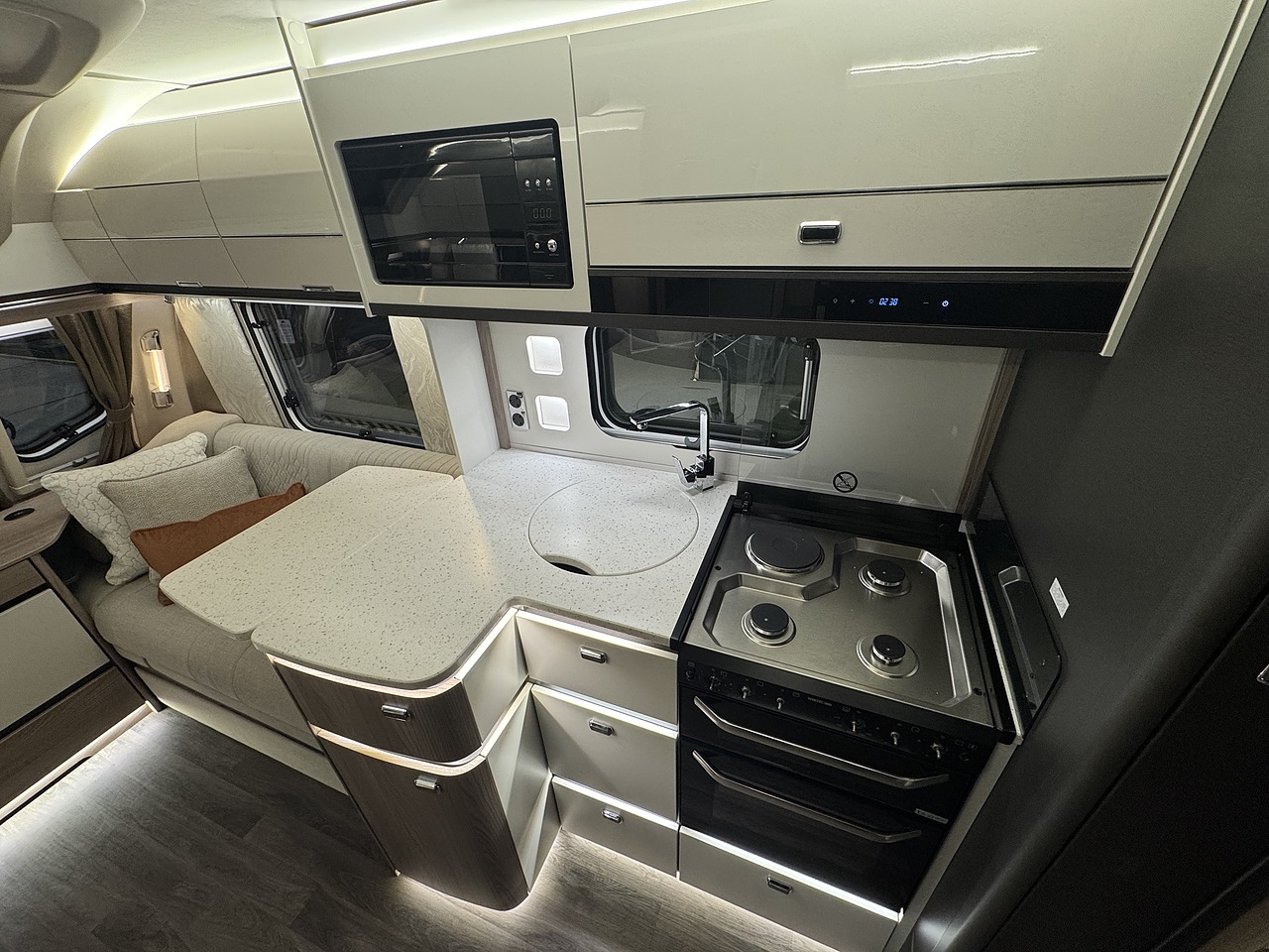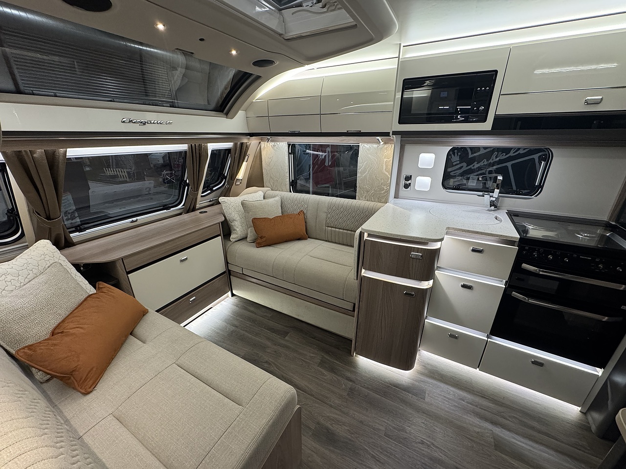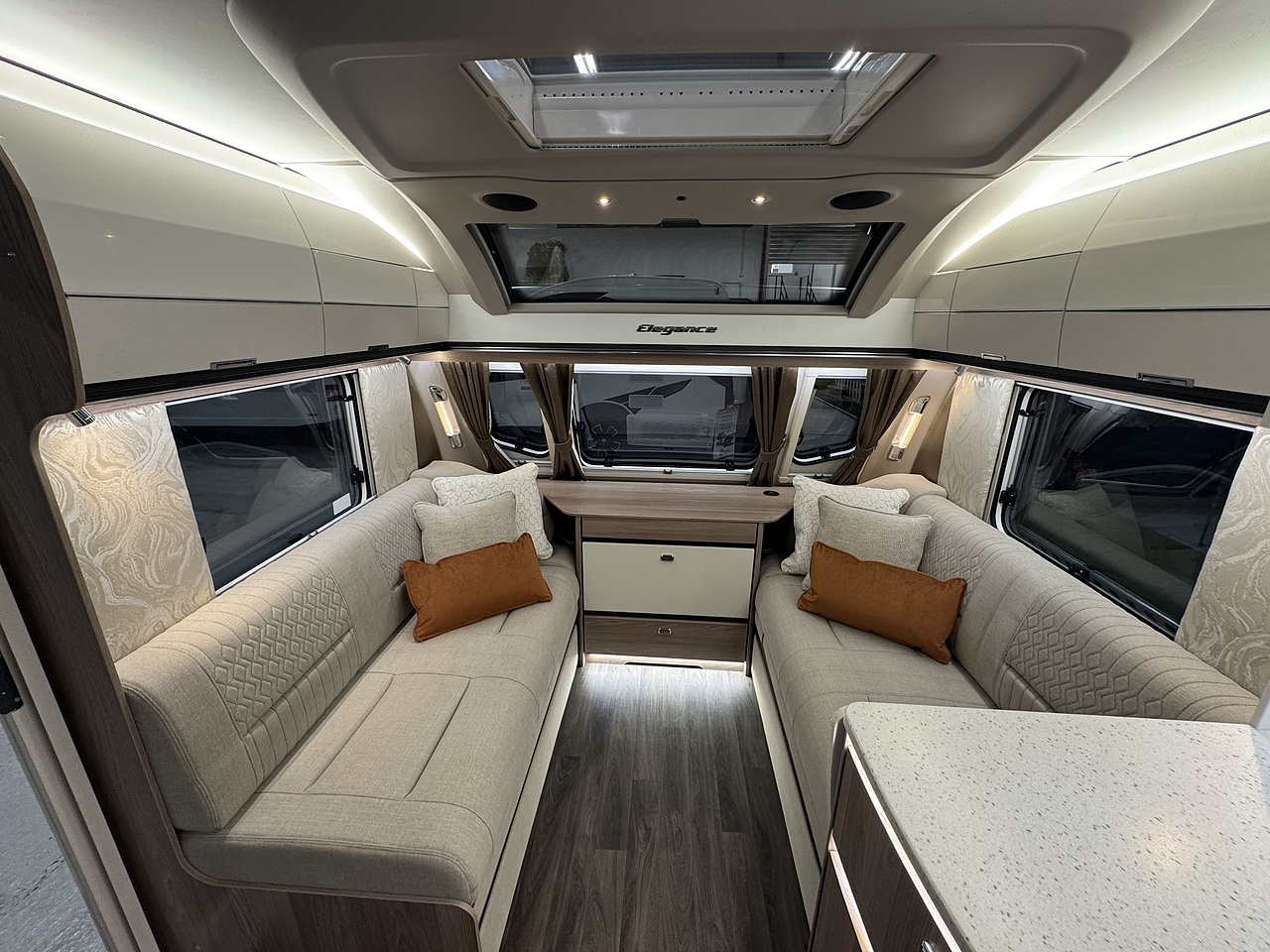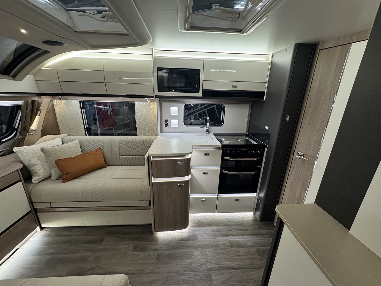 At the front, the parallel lounge showcases true elegance. Premium soft furnishings, ambient lighting and superior build quality combine to create a relaxing, high-end living space. Whether you're unwinding after a day exploring or entertaining guests, the lounge feels more like a luxury apartment than a touring caravan.