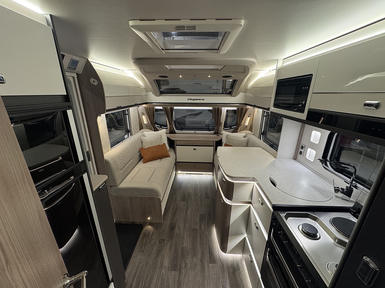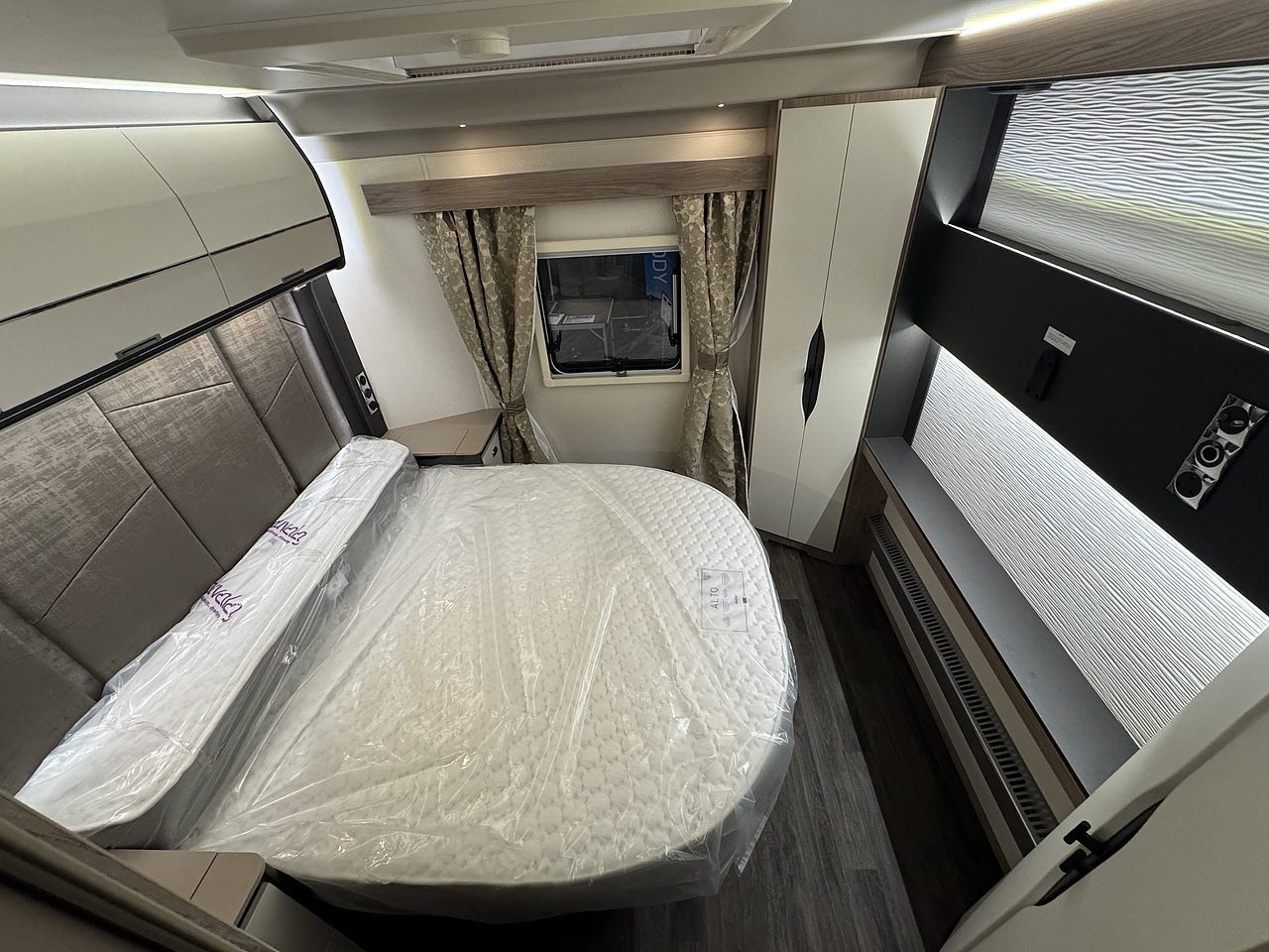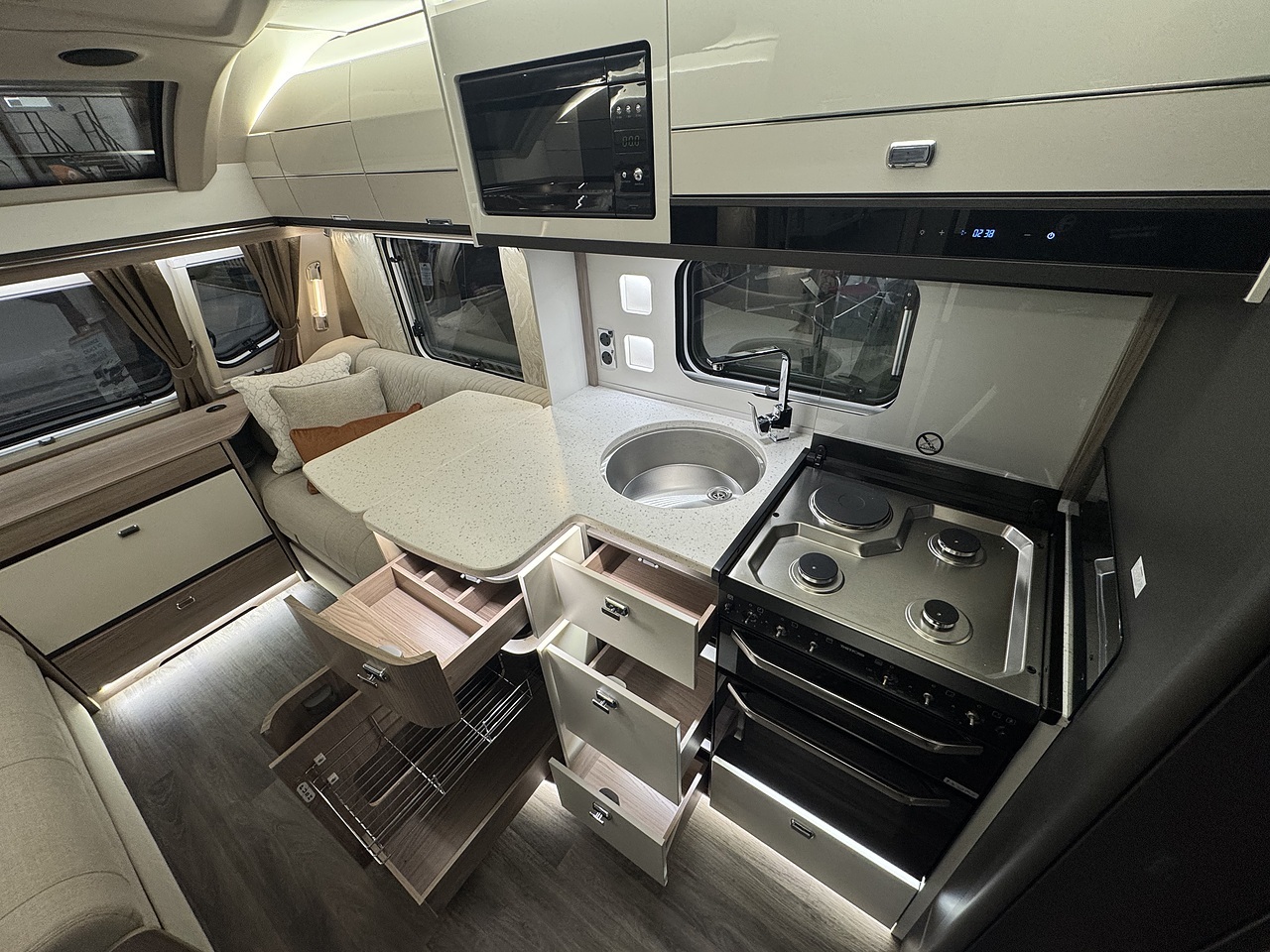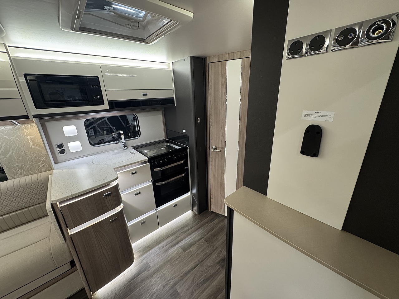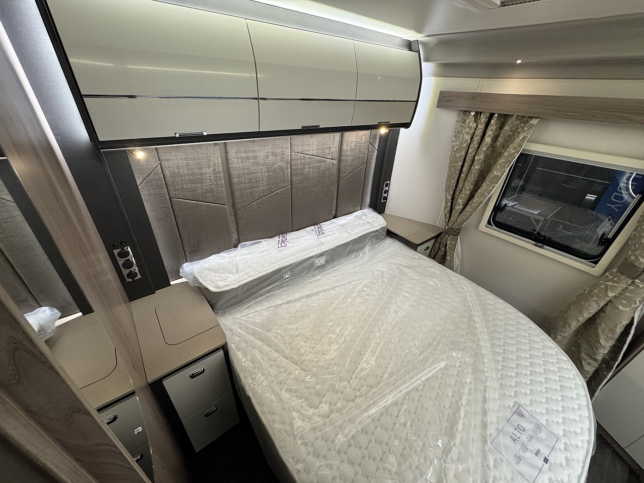 At the front, the parallel lounge showcases true elegance. Premium soft furnishings, ambient lighting and superior build quality combine to create a relaxing, high-end living space. Whether you're unwinding after a day exploring or entertaining guests, the lounge feels more like a luxury apartment than a touring caravan.