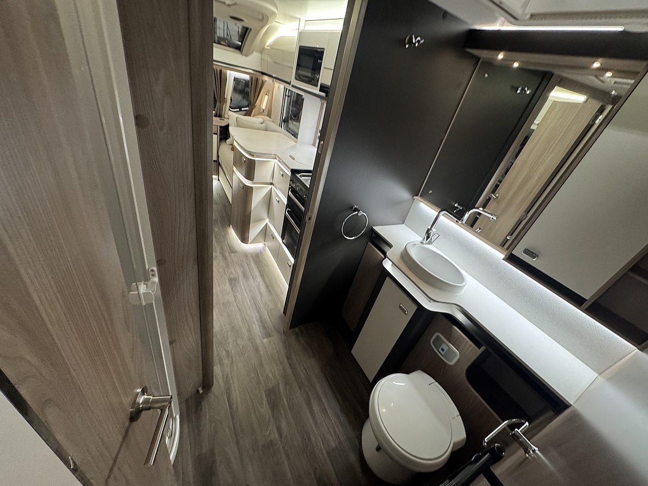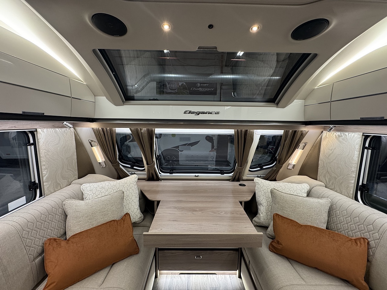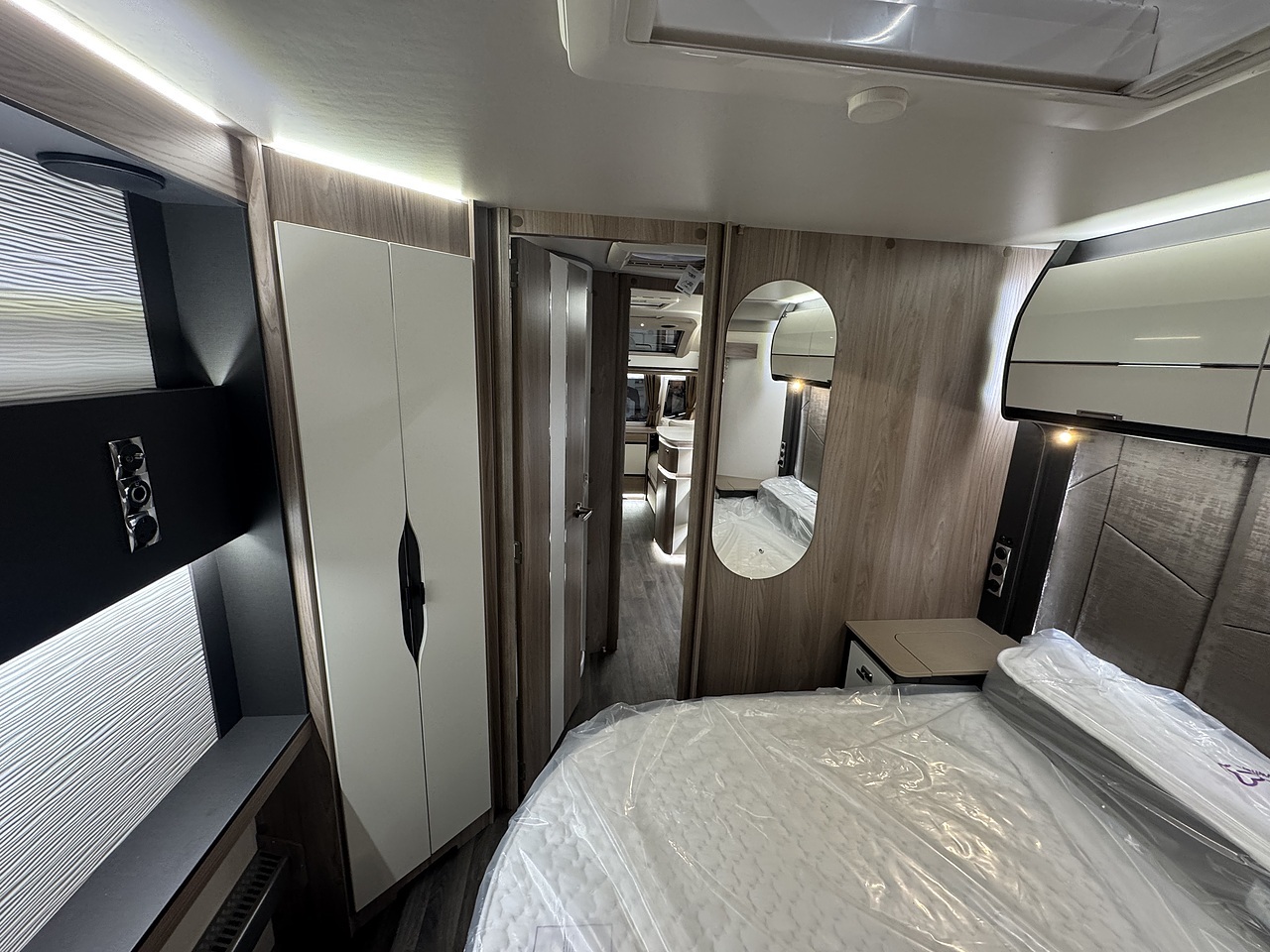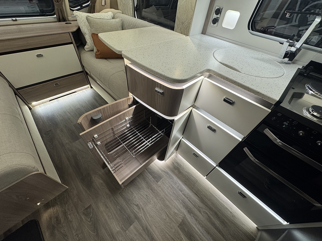 At the front, the parallel lounge showcases true elegance. Premium soft furnishings, ambient lighting and superior build quality combine to create a relaxing, high-end living space. Whether you're unwinding after a day exploring or entertaining guests, the lounge feels more like a luxury apartment than a touring caravan.