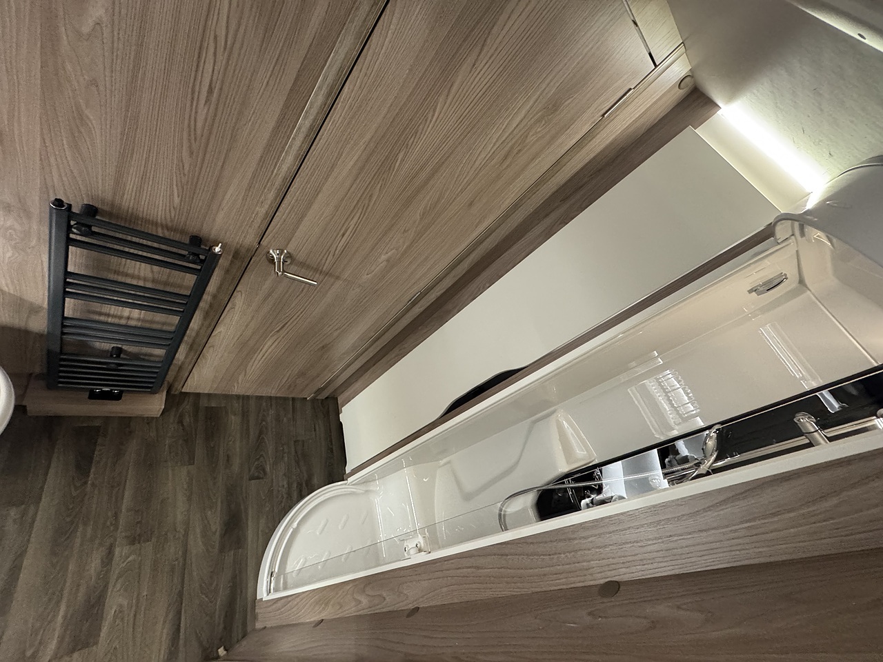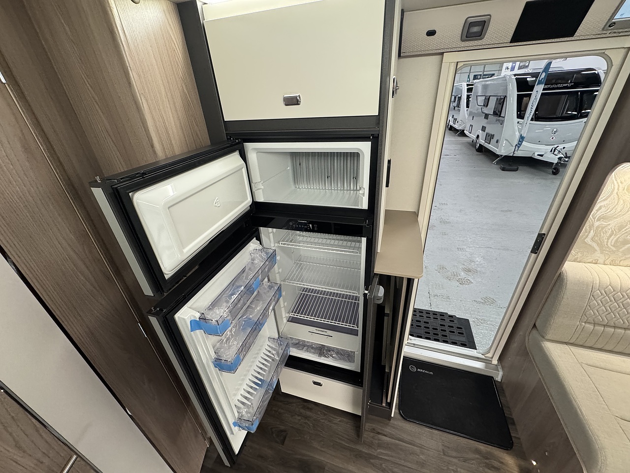 Moving into the kitchen, you’ll find a beautifully finished, fully equipped space designed to make cooking on the road a pleasure. This 835 benefits from a large separate fridge and freezer, integrated microwave, oven, grill, three-burner hob and stylish worktops, ensuring you have everything you need for effortless holiday living. The addition of a Truma roof-mounted air conditioning system elevates comfort even further, keeping the interior perfectly cooled no matter the weather.