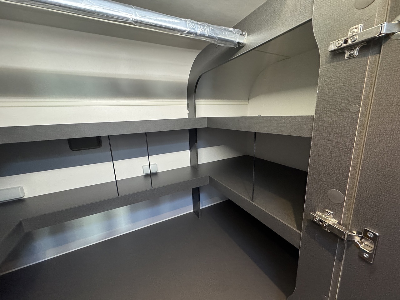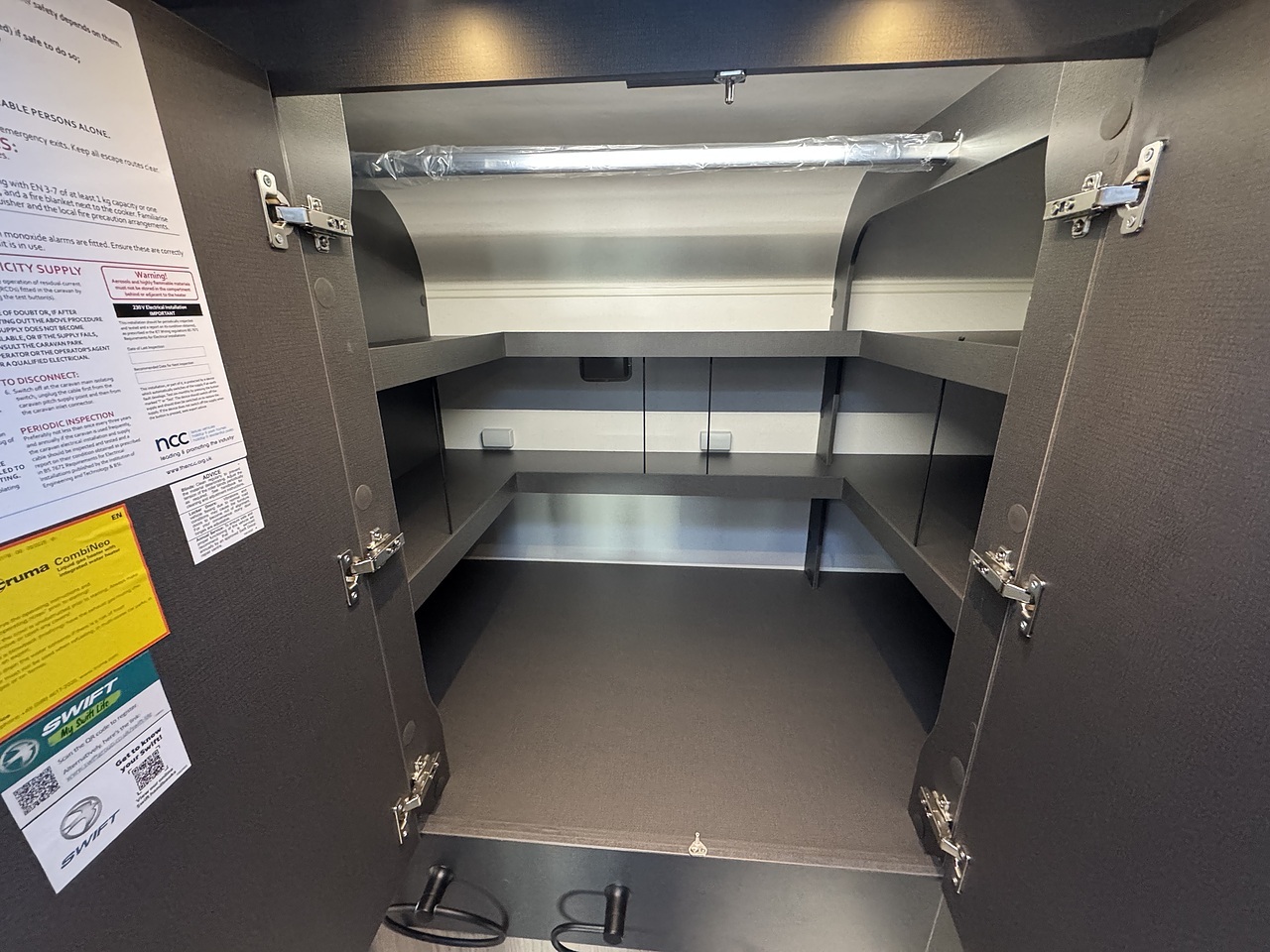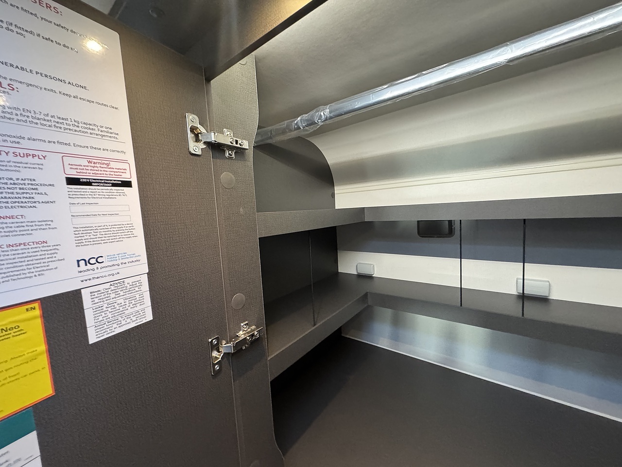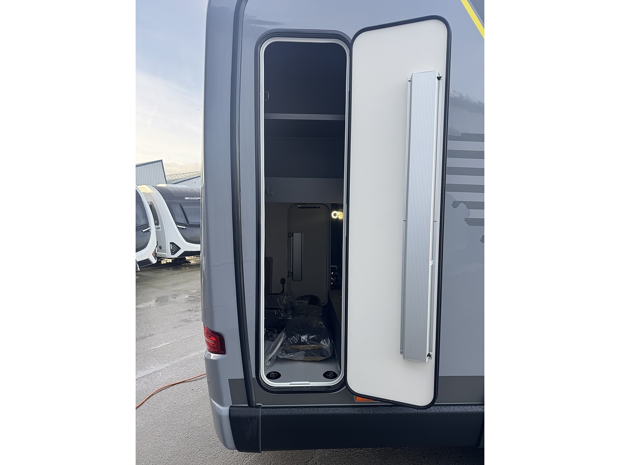 Above the garage is a practical wardrobe storage area, providing hanging space for clothing without taking up valuable living space. This clever design keeps the van organised while maintaining an uncluttered feel throughout.