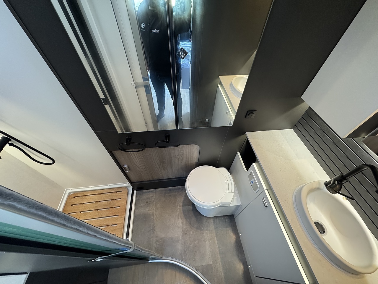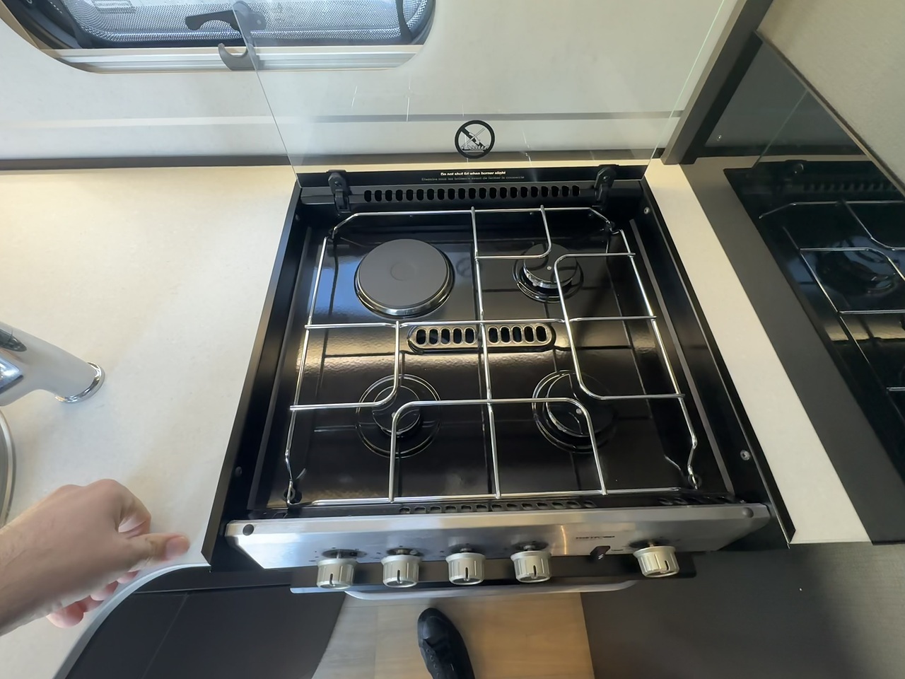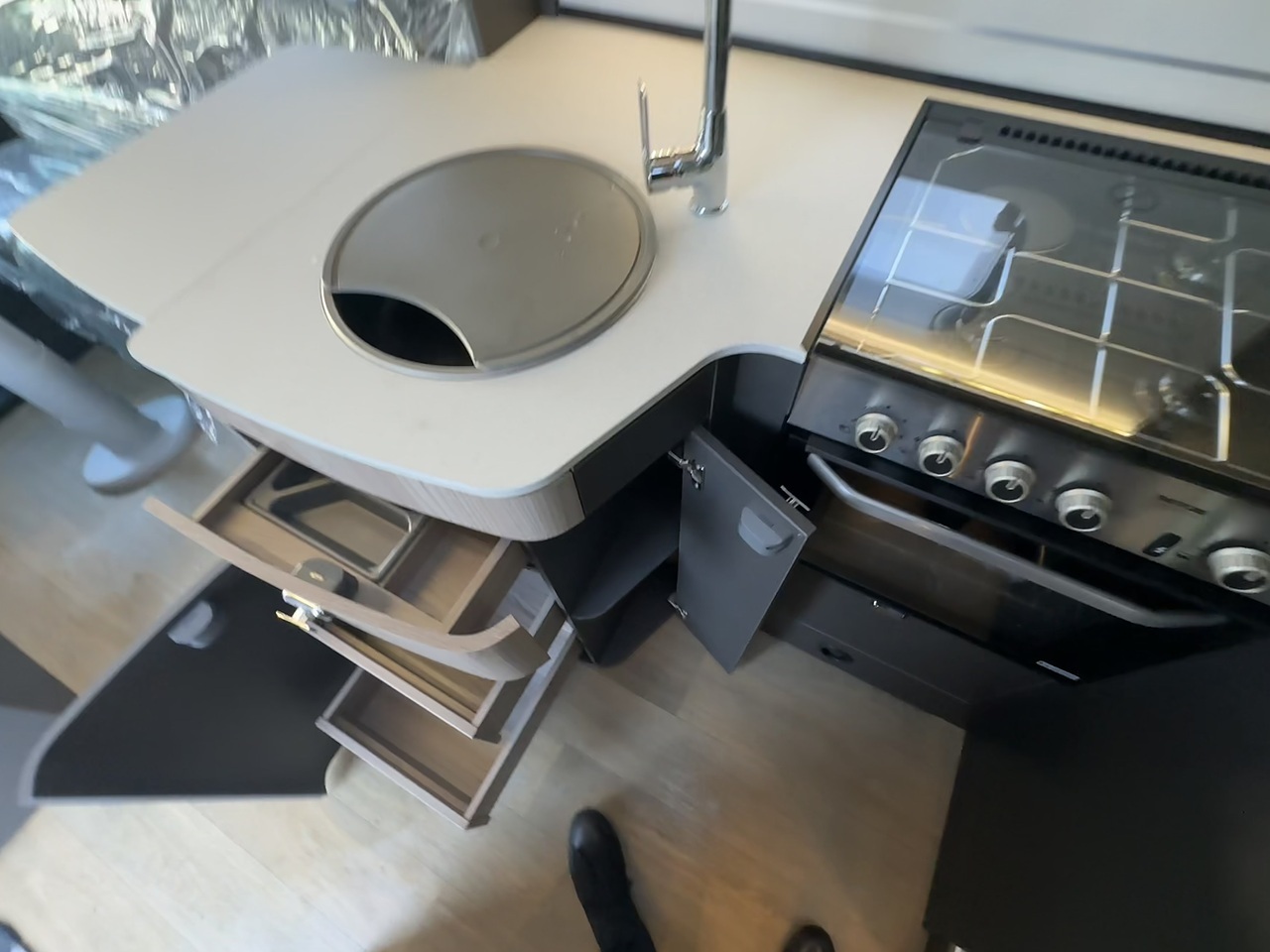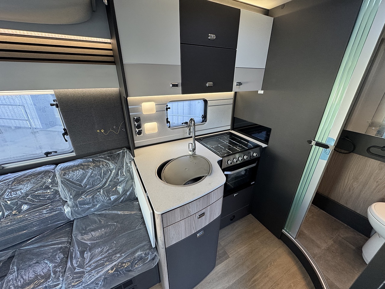 Moving into the middle of the vehicle, you’ll find the centrally positioned kitchen. Neatly laid out, it includes a hob, sink and fridge, along with useful worktop space and overhead storage. The kitchen is well placed to serve both the lounge and rear area without interrupting the flow of the interior.