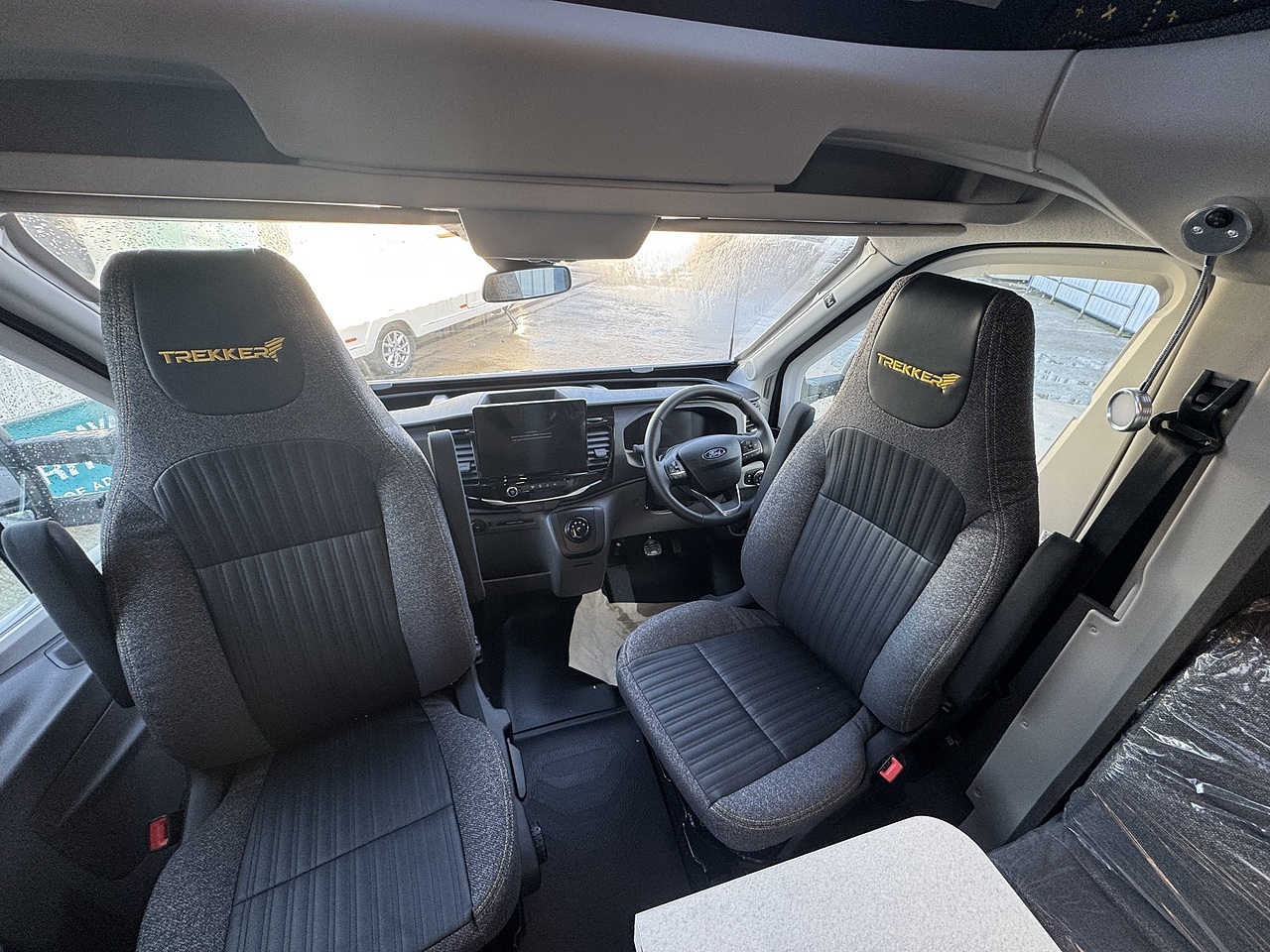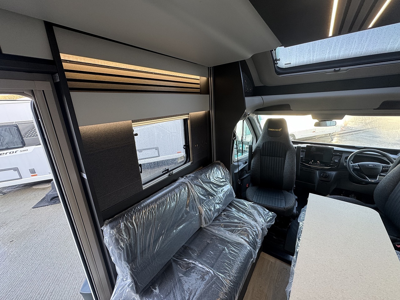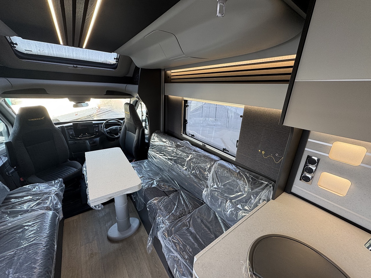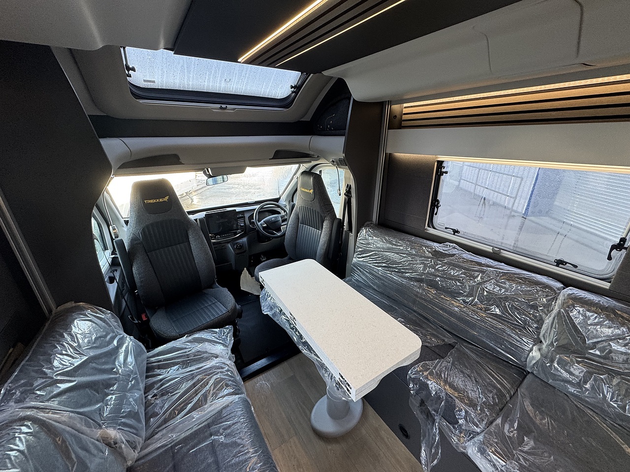 Starting at the front, the Trekker 540 features a bright and inviting lounge area. The driver and passenger captain’s seats swivel to face the living space, working with the two bench seats to create a comfortable and sociable front lounge. This area is ideal for relaxing or dining, with good natural light from the side windows giving it an open and airy feel.