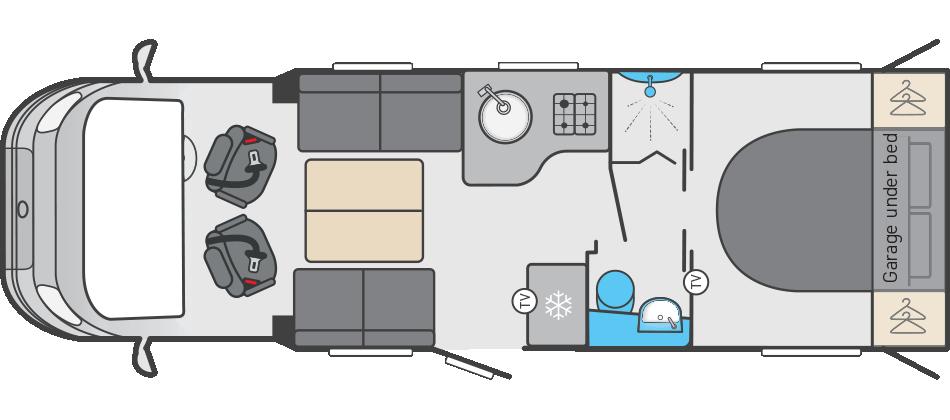 At the rear of the 594 you’ll find one of its key highlights, the electric drop down bed. This clever design provides a generous sleeping area at the touch of a button while maintaining excellent storage beneath, including access to a spacious rear garage. The layout makes the 594 ideal for couples who want flexibility without compromising on storage.
