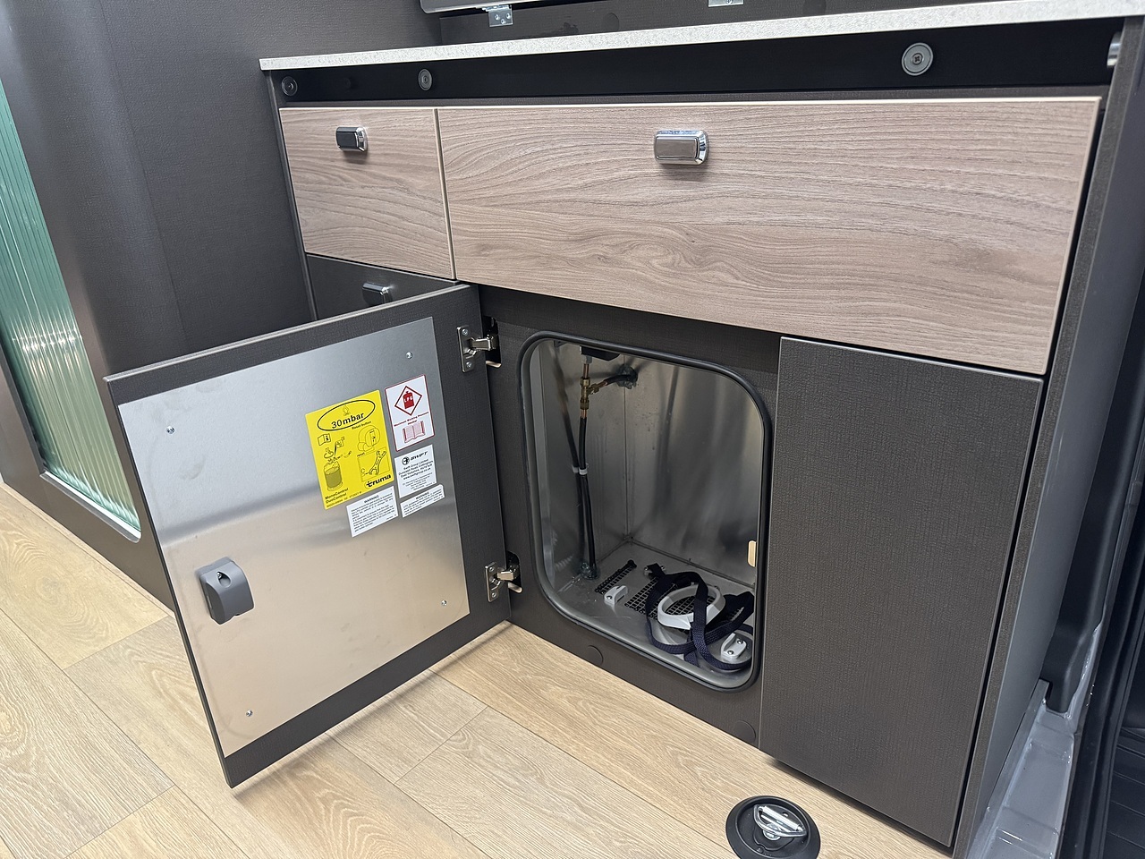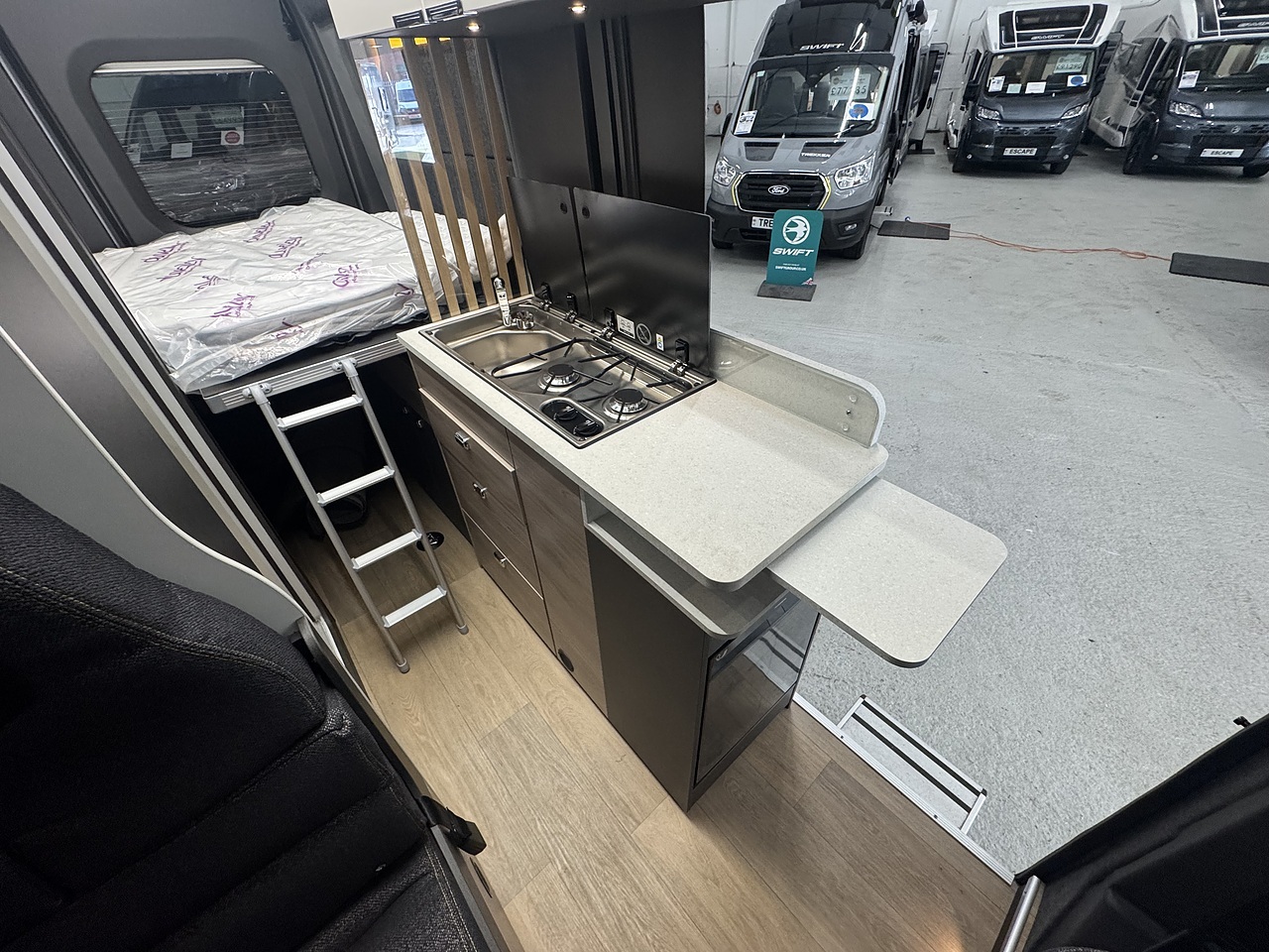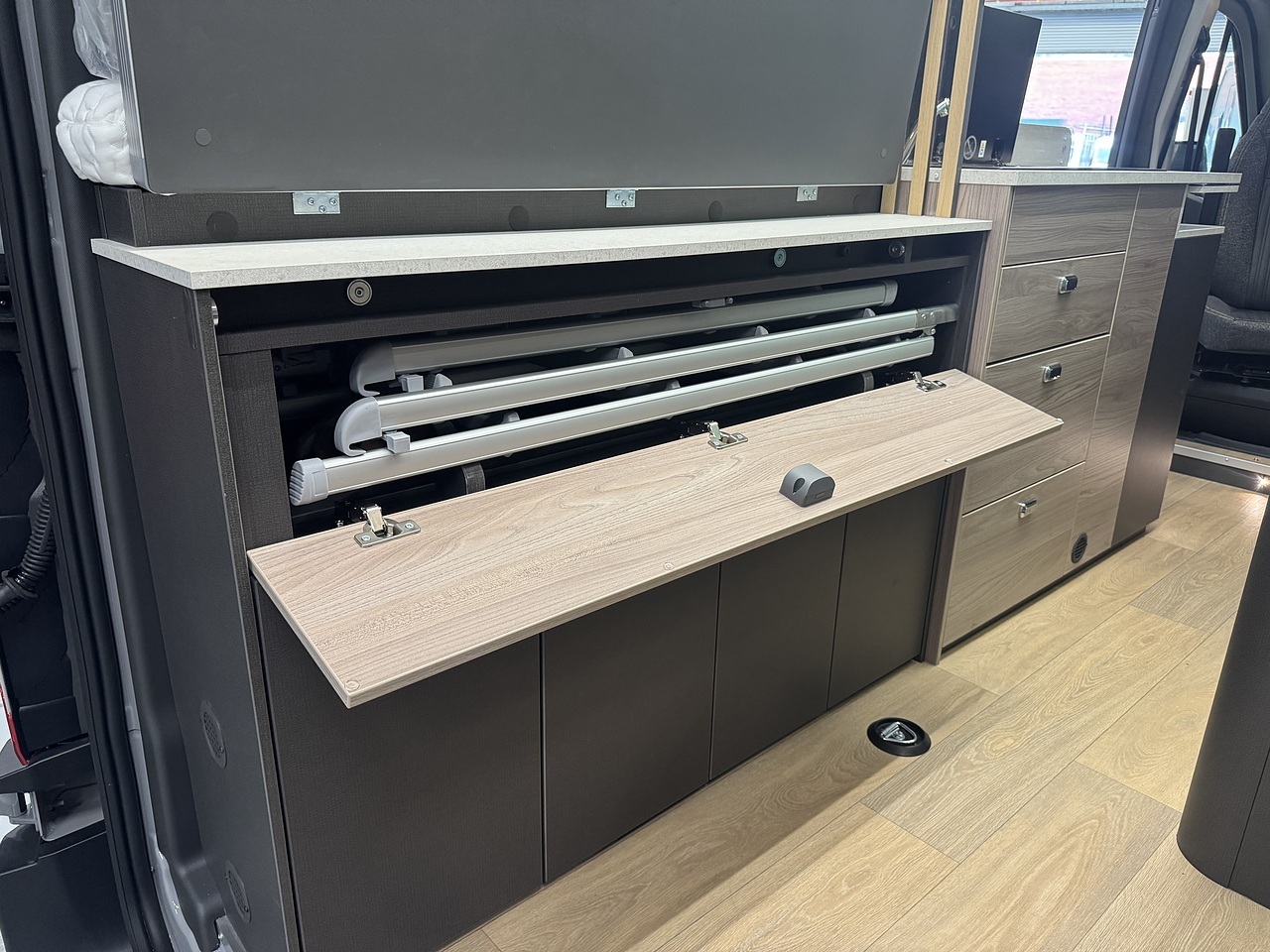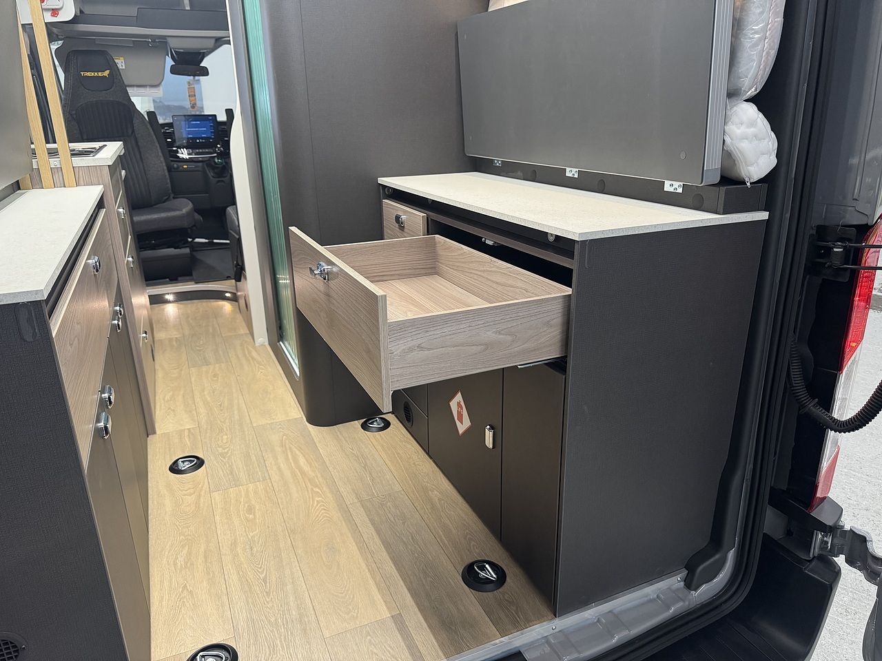 In the centre of the Trekker, you will find a well equipped kitchen that is perfectly designed for life on the road. It has a two burner gas hob, a compact sink, a compressor fridge and plenty of storage cupboards and drawers for all your essentials. There is also a fold out worktop extension.