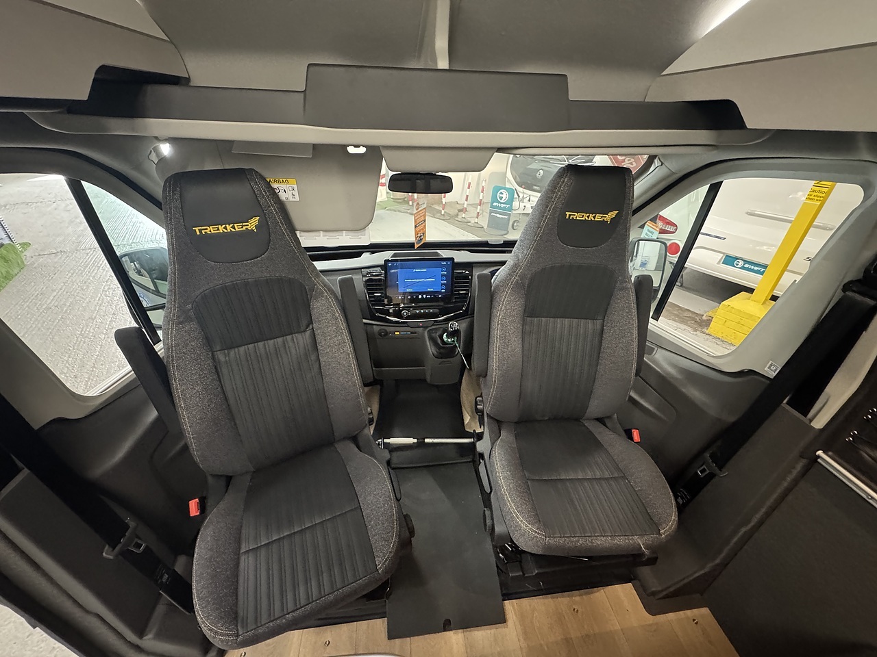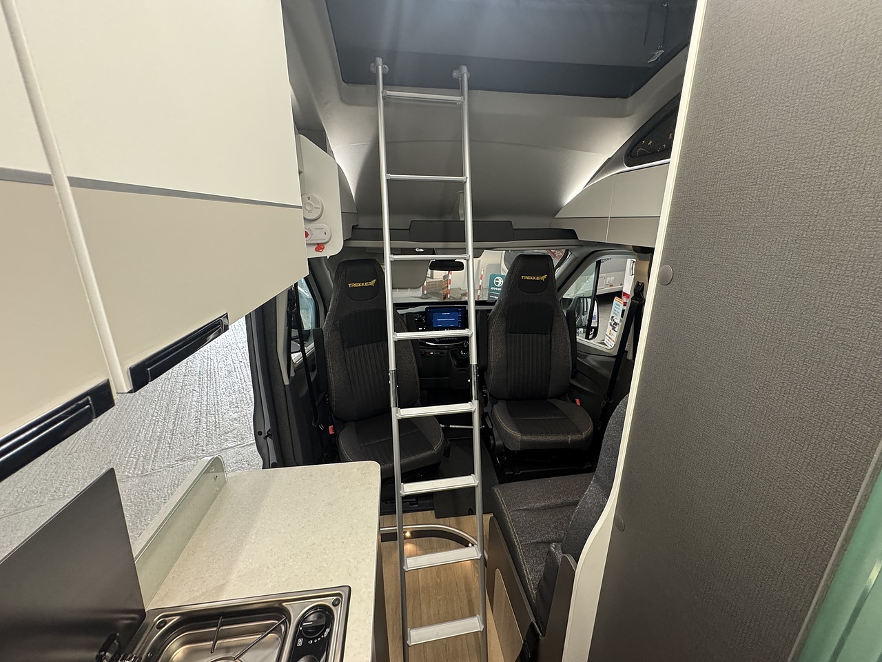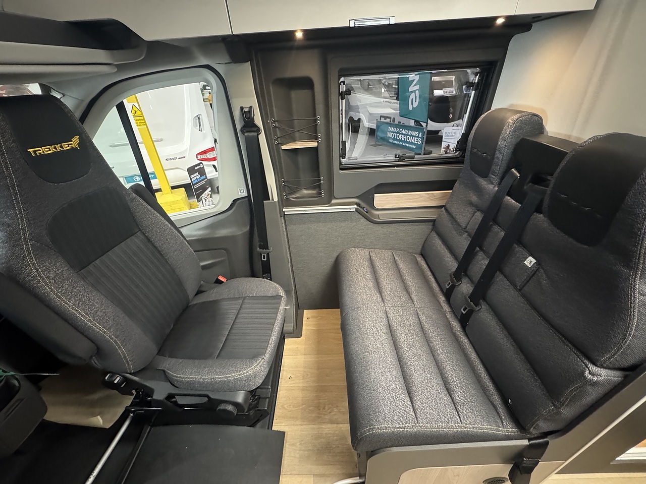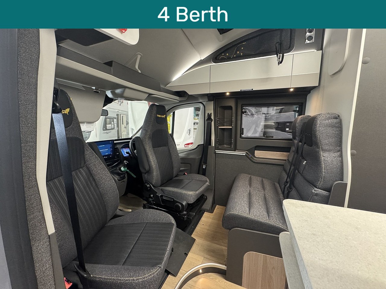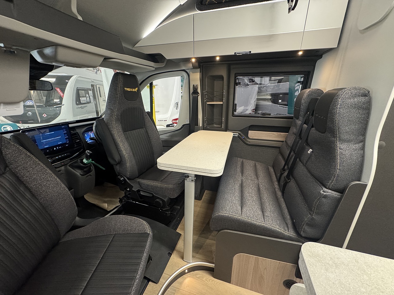 At the front of the Trekker, there is a bright and comfortable lounge area dinette area which makes excellent use of the swivel driver and passenger seats. These turn to face the habitation area, creating a welcoming space with large rooflight above fills the area with natural light, giving a bright and open feel.
